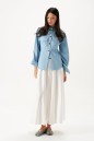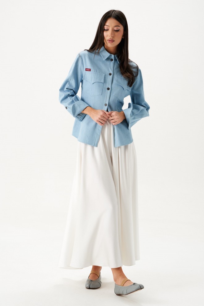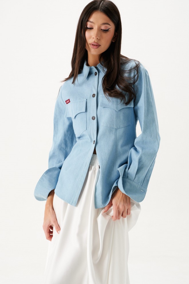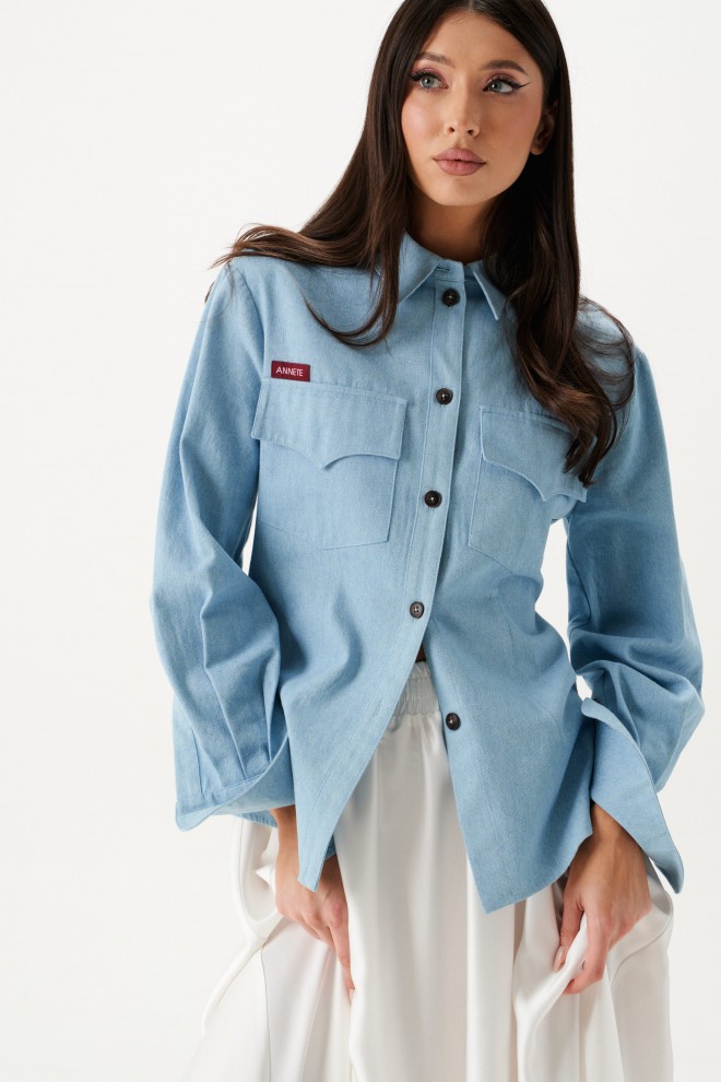 Блузка полуприлегающего силуэта, выполнена из из светло-голубого денима. Характеристики: отложной воротник-стойка, застежка центральная на петли пуговицы, карманы по передней части изделия с клапанами, над карманом нашивка "ANNETE". Талиевые вытачки по переду и спинке изделия. Втачной рукав, немного спущен, по низу рукава манжета на пуговицах, низ изделия с плавным срезом. Длина по спинке 63 см, длина рукава 60 см.