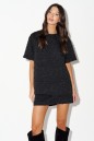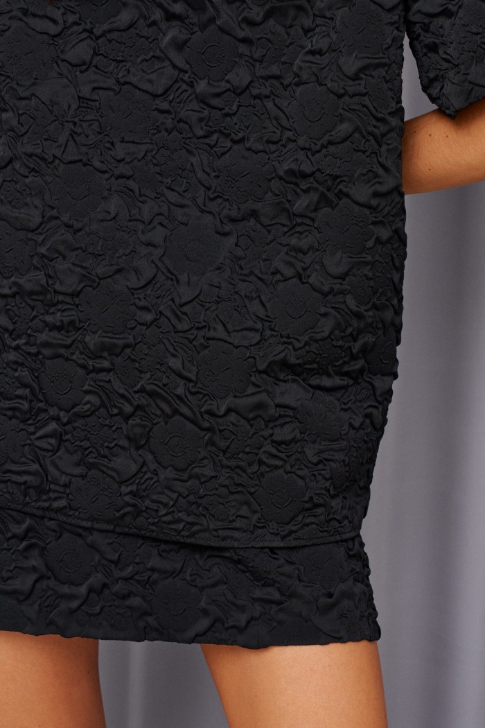 Блуза прямого свободного кроя. Выполнена из фактурной ткани чёрного цвета с тиснением. Кргулая горловина. Рукав втачной, немного спущен. Застёжка потайная молния в среднем шве заднего полотна. Ддлина спинки 67 см, длина рукава 23 см