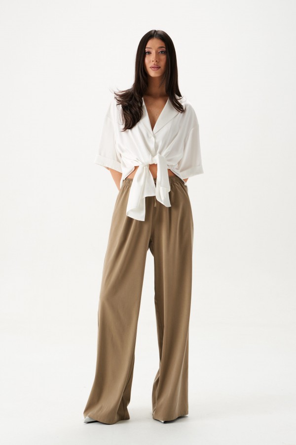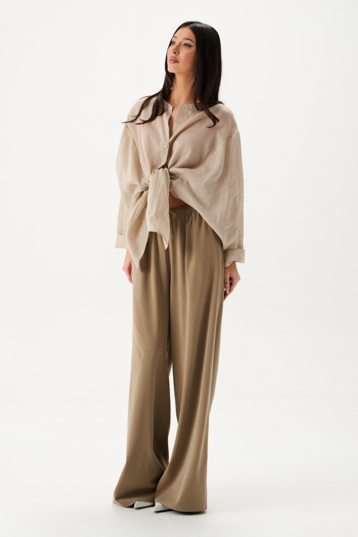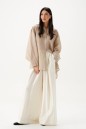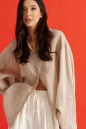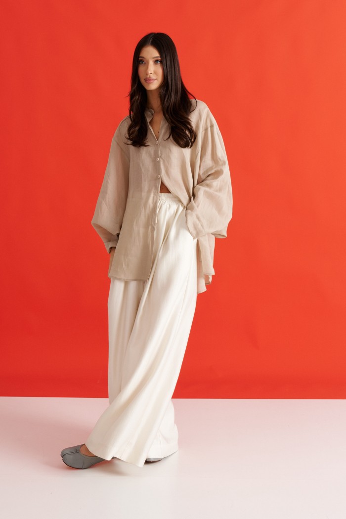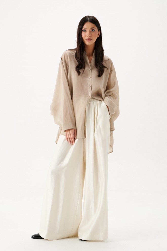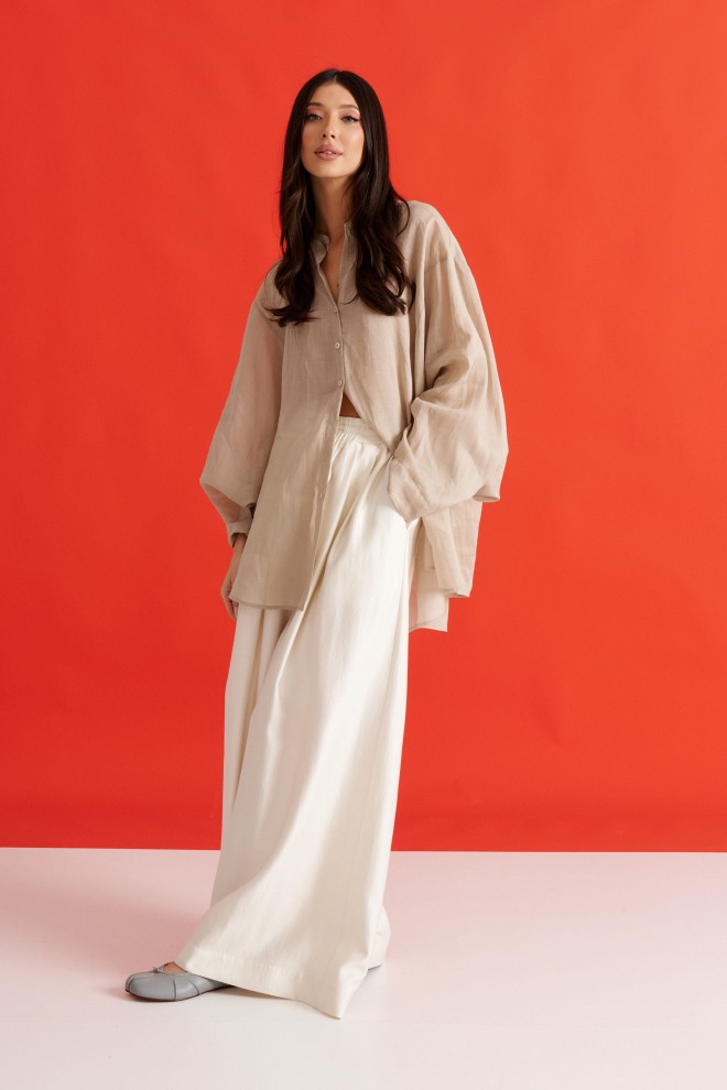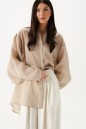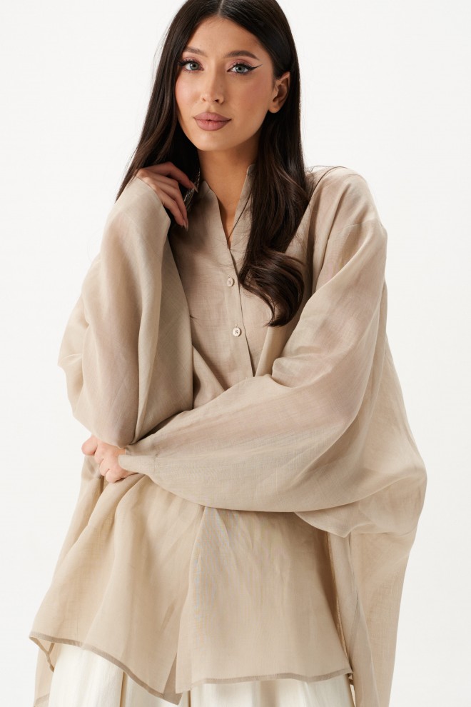 Рубашка свободного кроя выполнена из натурального полотна бежевого цвета. Характеристики: рубашка прямого свободного кроя, горловина стойка. Застежка центральная на петли пуговицы, рукав акцентный объёмный, крой рукава «летучая мышь» , спинка отрезная с декоративной сборкой. Длина по спинке 80 см, длина рукава от горловины 76 см.