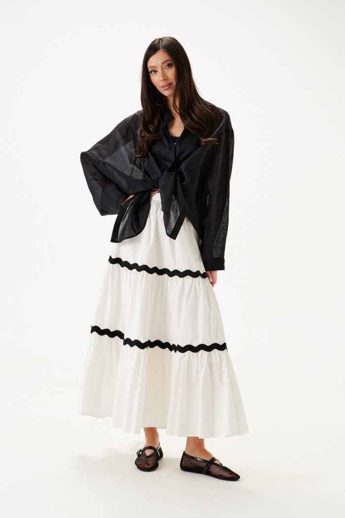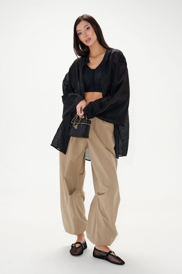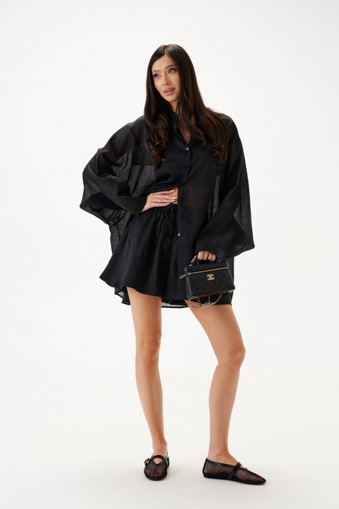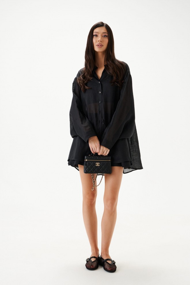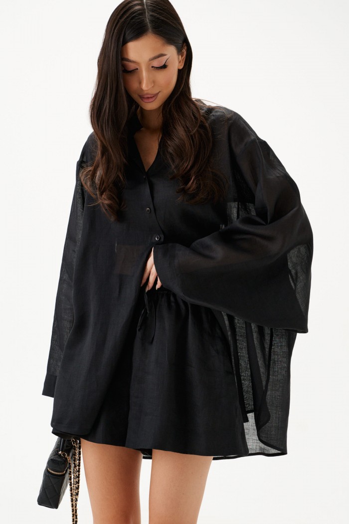 Рубашка свободного кроя выполнена из натурального полотна. Характеристики: рубашка прямого свободного кроя, горловина стойка. Застежка центральная на петли пуговицы, рукав акцентный объёмный, крой рукава «летучая мышь» , спинка отрезная с декоративной сборкой. Длина по спинке 80 см, длина рукава от горловины 76 см.