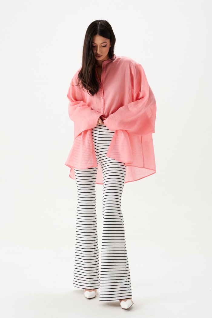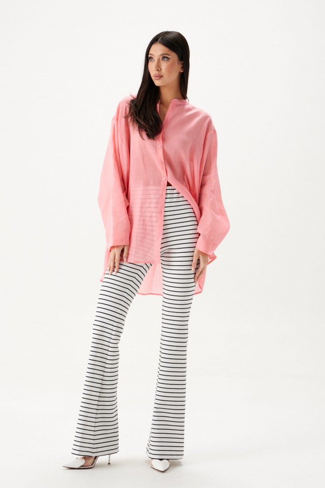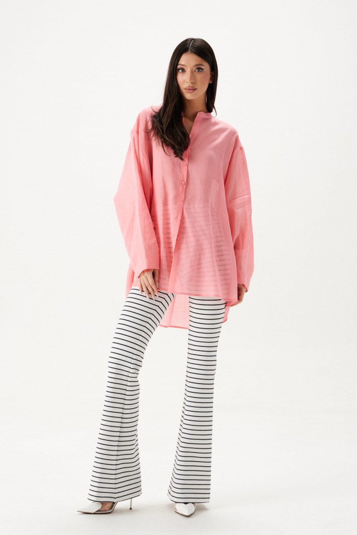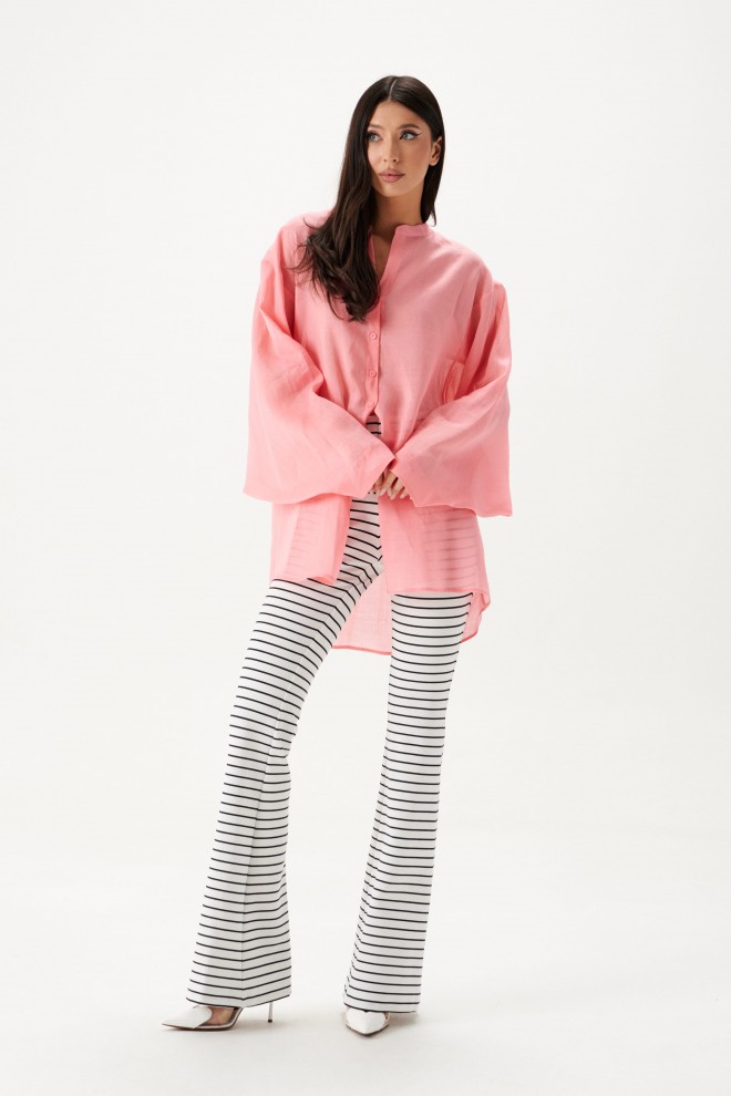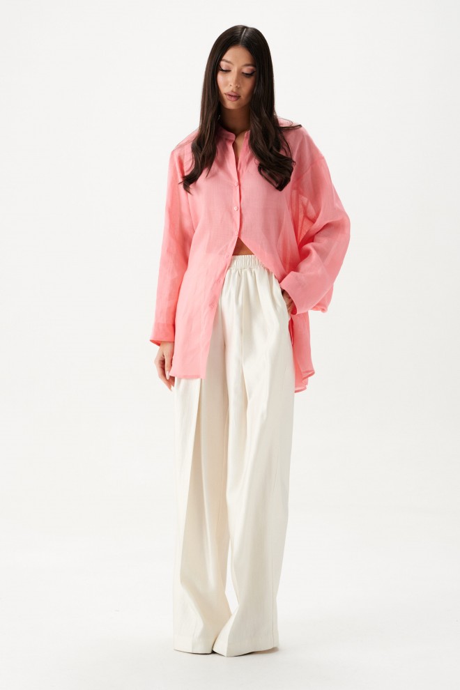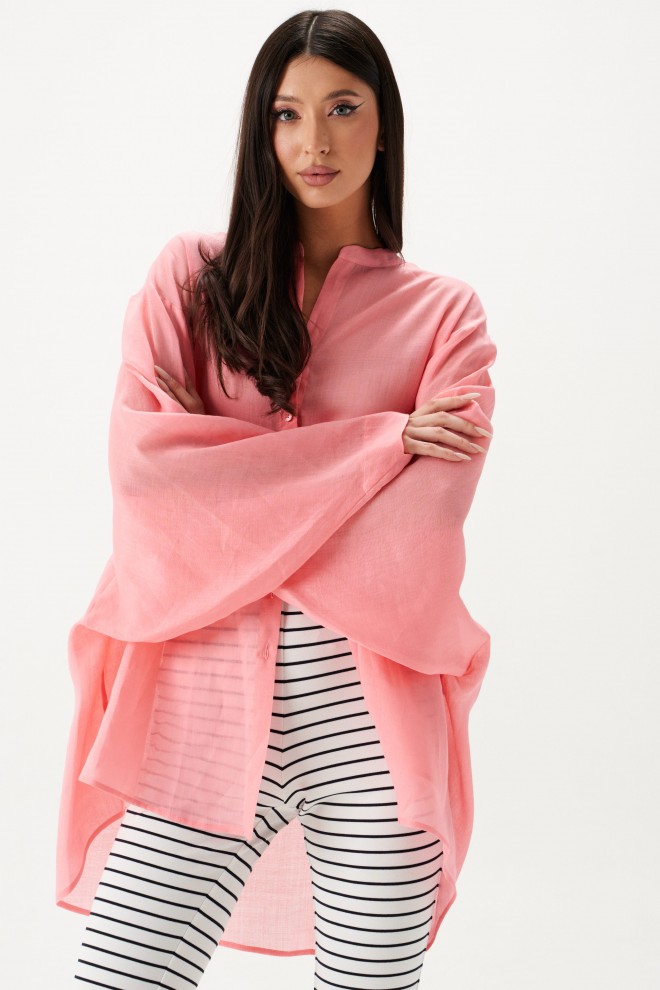 Рубашка свободного кроя выполнена из натурального полотна розового цвета. Характеристики: рубашка прямого свободного кроя, горловина стойка. Застежка центральная на петли пуговицы, рукав акцентный объёмный, крой рукава «летучая мышь» , спинка отрезная с декоративной сборкой. Длина по спинке 80 см, длина рукава от горловины 76 см.
