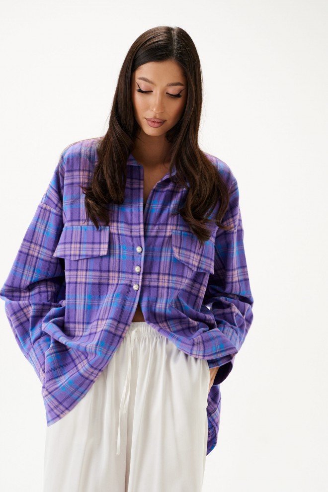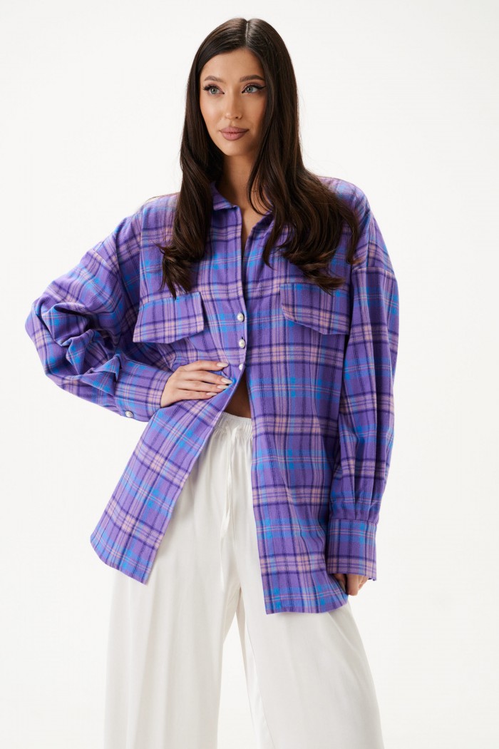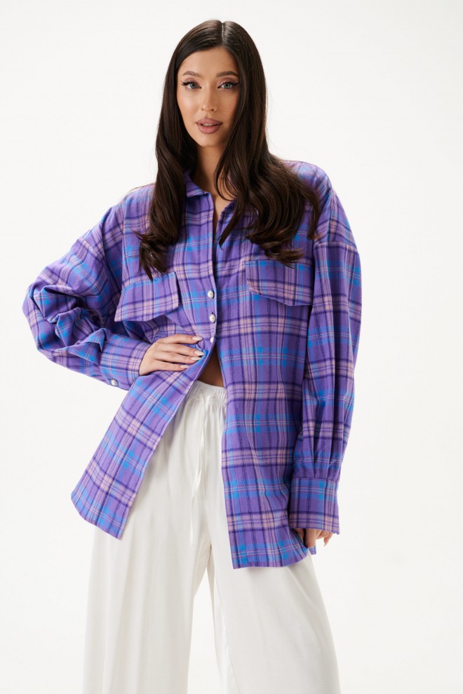 Рубашка прямого свободного кроя. Выполнена из мягкого плотного хлопкового полотна. Воротник отложной. Рукав втачной, немного спущен, с широкой манжетой с пуговицей. По переду в области груди имитация клапанов карманов. Спинка отрезная. Застёжка центральная на путли-пуговицы. Длина спинки 75 см, длина рукава 52 см