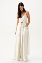 Блузон длины макси выполнен из ткани молочного цвета. Силуэт свободный. Бретели регулируемые. Лиф отрезной фигурный, двойной, по бокам выточки. Без подкладки. Застёгивается от груди на ряд пуговиц. Длина по спинке 112 см.