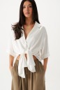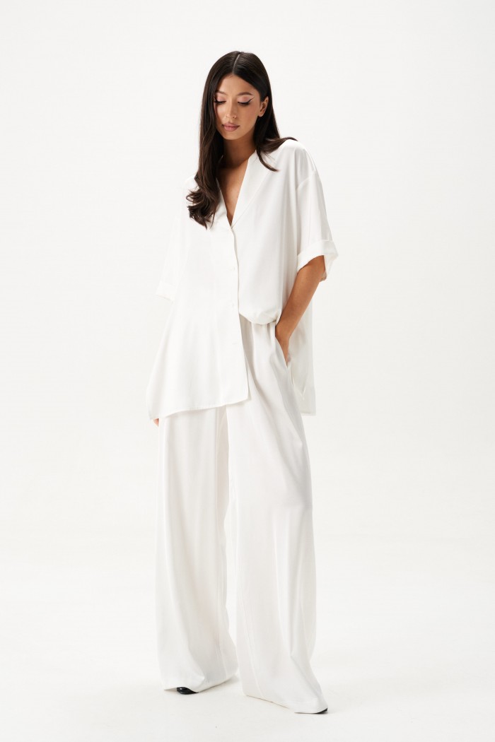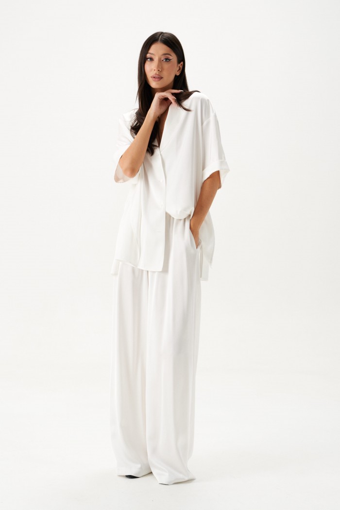 Блузка прямого свободного кроя выполнена из текстильной ткани белого цвета. Характеристики: отложной воротник, застежка центральная на петли пуговицы, спущенная линия плеча, по бокам изделия разрезы 31см, рукав кароткий прямого кроя. Длина рубашки 75 см, длина рукава от края горловины 44см.