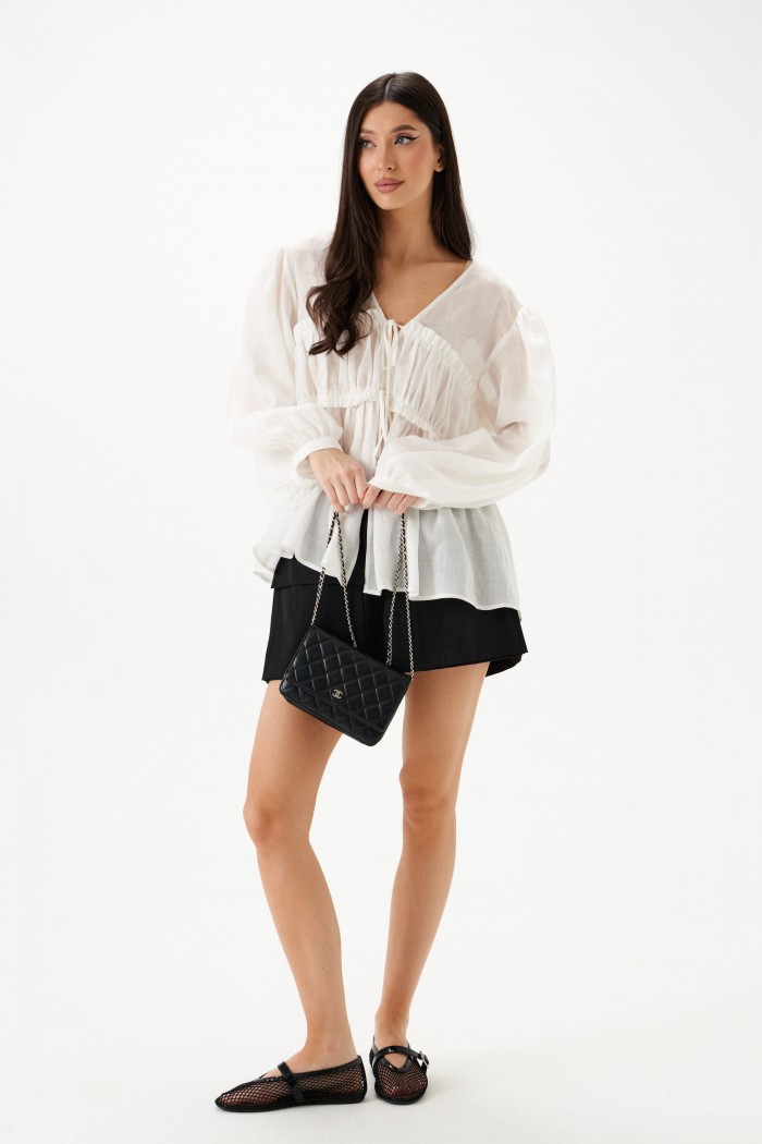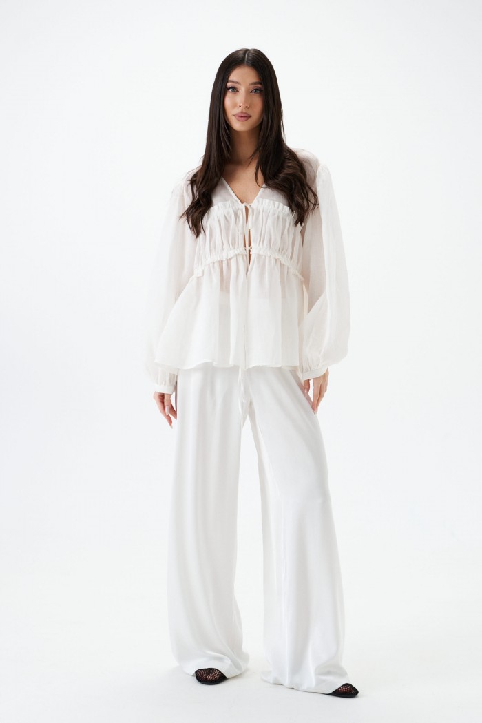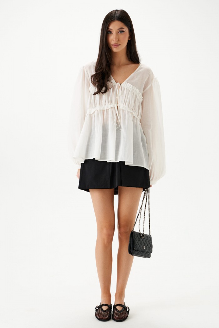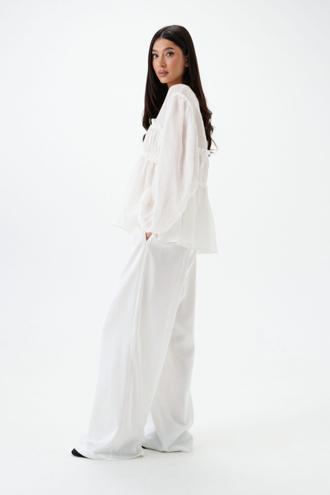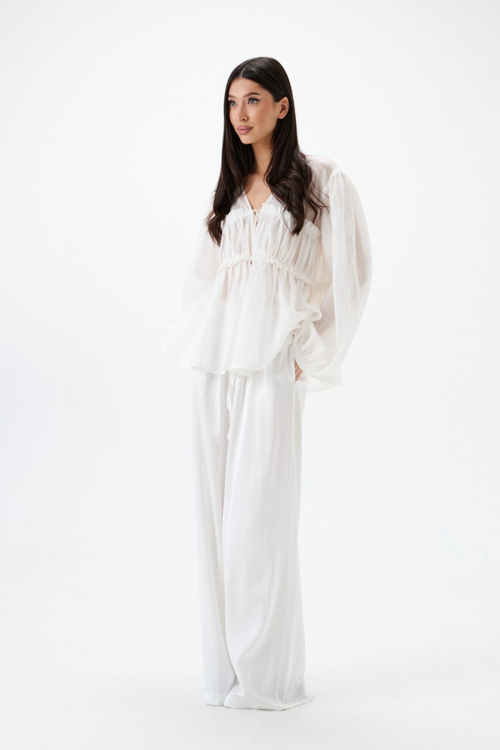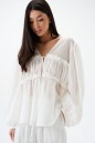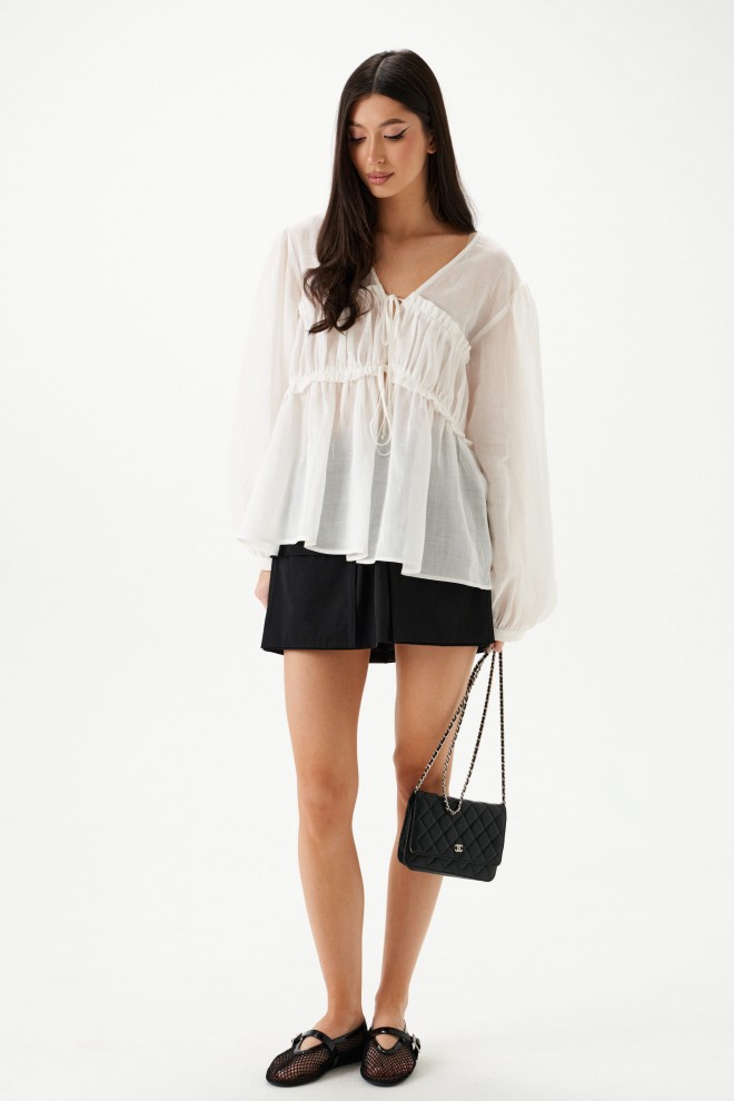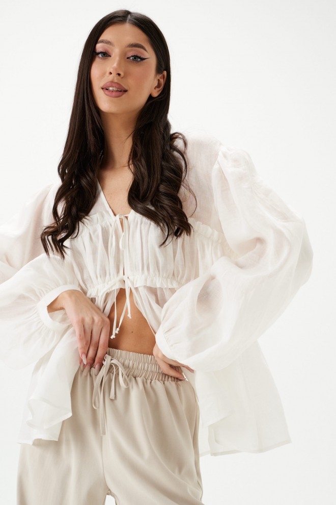 Блузка свободного кроя, выполнена из полупаразрачного полотна белого цвета. Прмой свободный крой, рукав широкий вточной, низ присборен на фигурную узкую манжету, V-образный вырез, лиф отрезной по лини талии, застежка центральная на шнурки-завязки. Длина по спинке 62см, длина рукава 61см.