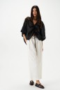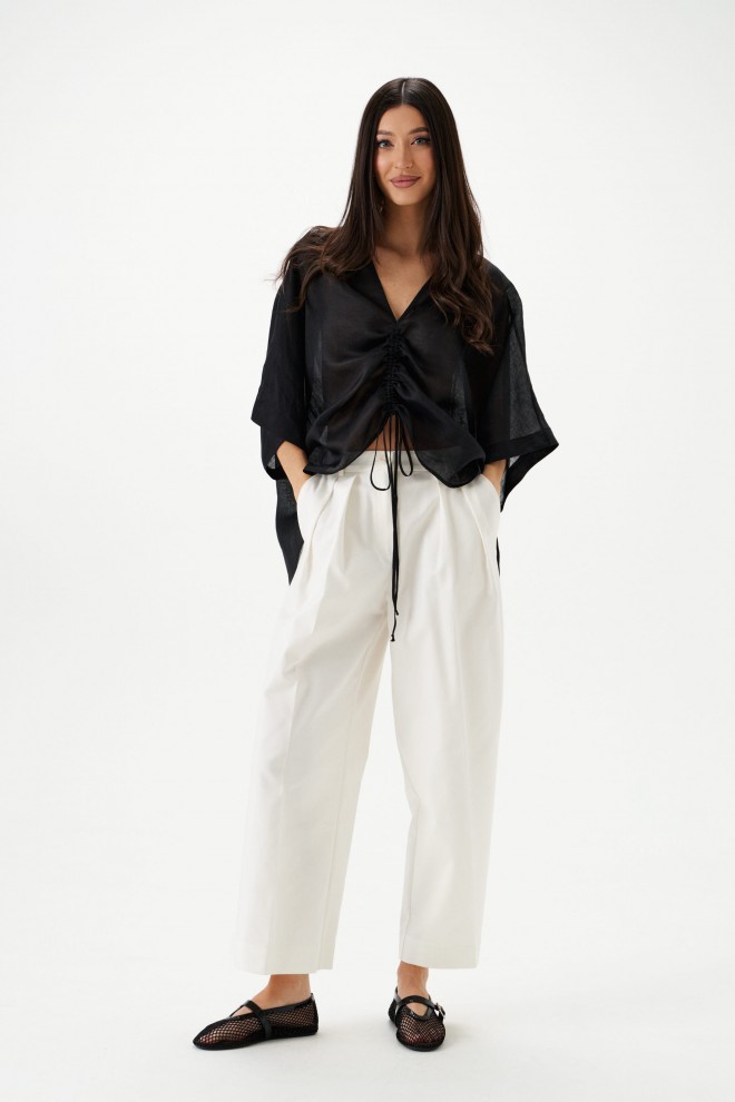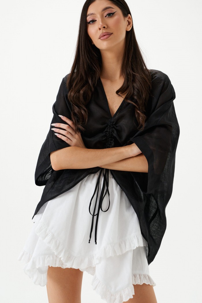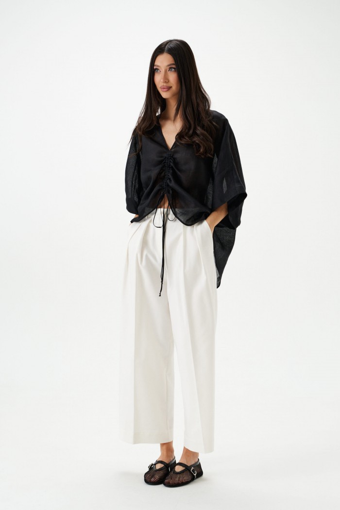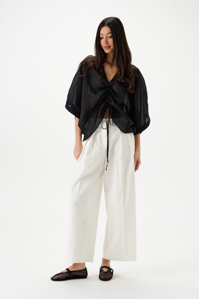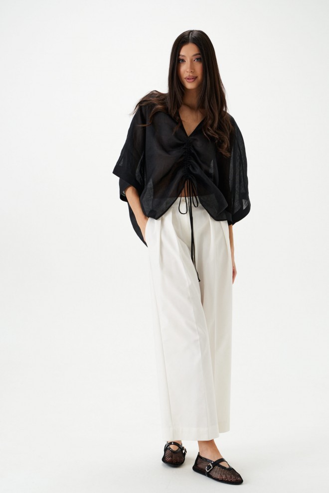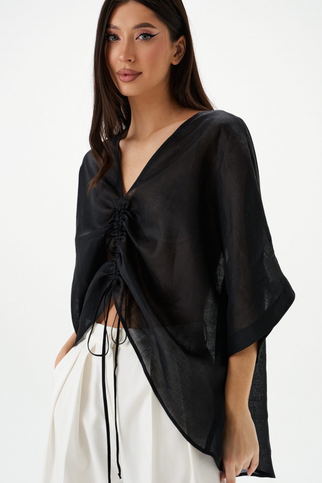 Блуза свободного кроя. Выполнена из лёгкого натурального полотна – рами. Вырез горловины V-образный. По переду регулируемая кулиска. Рукав цельнокроеный. Длина рукава от горловины 46 см. Длина спинки 72 см