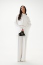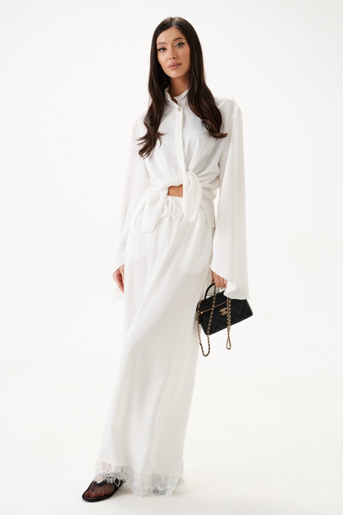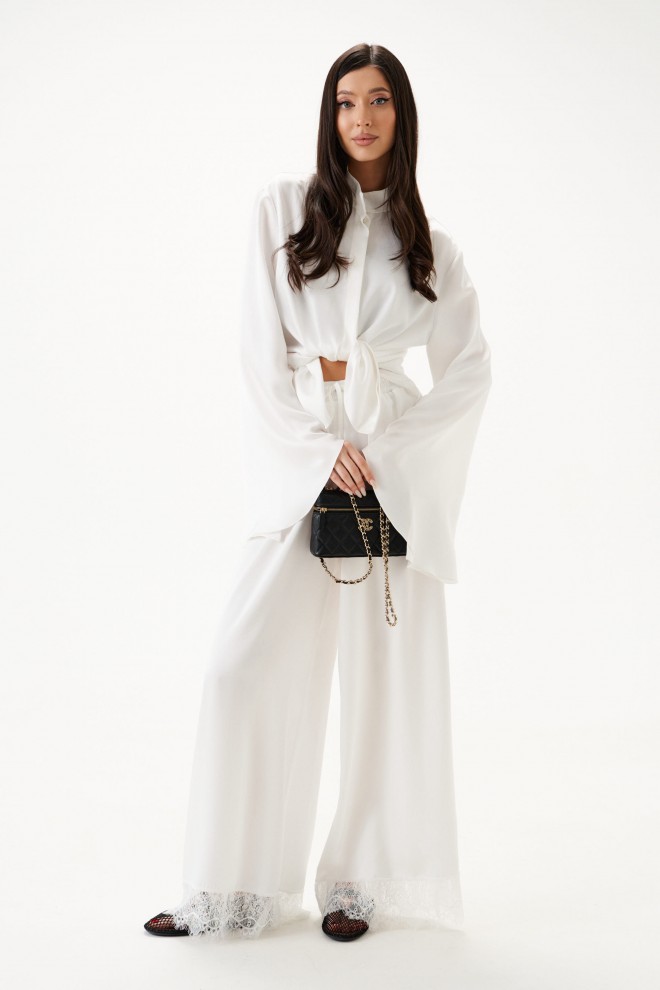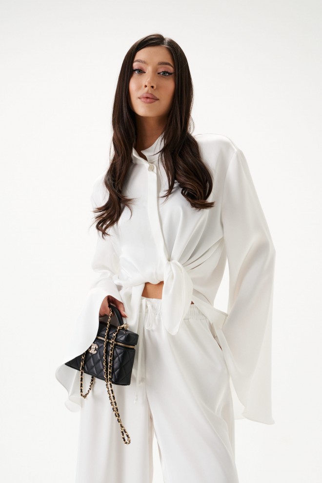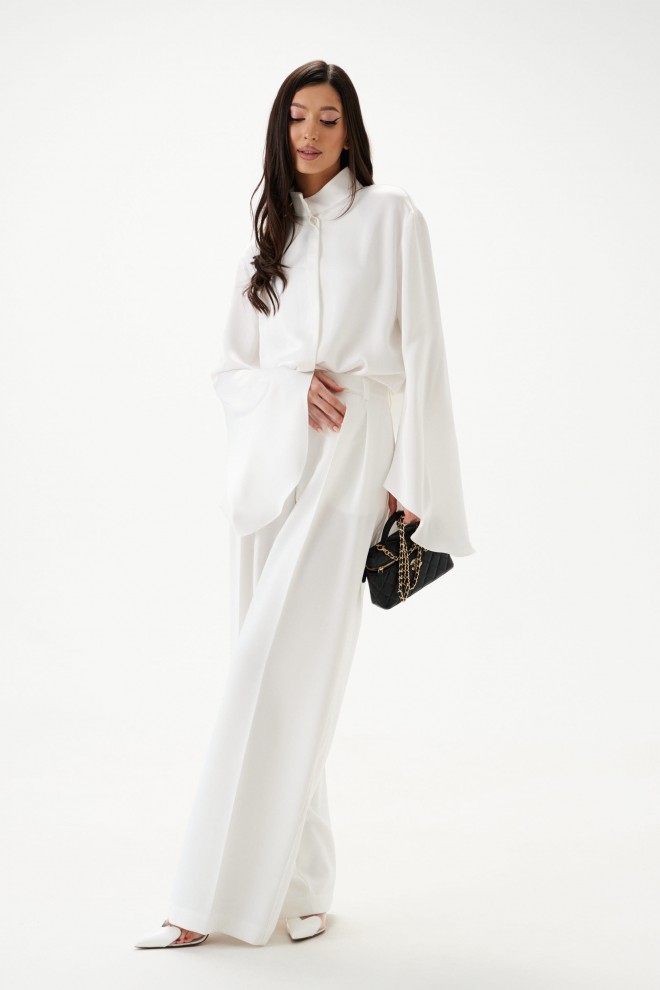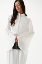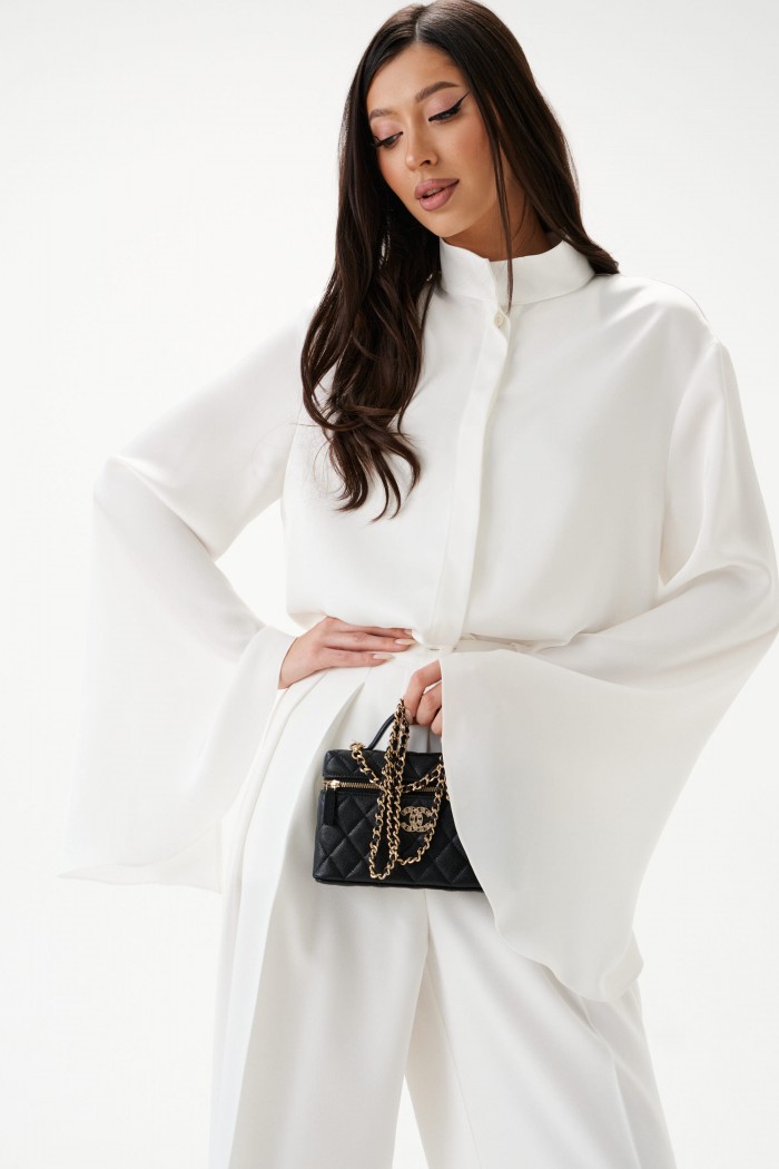 Рубашка прямого кроя. Выполнена из мягкой струящейся ткани. Воротник стойка. Застёжка скрытая центральная пуговицы. Рукав втачной, низ рукава с расклешением, фигурный, заканчивается разрезом. Длина рукава 71 см. Длина спинки 65 см