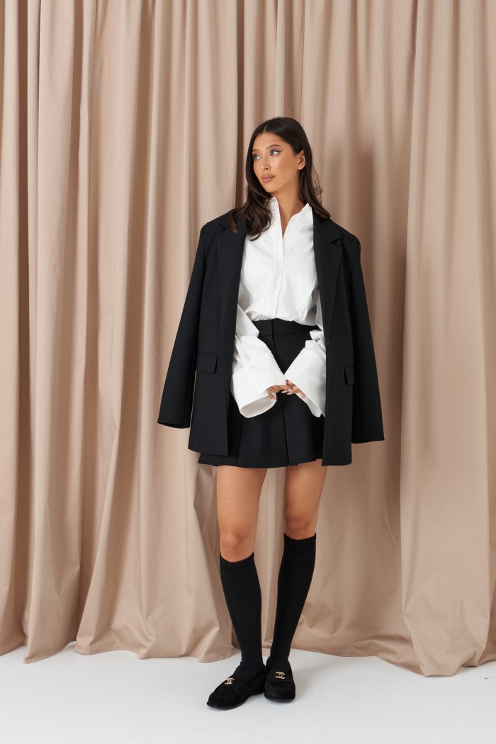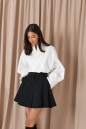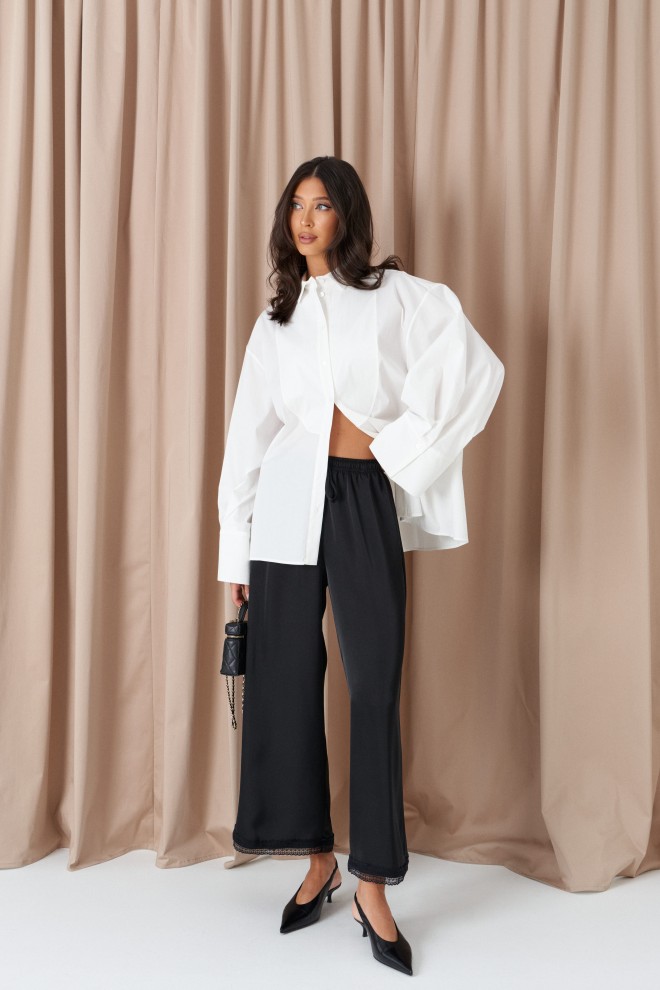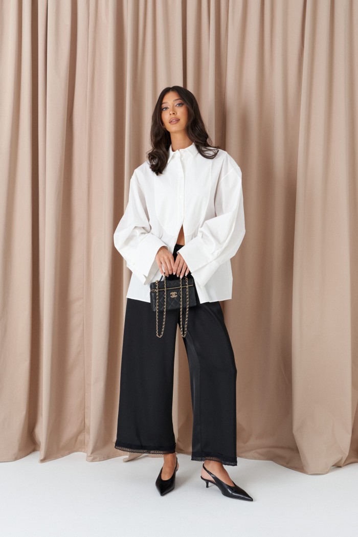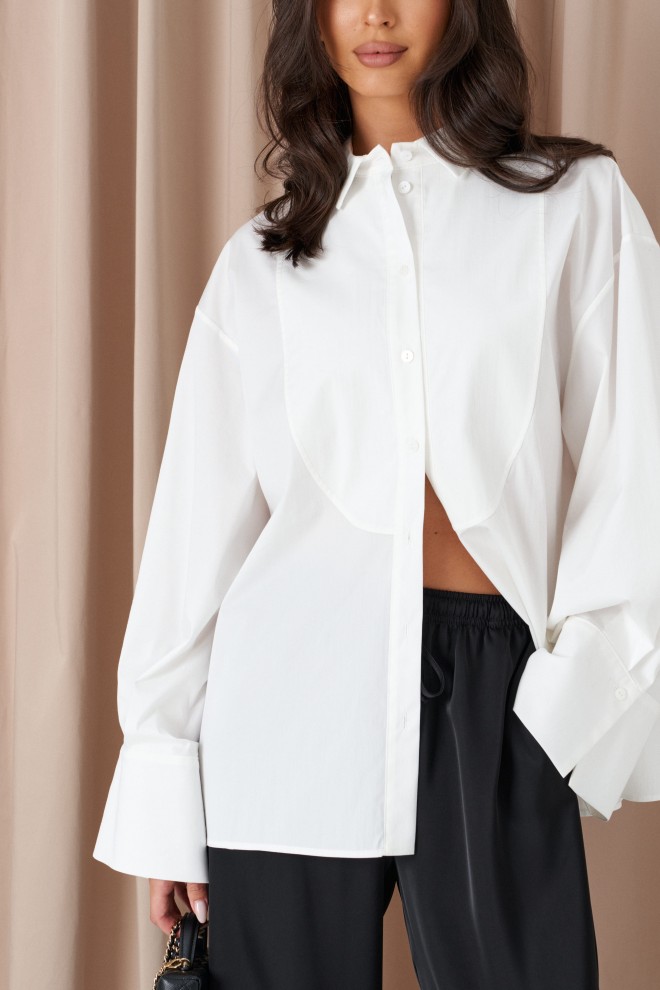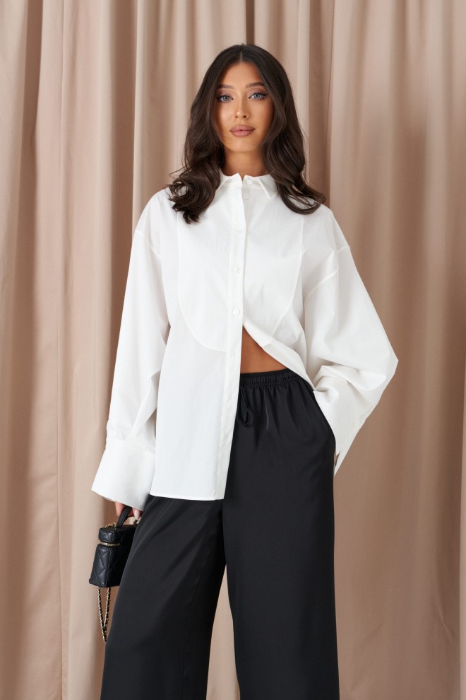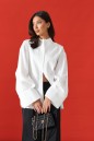 Рубашка прямого кроя, выполнена из ткани белого цвета. Характеристика: свободный крой, отложной воротник, центральная застежка на пуговицы, по переду фигурная кокетка, рукав втачной, со спущенной линией плеча, с широкой манжетой, на мажете пугвица, отрезная спинка с кокеткой. Длина рукава открая горловин 78см. Длина по спинке 70 см