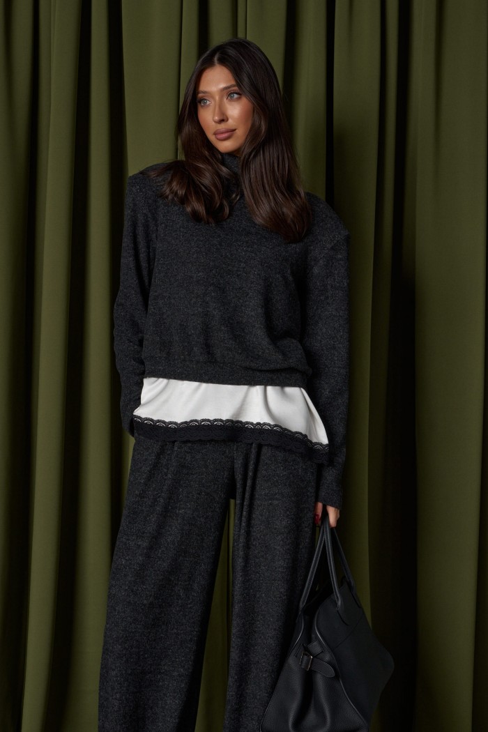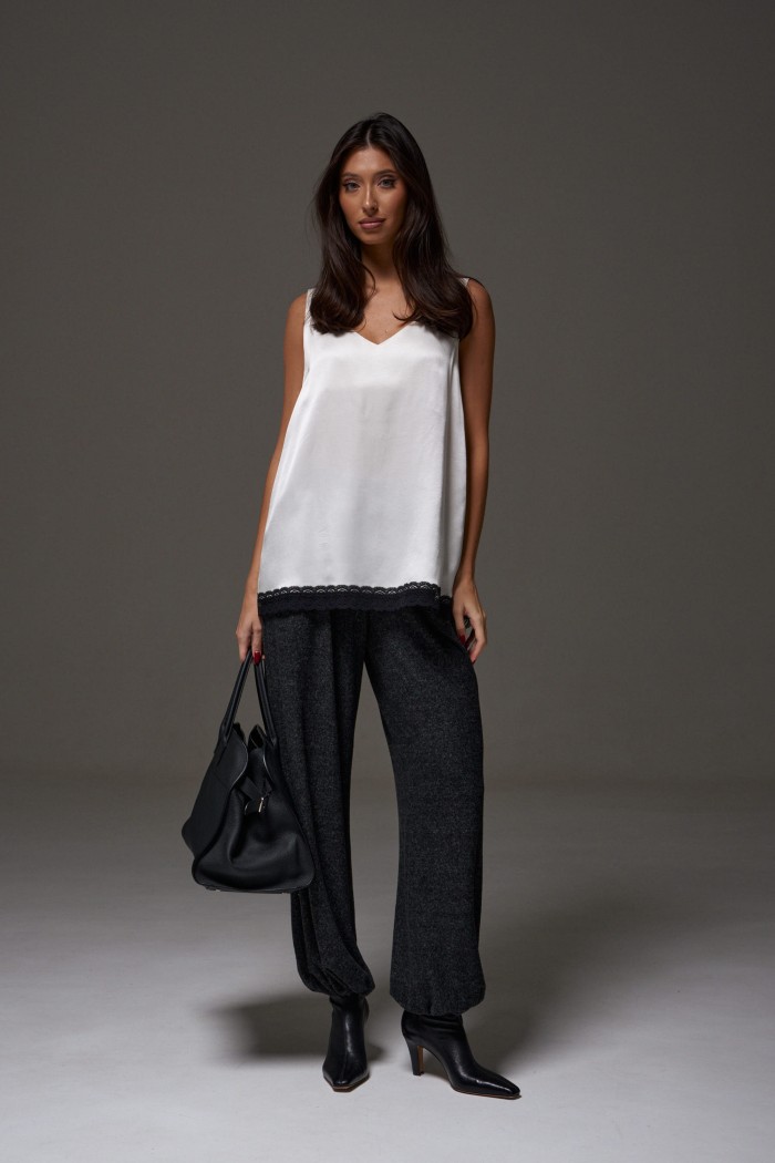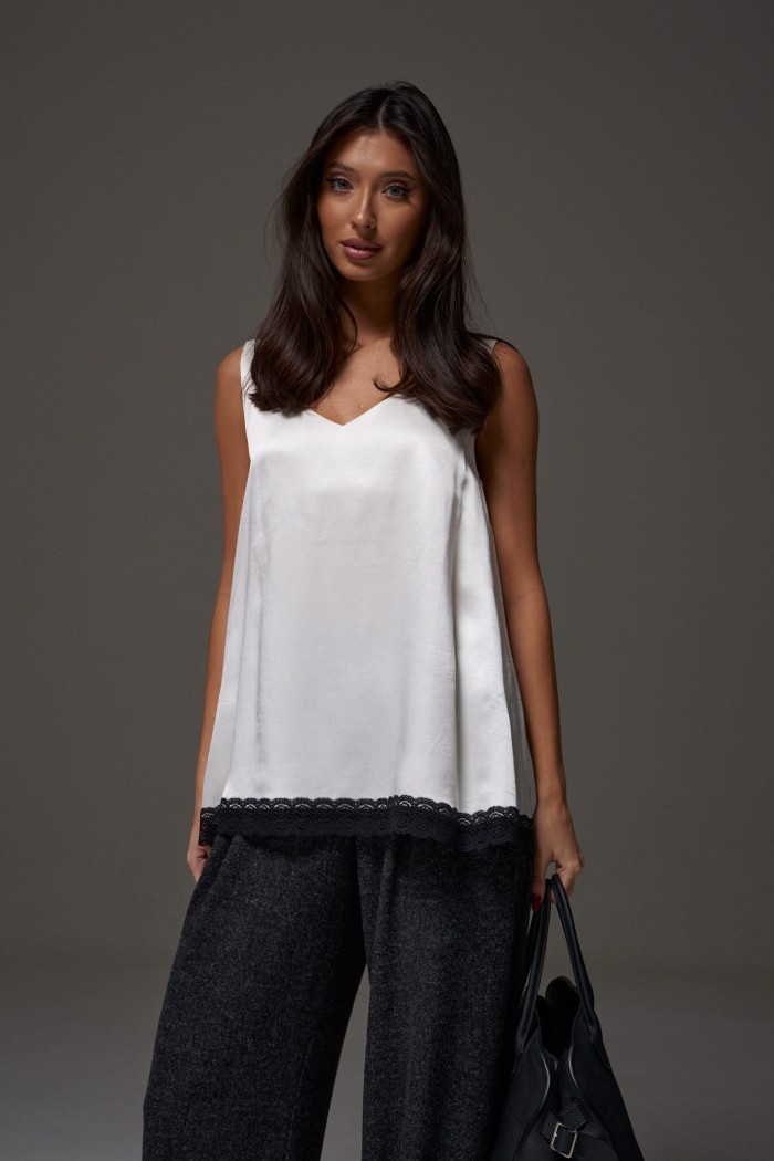 Блузон в крое трапеция, выполнен из струящейся ткани молочного цвета. Характеристика: крой трапеция - расширяется к низу, широкие бретели, спереди v-образный вырез, по спинке овальная горловины, спинка изделия чуть удлиненна, по низу изделия черное кружево. Длина изделия по центру спинки 64см ( с учетом кружева).