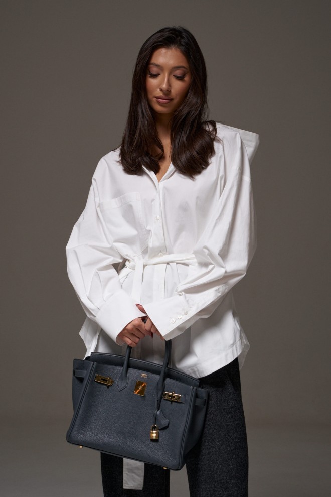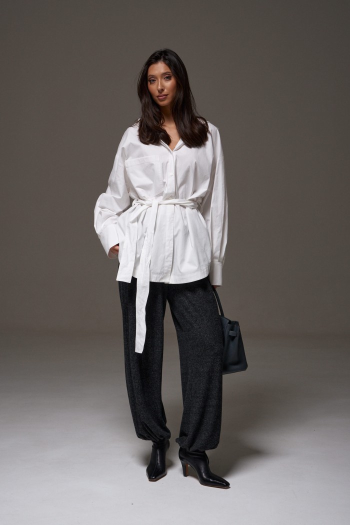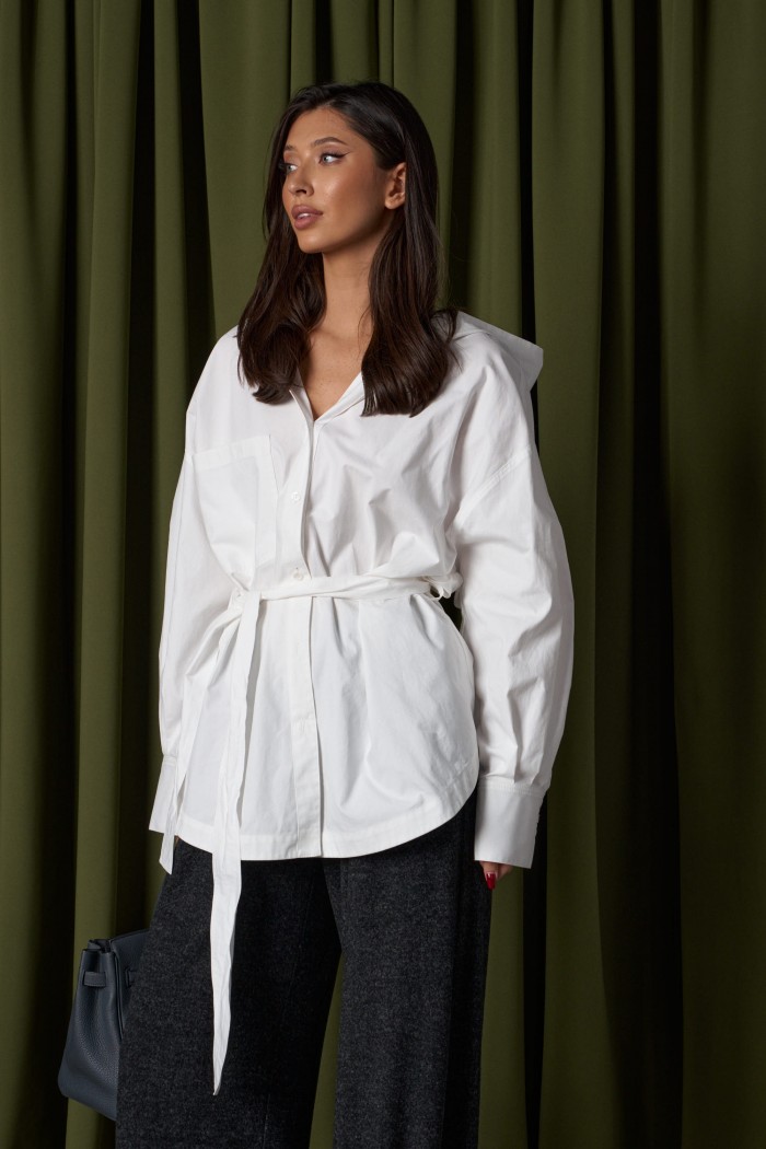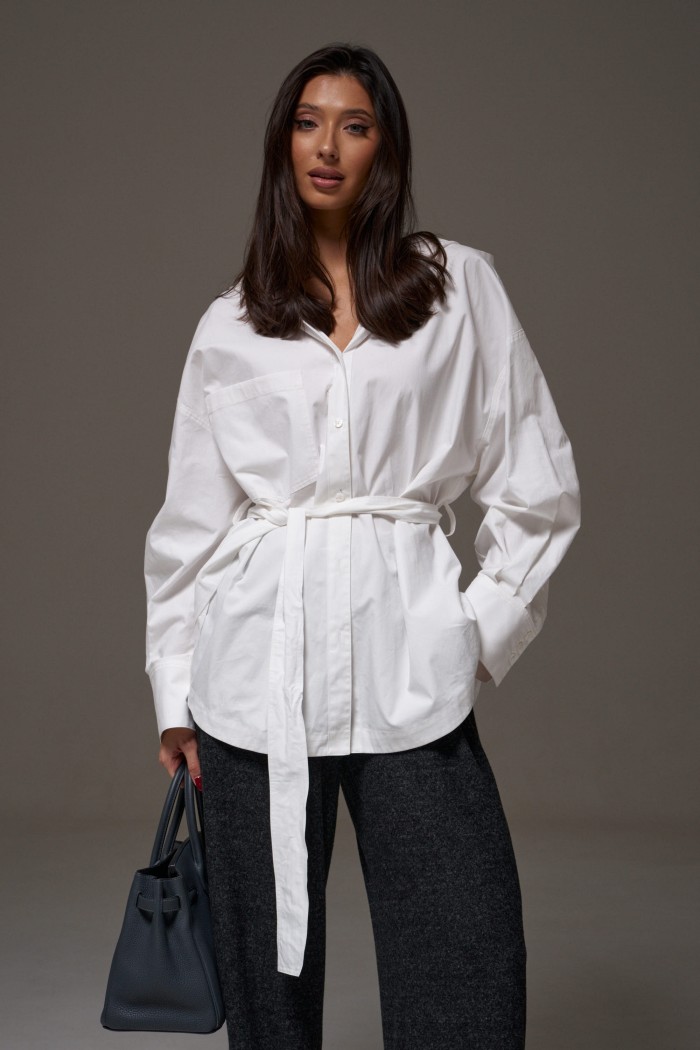 Рубашка прямого свободного кроя. Выполнена из хлопокового плотного полотна. Характеристики: прямой свободный крой, рукав спущеный, по линии талии шлевки, пояс в комплекте. Застёжка центральная на пуговицы, по переду изделия один накладной карман. Над манжетом защипы, манжет широкий, застёгивается на три пуговицы. Длина по спинке 75 см, длина рукава от края горловины 77 см.