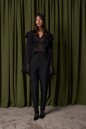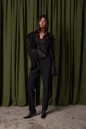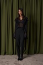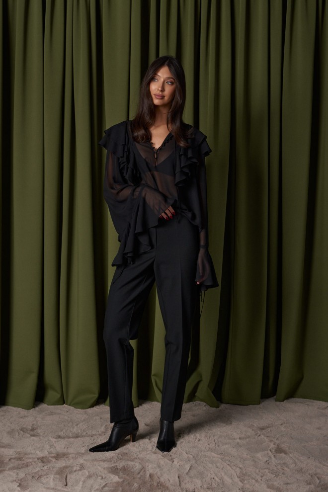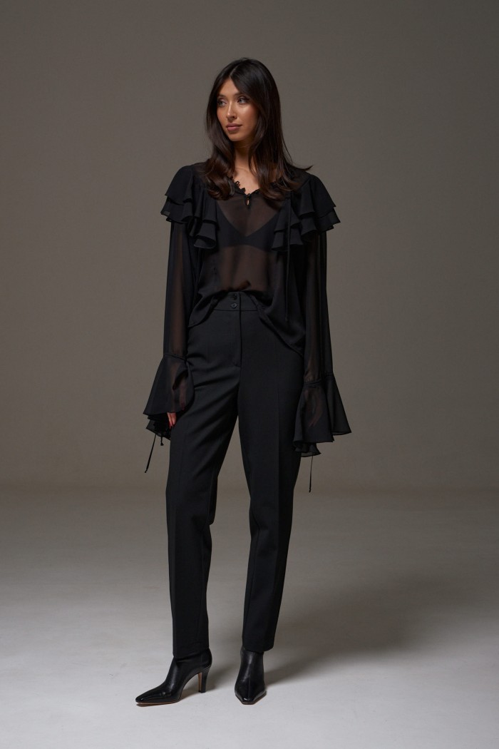 Блужка свободного кроя, выполнена из легкой, прозрачной ткани черного цвета. Характеристика: прямой крой, воротник стойка, застежка на петли пуговицы и шнурки-завязки. Рюша нашита по переду и на спинке изделия. Рукав втачной свободного кроя, по низу пришита рюша, которая фиксируется шурками-завязками. Длина спинки 60см, длина рукава от края горловины 77см.