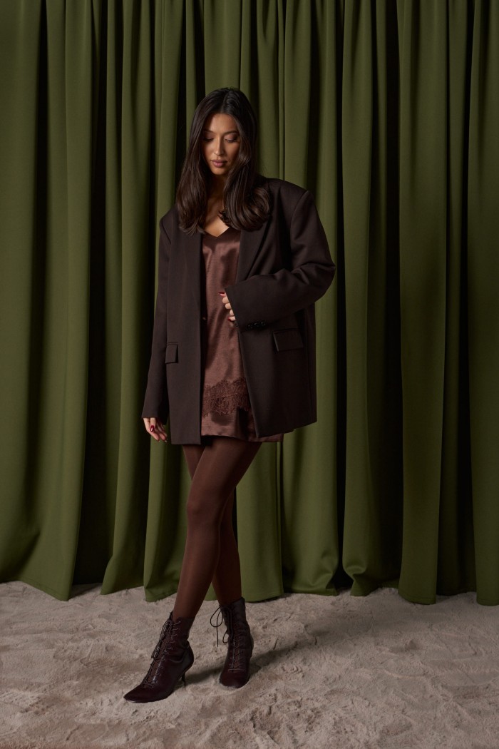Блузон в крое трапеция, выполнен из струящейся ткани коричневого цвета. Характеристика: крой трапеция - расширяется к низу, широкие бретели, спереди v-образный вырез, по спинке овальная горловина, спинка изделия чуть удлинена, по низу изделия пришито кружево. Длина изделия по центру спинки 66 см ( с учетом кружева).