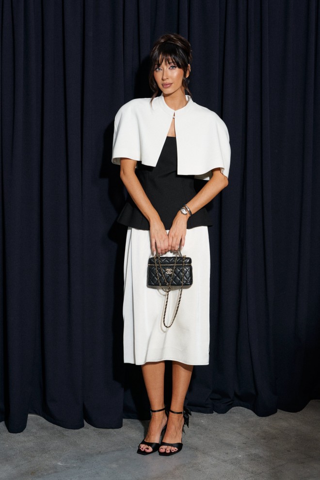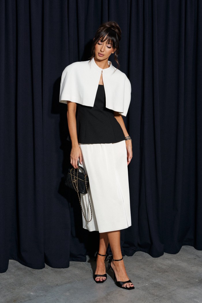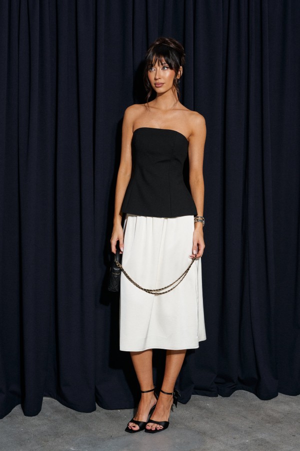 Корсет прилегающего силуэта из черной костюмной ткани. Характеристики: прилегающий силуэт, брендированная подкладка, прямой вырез горловины, по передней и задней части изделия прошиты строчки, по заднему полотну в среднем шве потайная молния. Длина по центру спинки 36см.