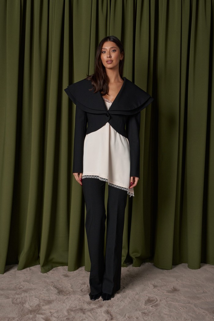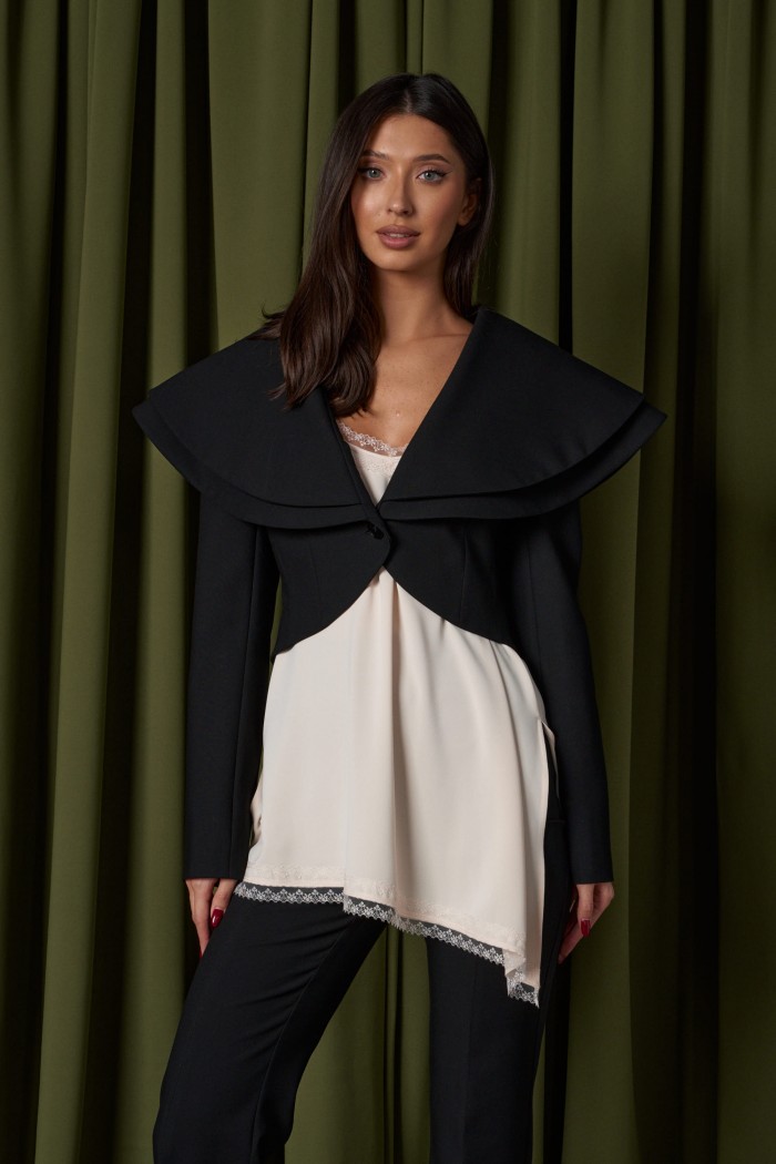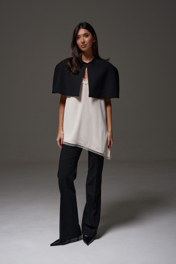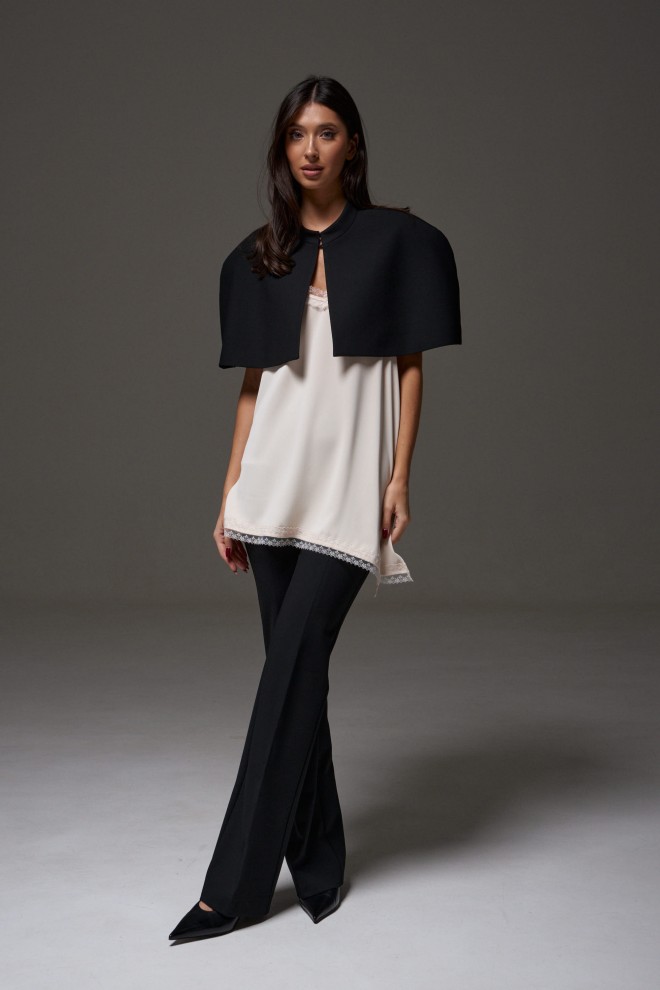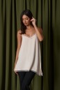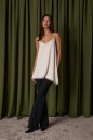 Блузон на тонких бретелях, выполнен из ткани сатин, молочного цвета. Силуэт свободный. Бретели регулируемые. V-образный вырез, низ ассиметричный в удлиненной части разрез по линии шва. По верху и низу изделия кружево. Длина по длинному боковому шву с учетом кружева 60 см. Длина разреза с учетом кружева 32 см.