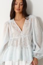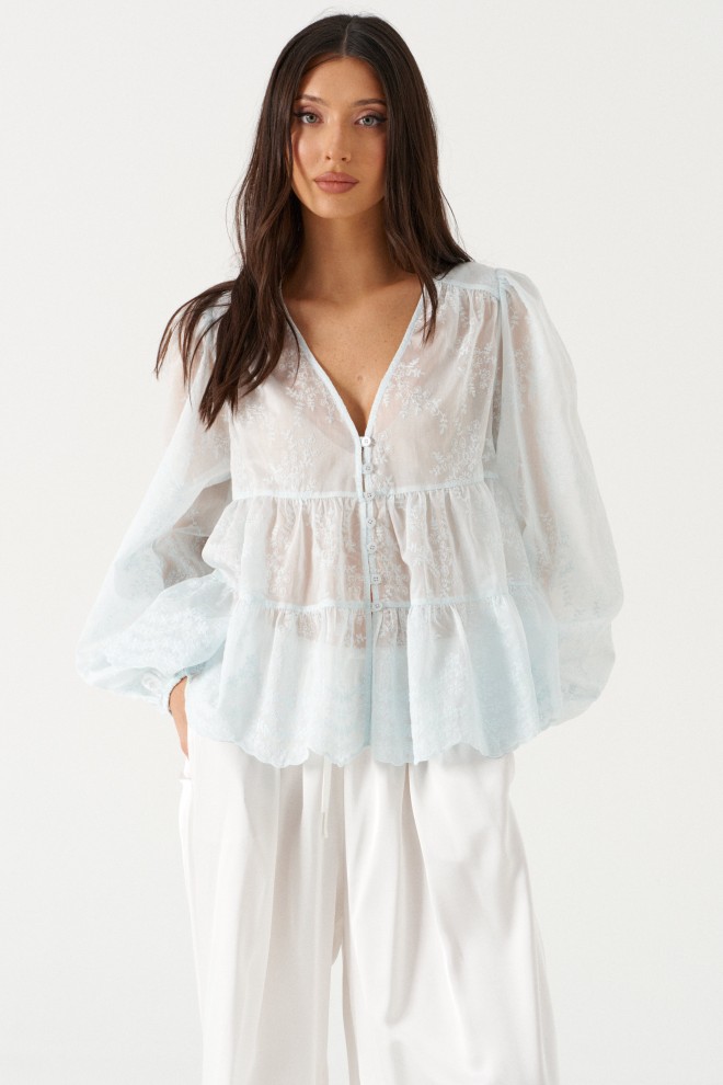 Блузка свободного кроя выполнена из полупрозрачной ткани с вышивкой голубого цвета. Характеристики: вырез V-образный, отрез по линии груди с двумя воланами, кокетка со сборкой, рукав вточной широкий, манжет на на резинке, застёжка на воздушные петли. Длина по центру спинк 59 см, длина рукава от края горловины 76 см.