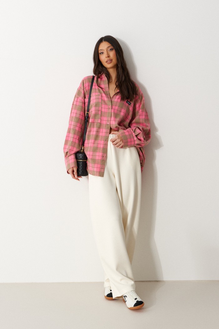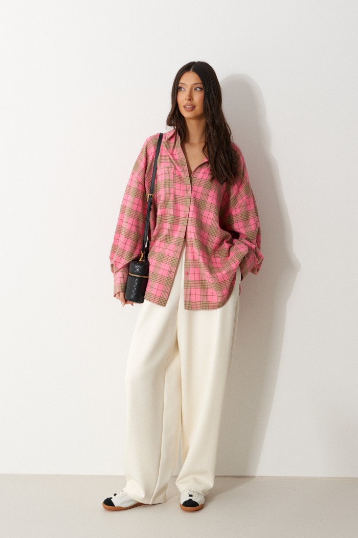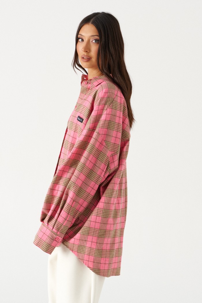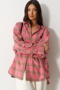Рубашка прямого свободного кроя, выполнена из ворсистого полотна розового цвета в коричневую клетку. Характеристика: воротник отложной, застёжка центральная на пуговицы, по переду справа на уровне линии груди карман, слева - брендированная нашивка Annete, рукав спущенный свободный, с широкой манжетой на пуговице, спинка отрезная с скоалками. Длина рукава от края горловины 77 см. Длин по центру спинки от края горловины 77 см.