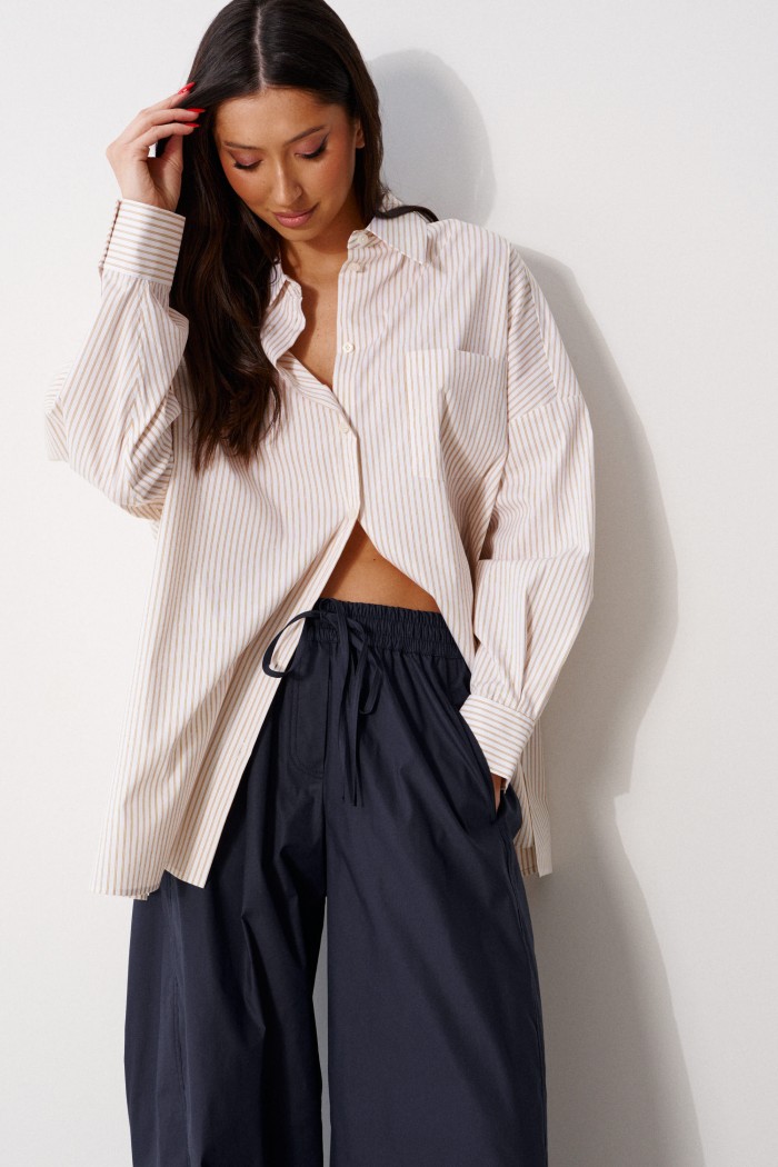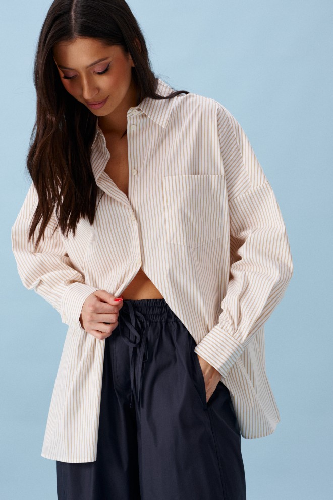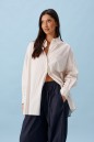 Рубашка свободного кроя. Выполнена из хлопковой (смесовой) ткани белого цвета с полоской жёлтой. Воротник отрезной. Рукав втачной, спущенный, с манжетой с пуговками. Слева на уровне линии груди накладной карман. Спинка с отрезной кокеткой. Застёжка центральная пуговицы. В боковых швах разрезы 26 см. Длина спинки 77 см. Длина рукава от линии втачивания 44 см
