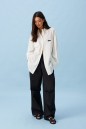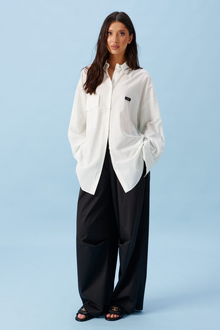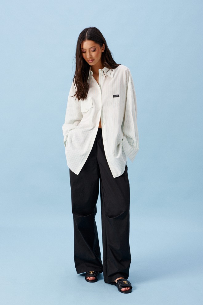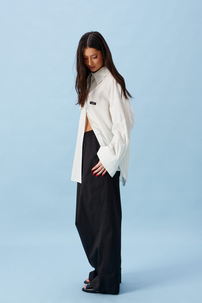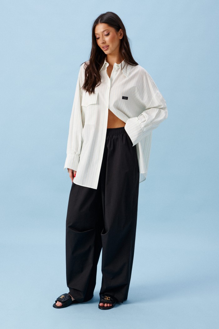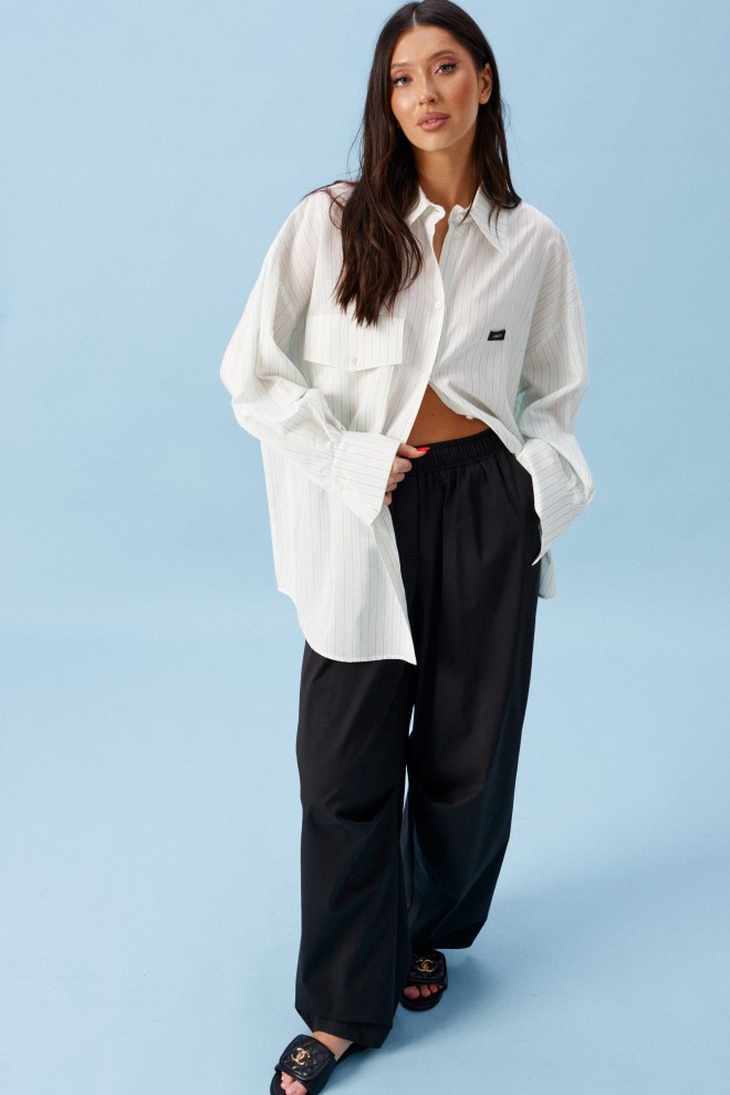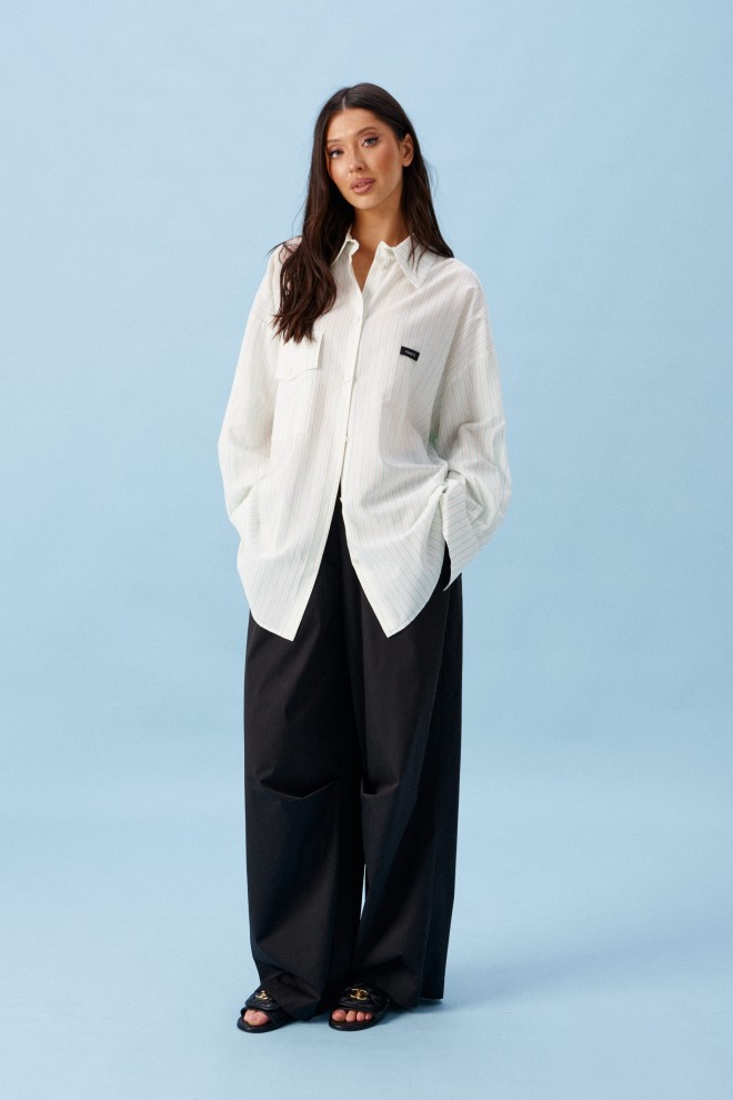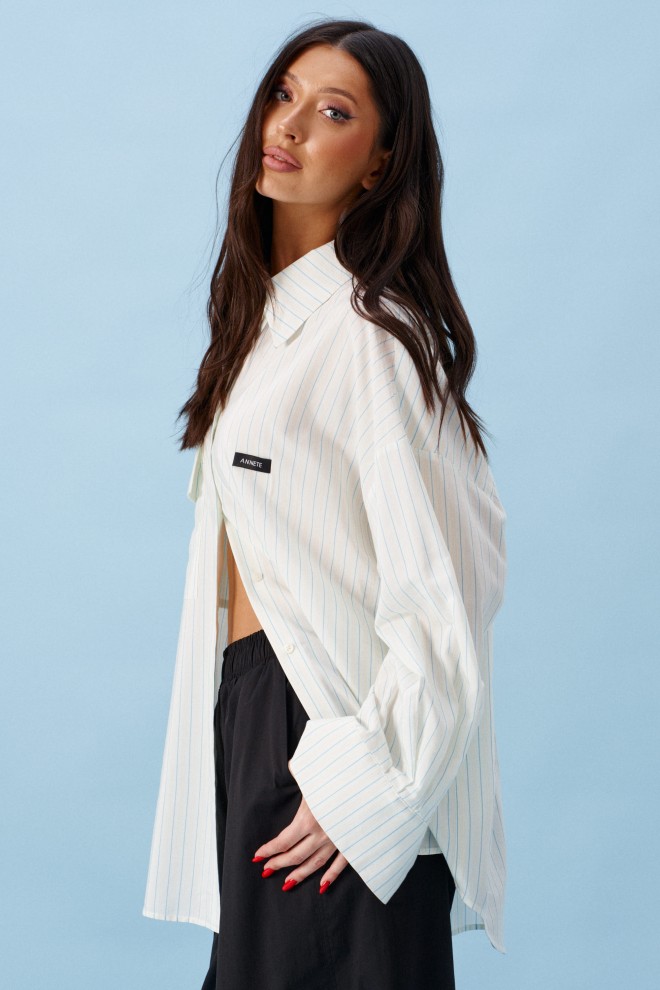 Рубашка свободного кроя. Выполнена из хлопковой (смесовой) ткани белого цвета с полоской голубой и светло-бежевой. Воротник отложной. Рукав втачной, спущенный, с манжетой с пуговкой. Справа на уровне линии груди накладной карман с клапаном. Слева на уровне груди брендированная нашивка. Спинка с отрезной кокеткой. Застёжка центральная пуговицы. Длина спинки 76 см. Длина рукава от линии втачивания 51 см