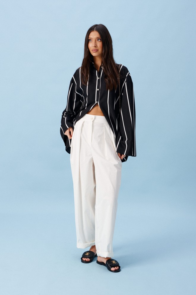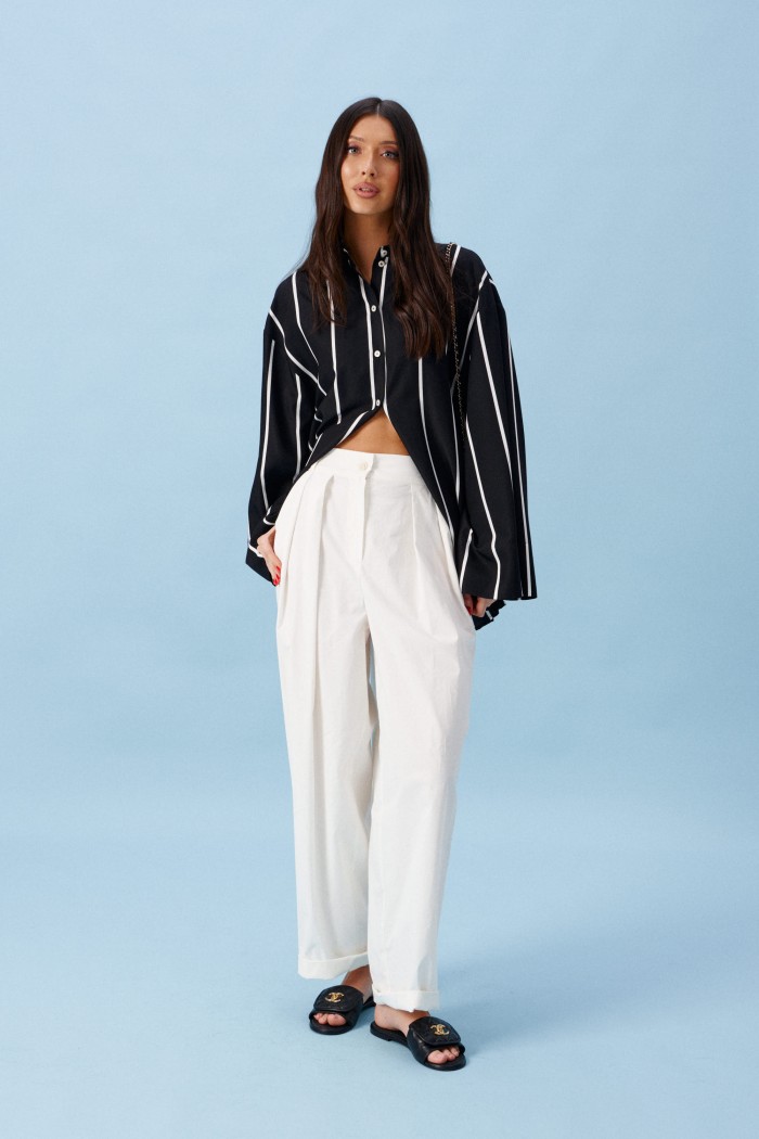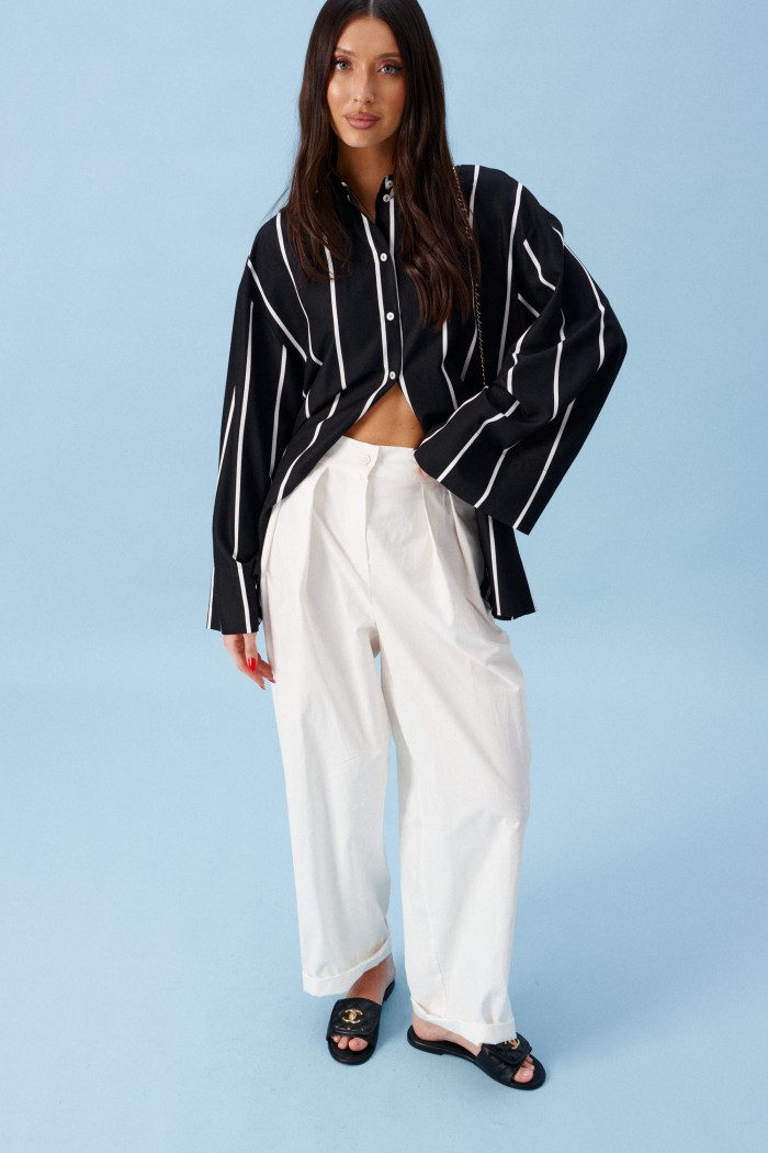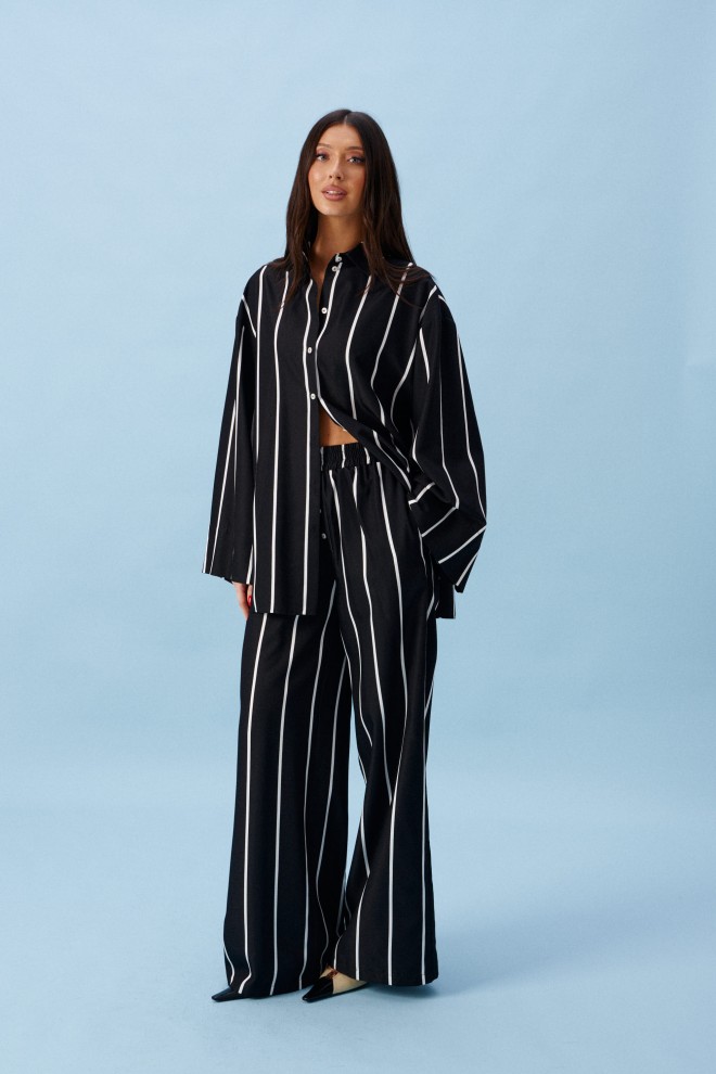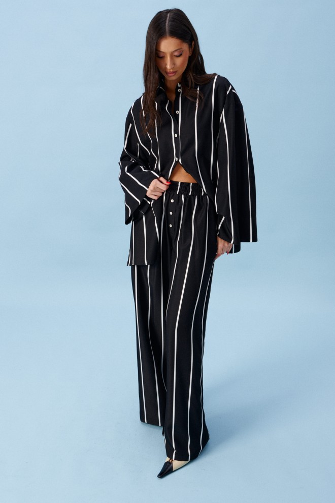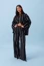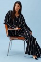 Блузка прямого свободного кроя, выполнена из полотна черного цвета в светлую полоску. Характеристики: прямой крой, воротник отложной, застежка центральная на пуговицы, в боковых швах разрез 20см, плечо спущенное, рукав втачной широкий, спинка отрезная. Длина изделия по центру спинки 75 см. Длина рукава от края горловины 77см.