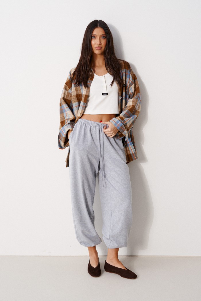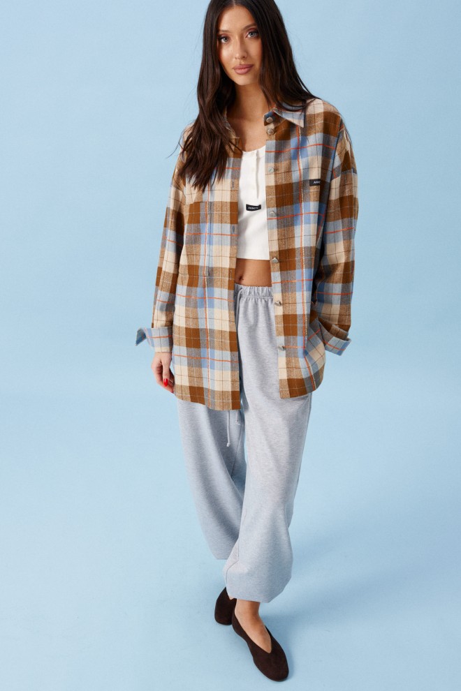 Рубашка свободного кроя. Выполнена из хлопковой ткани в клетку. Воротник отложной. Рукав втачной, спущенный, с манжетой с пуговицами. Справа на уровне линии груди накладной карман. Слева на уровне груди брендированная нашивка. Спинка с отрезной кокеткой. Застёжка центральная пуговицы. Длина спинки 76 см. Длина рукава от линии втачивания 52 см