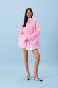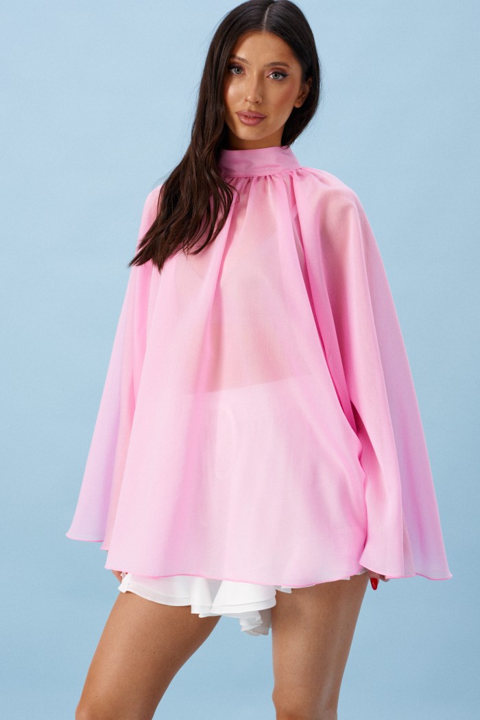 Блузка свободного кроя, выполнена из полупрозрачного полотна розового цвета. Характеристика : свободный крой, воротник стойка сзади на застежке петли пуговицы. Рукав-реглан. Длина рукава от горловины 75см, длина по спинке 74см