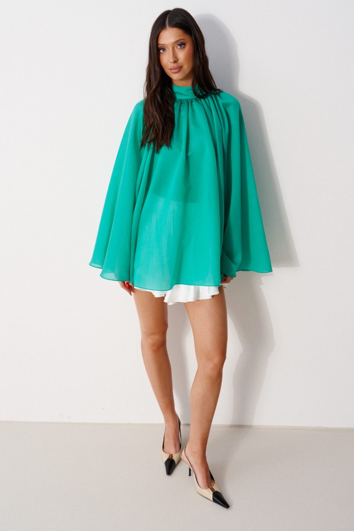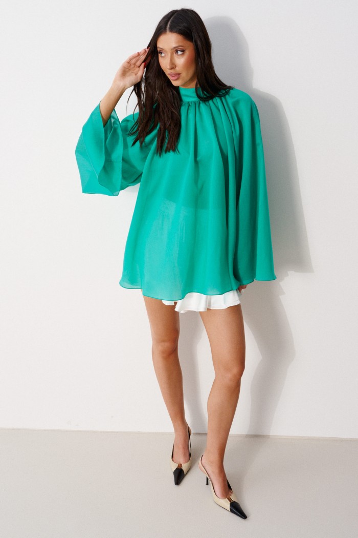 Блузка свободного кроя, выполнена из полупрозрачного полотна зеленого цвета. Характеристика : свободный крой, воротник стойка сзади на застежке петли пуговицы. Рукав-реглан. Длина рукава от горловины 75см, длина по спинке 74см