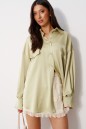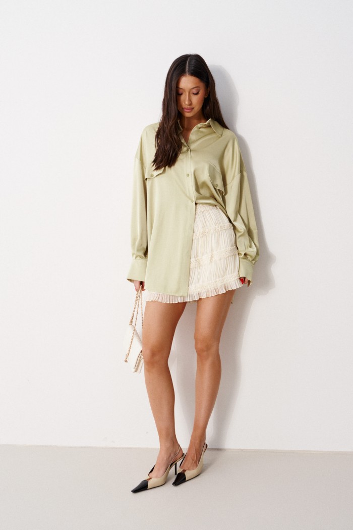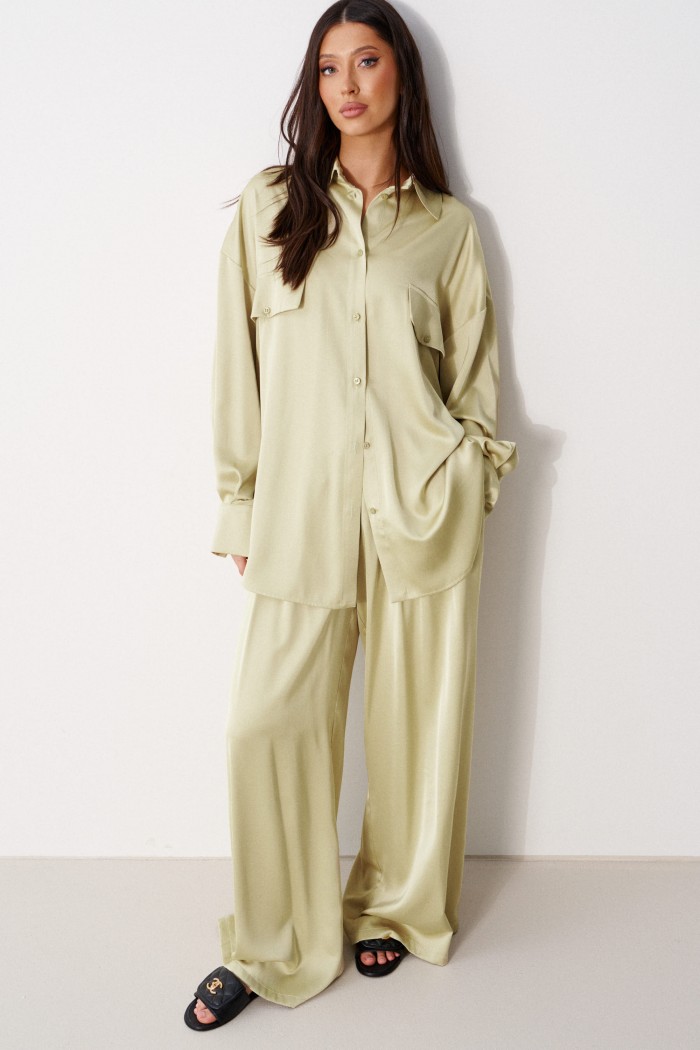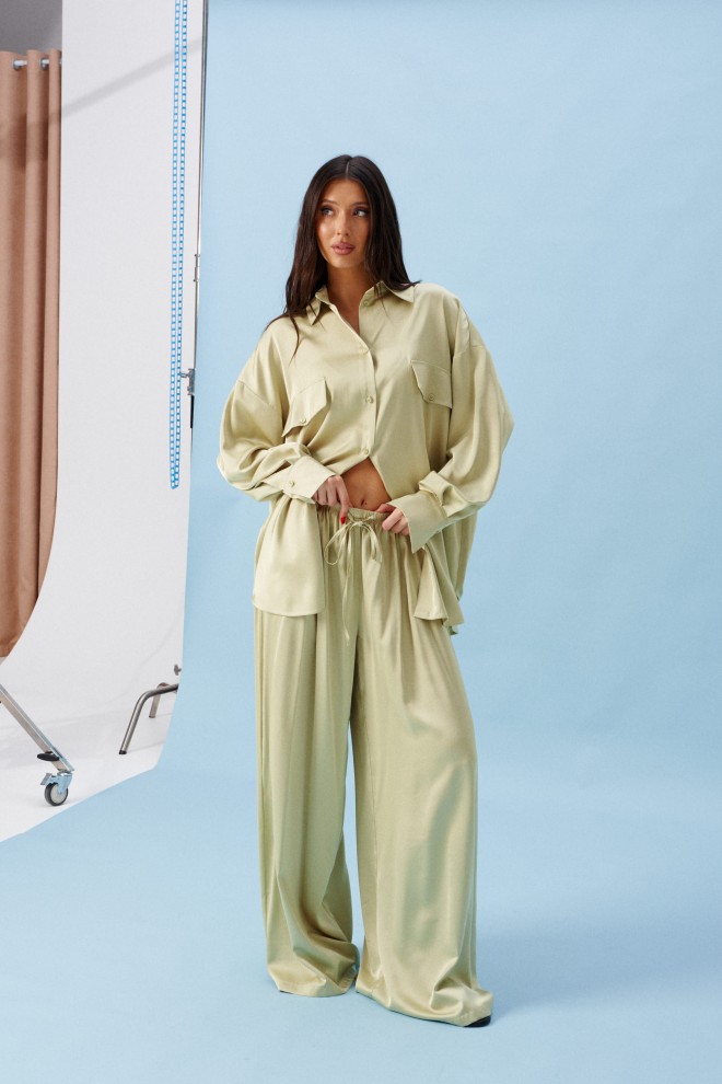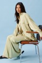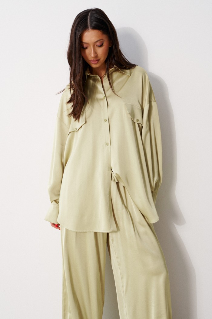 Блузка прямого, свободного кроя. Выполнена из мягкого текстильного полотна оливкового цвета. Воротник отложной. Застёжка центральная на пуговицы. По переду на уровни линии груди клапаны - имитация карманов. Спинка отрезная со сборкой. Рукав спущенный, свободный, с манжетой на пуговице. Длина рукава от края горловины 79 см. Длина спинки 77 см