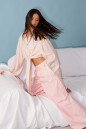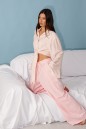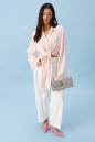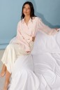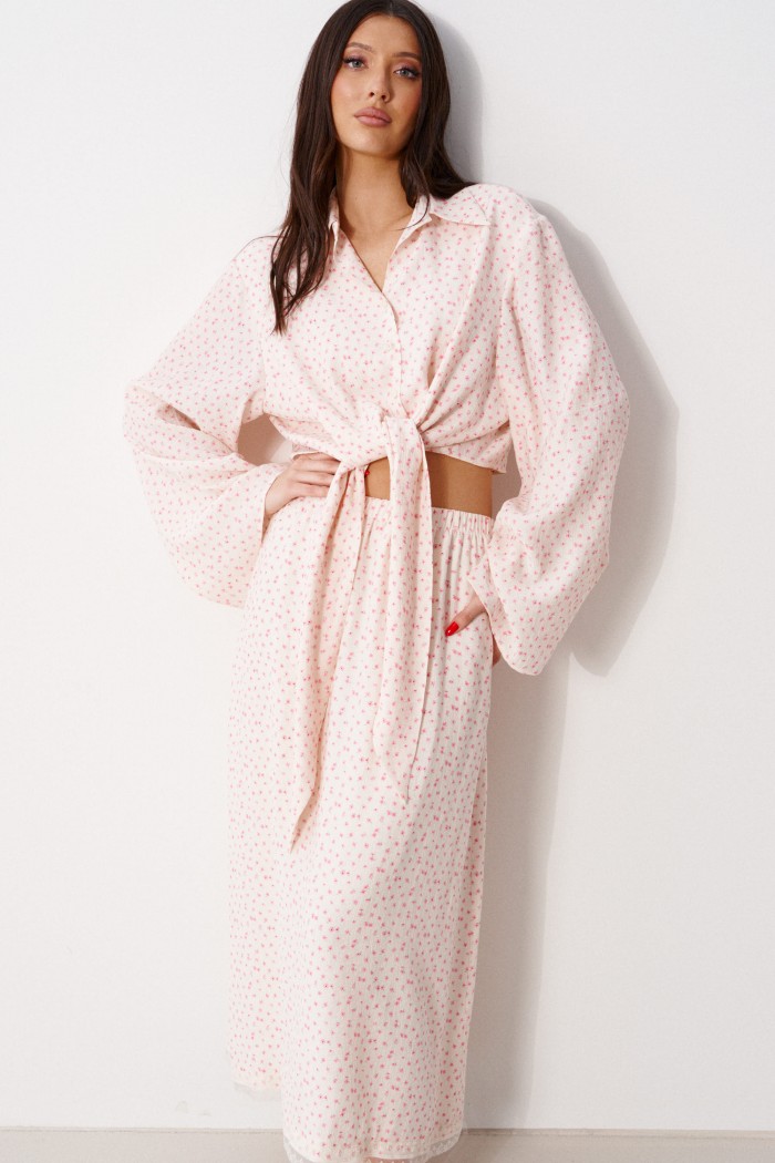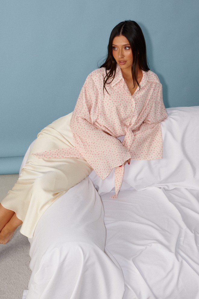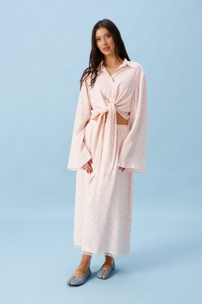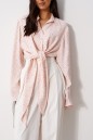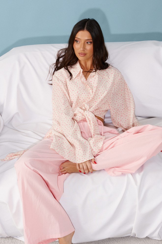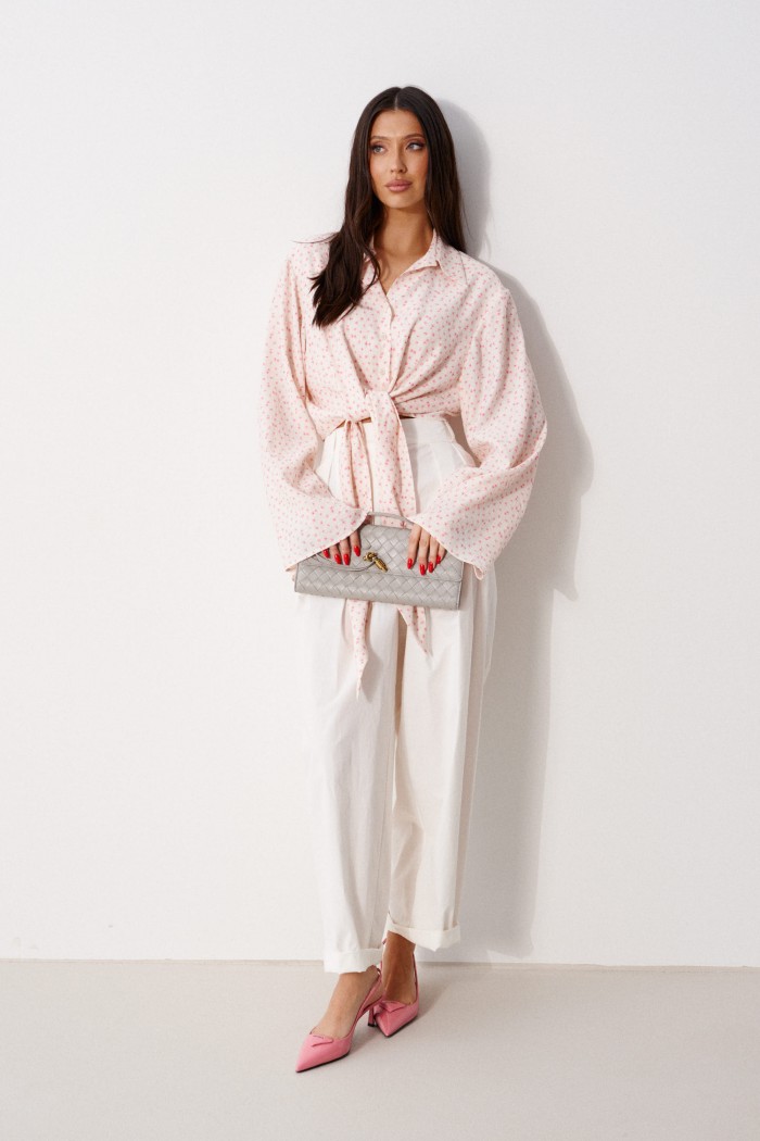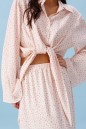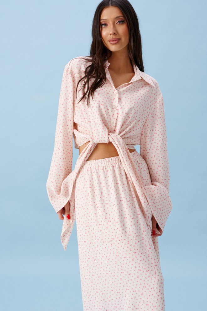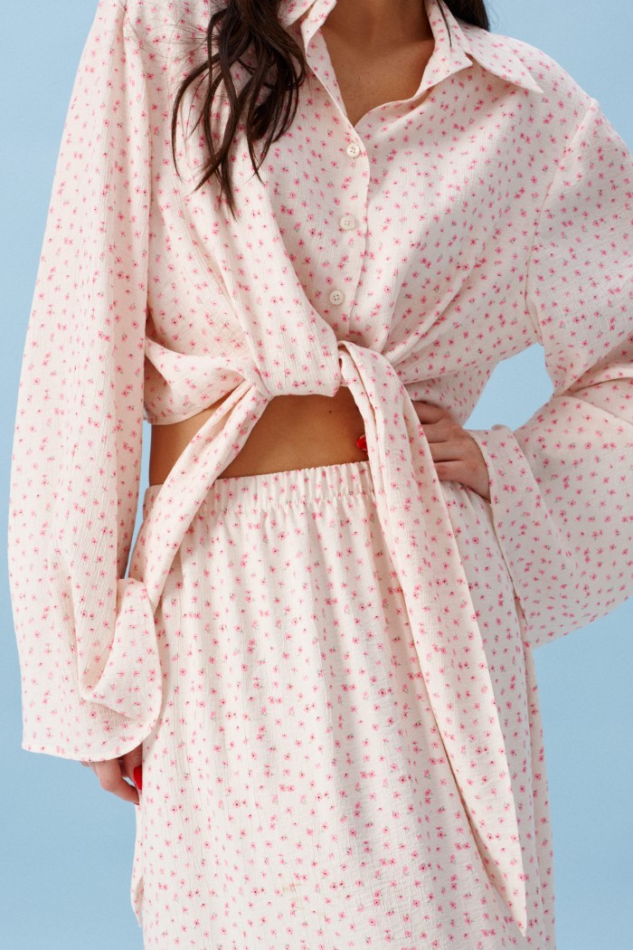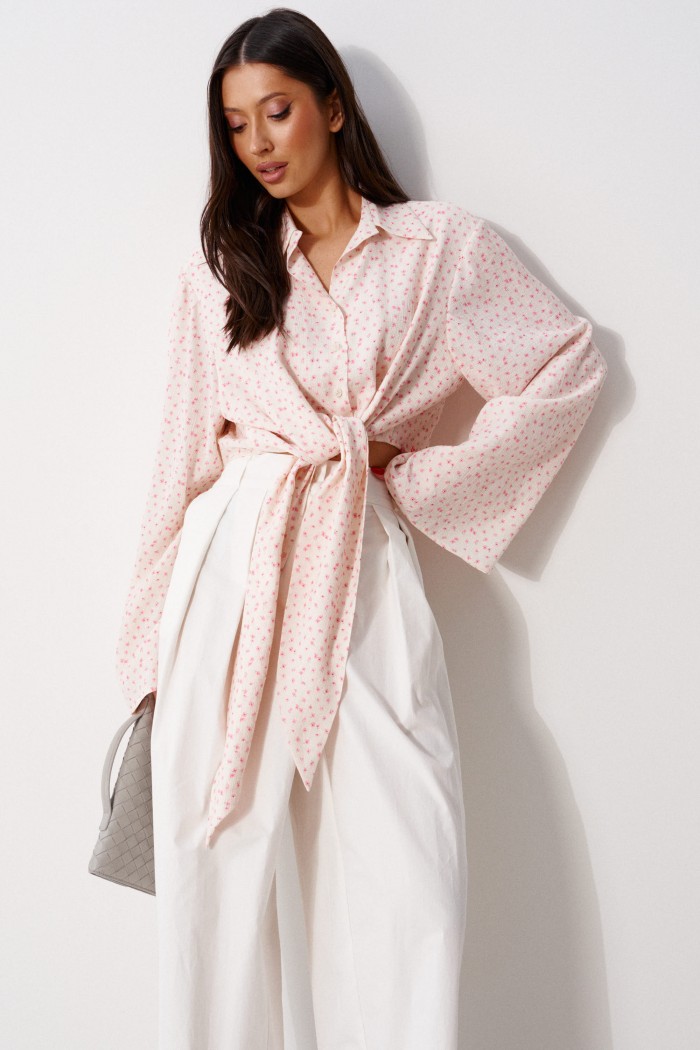 Блузка прямого кроя, выполнена из ткани нежно персикового цвета в мелкий цветок. Характеристика: прямой крой, по переду рубашки цельнокроенные завязки, воротник отложной, застежка центральная на петли пуговицы, рукав втачной, расширяется к низу. Длина изделия по центру спинки 43 см, длина рукава от края горловины 81 см.