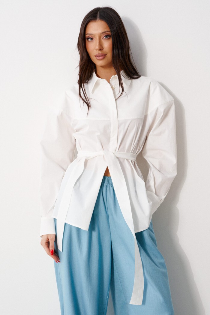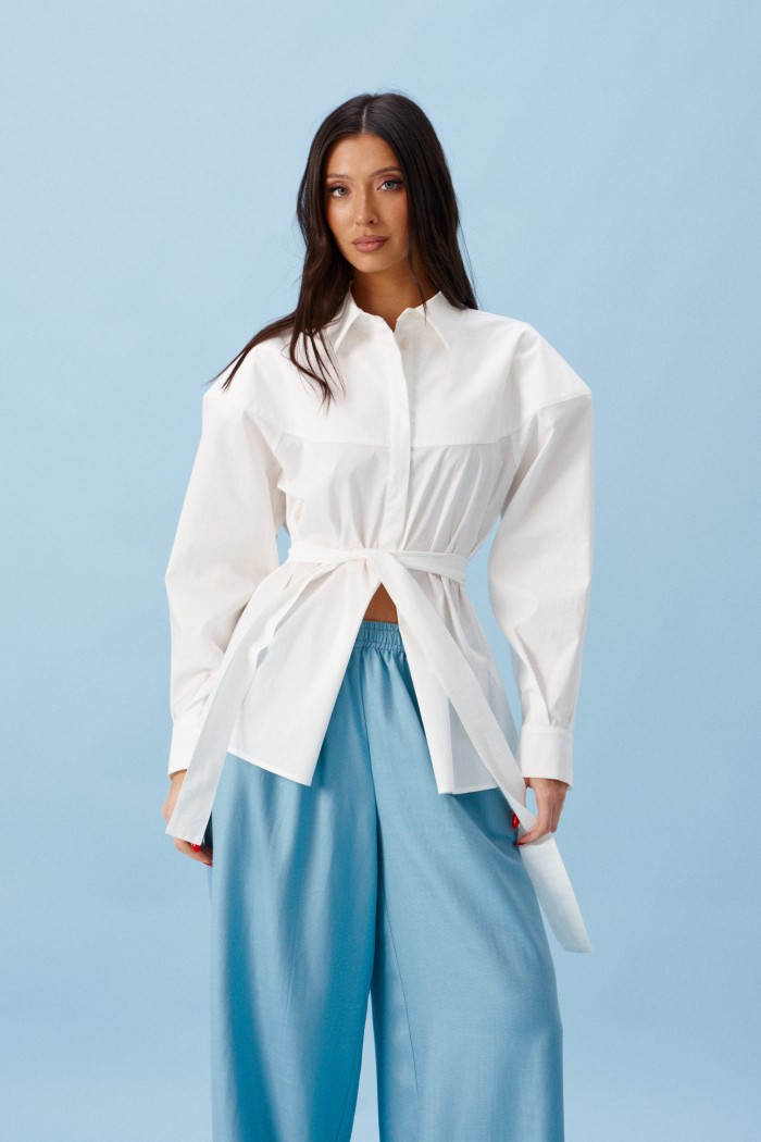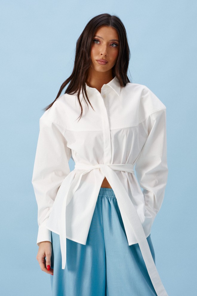 Рубашка прямого свободного кроя. Выполнена из хлопокового плотного полотна. Характеристики: прямой свободный крой, рукав спущеный, есть подплечники, пояс в комплекте. Застёжка центральная на пуговицы. Над манжетом защипы, манжет застёгивается на пуговицы. Длина по спинке 69 см, длина рукава от края горловины 76 см.