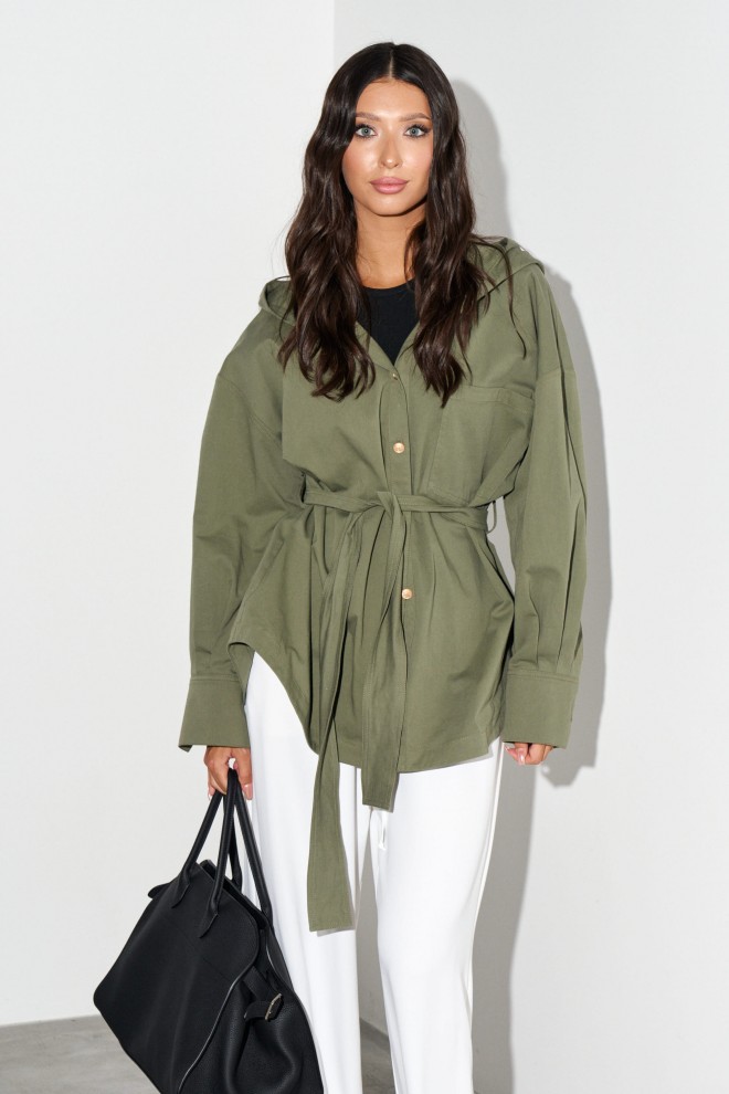Блузон прямого свободного кроя. Выполнен из мягкого денима цвета хаки. Характеристики: прямой свободный крой, рукав спущеный, по линии талии шлевки, пояс в комплекте. Застёжка центральная на пуговицы, по переду изделия один накладной карман. Над манжетом защипы, манжет застёгивается на три пуговицы. Длина по спинке 75 см, длина рукава от края горловины 73 см.