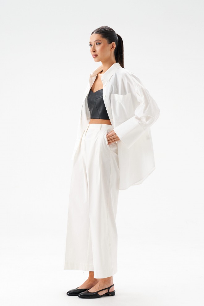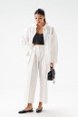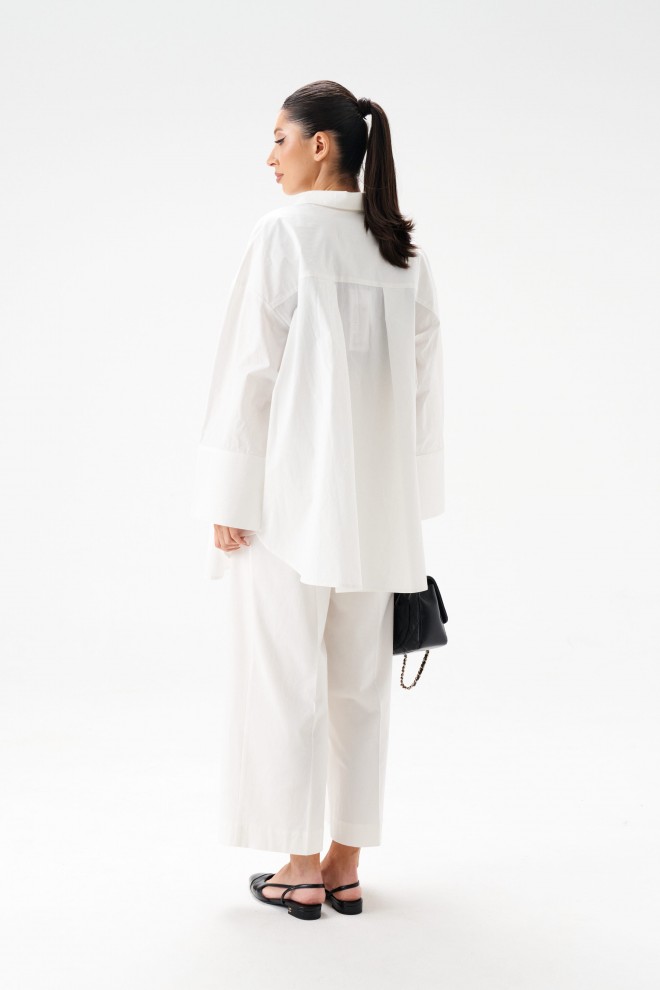 Рубашка прямого свободного кроя выполнена из ткани белого цвета. Характеристики: прямой свободный крой, отложной воротник на стойке, застежка центральная на петли пуговицы, по переду крупные карманы, рукав спущен, по рукаву декоративные складки, по низу рукава широкая манжета, спинка отрезная с декоративными складками, низ изделия с плавным срезом. Длина по спинке 80 см, длина рукава от края горловины 74 см.