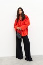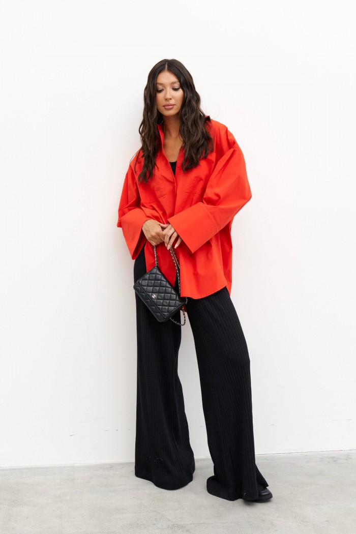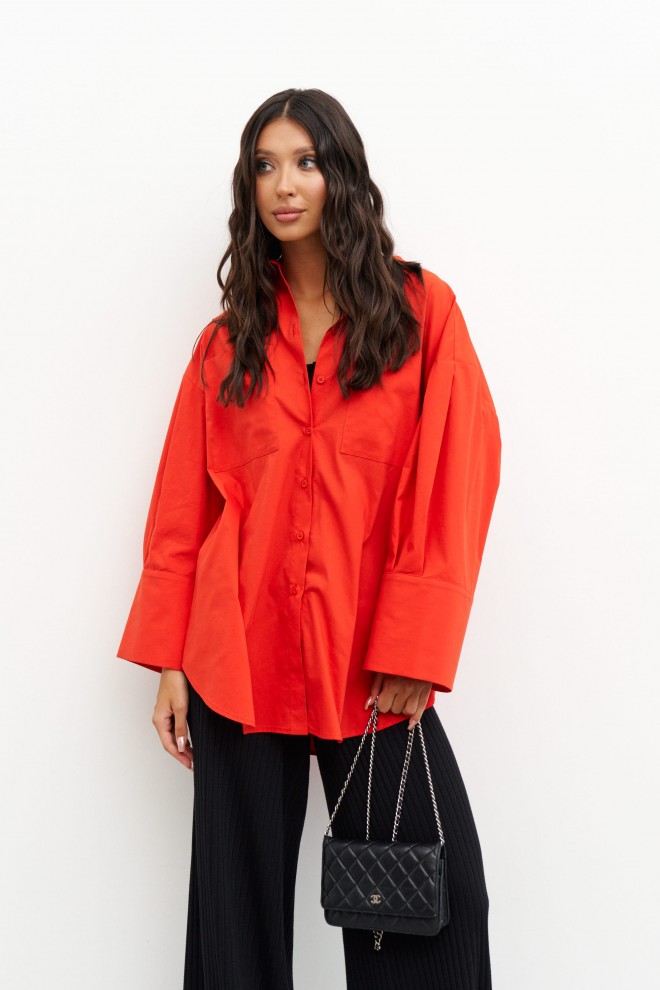 Рубашка прямого свободного кроя выполнена из ткани красного цвета. Характеристики: прямой свободный крой, отложной воротник на стойке, застежка центральная на петли пуговицы, по переду крупные карманы, рукав спущен, по рукаву декоративные складки, по низу рукава широкая манжета, спинка отрезная с декоративными складками, низ изделия с плавным срезом. Длина по спинке 80 см, длина рукава от края горловины 74 см.
