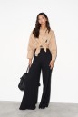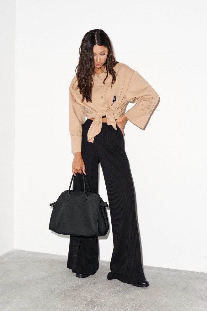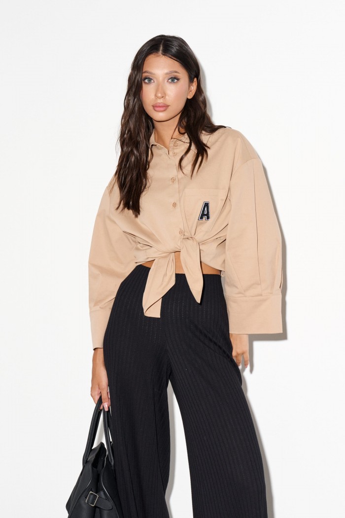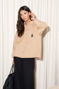 Рубашка прямого свободного кроя выполнена из полотна песочного цвета. Характеристики: прямой свободный крой, отложной воротник на стойке, застежка центральная на петли пуговицы, по переду карман с апликацией в виде буквы "А", рукав спущен, по рукаву декоративные складки, по низу рукава широкая манжета, спинка цельнокройная, по бокам изделия разрезы 10см. Длина по спинке 61 см, длина рукава от края горловины 68 см.
