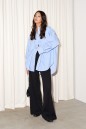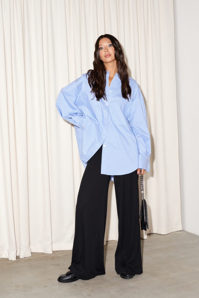 Рубашка прямого кроя выполнена из ткани голубого цвета с принтом белая вертикальная полоска. Характеристики: прямой свободный крой, отложной воротник на стойке, застежка центральная на петли пуговицы, рукав спущен, рукав с декоративными складками, по низу широкая манжета с иметацией запанки на пуговице. Спинка отрезная с декоративными складками, низ изделия с плавным срезом. Длина 80 см, длина рукава 78 см (от края горловины).