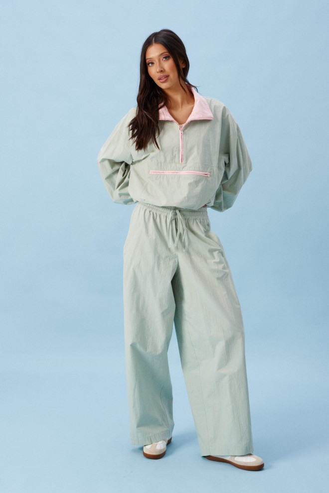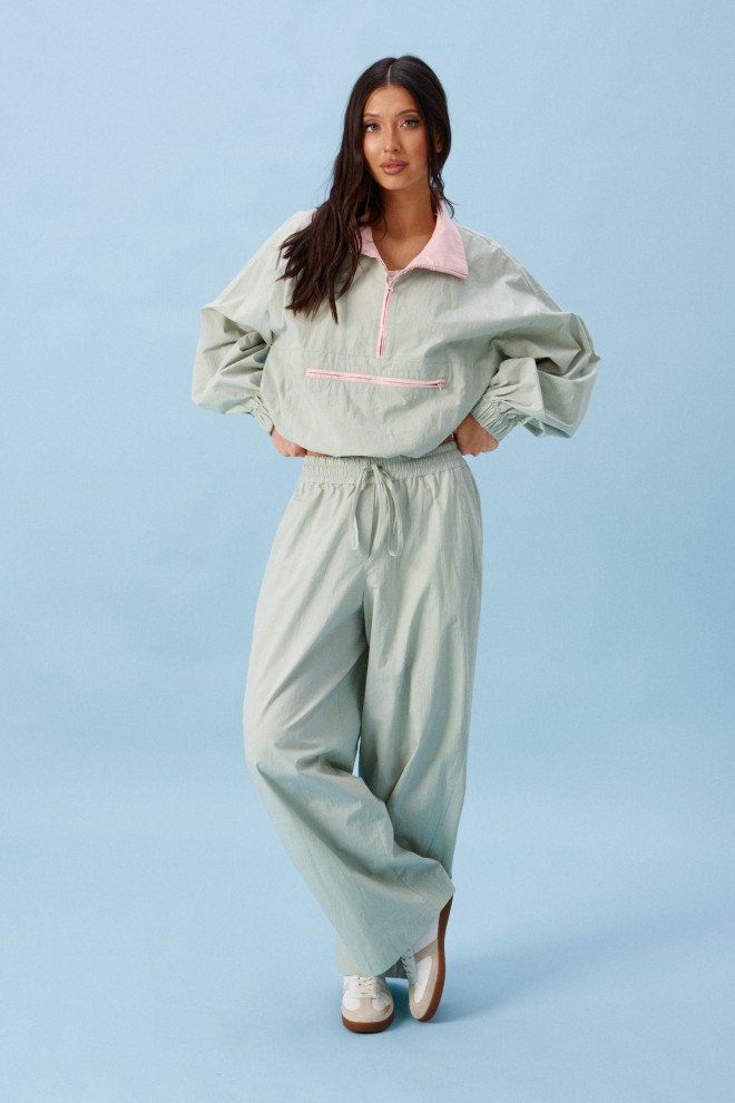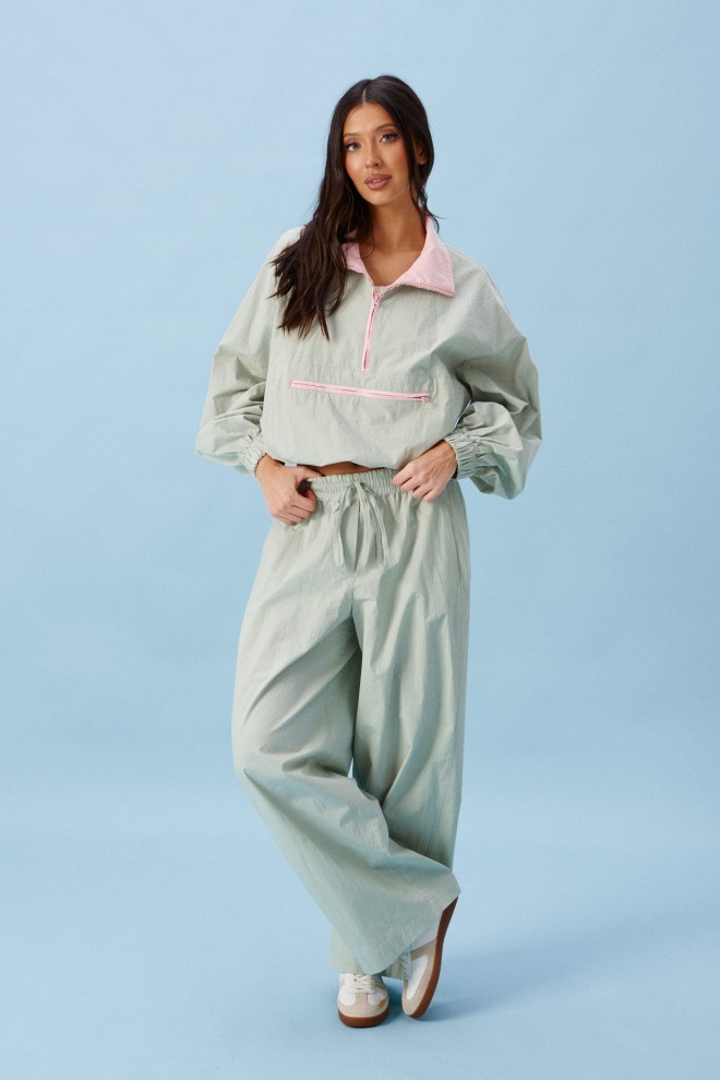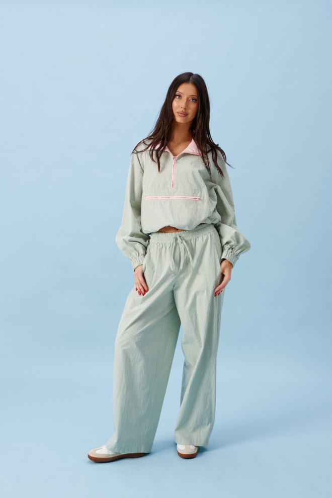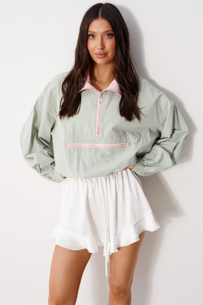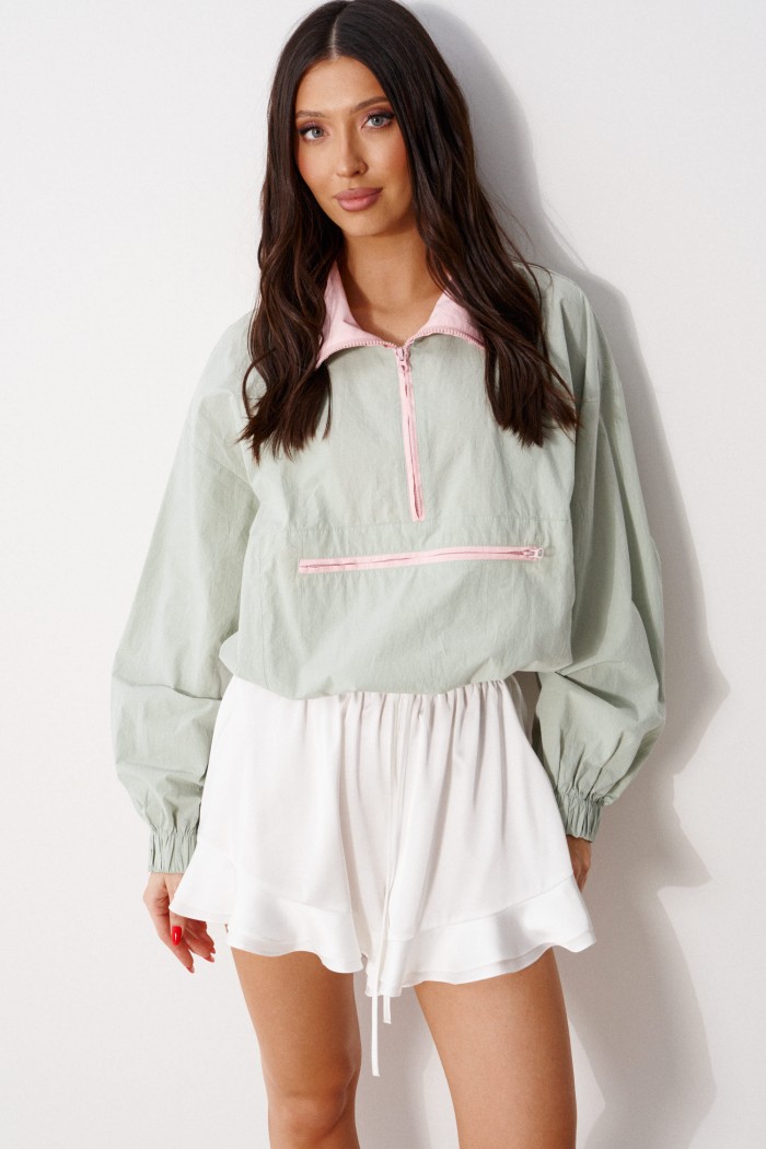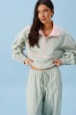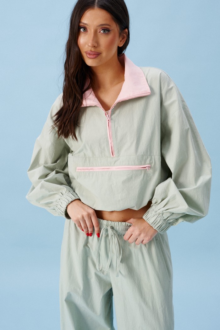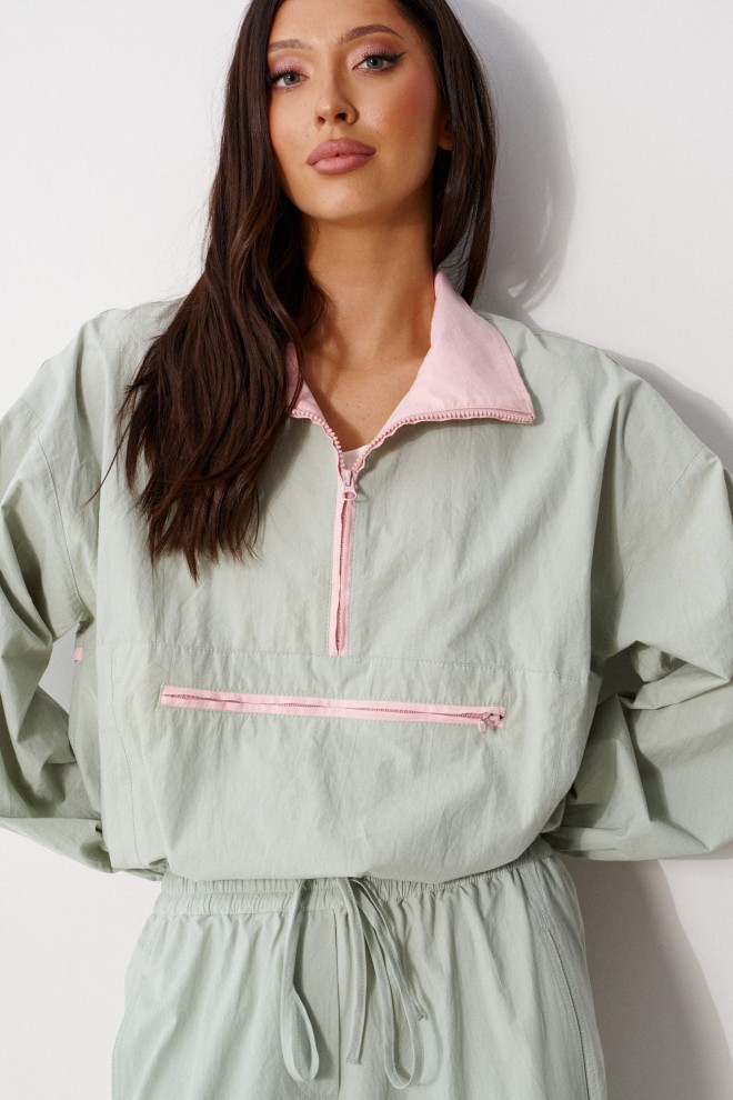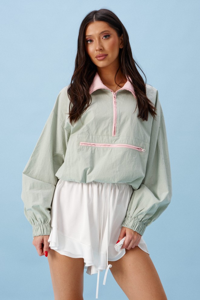 Блузон прямого свободного кроя выполнен из хлопковой ткани, в оттенке светлой оливы. Характеристики: отложной воротник, внетренняя часть выполнена из ткани розового цвета застежка молния, по переду карман на молнии. Низ изделия на резинке с фиксатором. Плечо спущено, рукав свободный, низ рукава на резинке. Длина по спинке 58 см, длина рукава от края горловины 83 см.