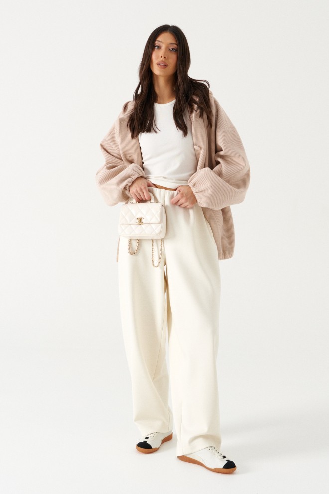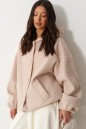 Жакет (бомбер), прямого силуэта , на подкладке. Выполнен из фактурной пальтовой ткани бежевого цвета. Характеристика: горловина круглая с притачным капюшеном. Линия плеча спущенная. Рукав длинный, одношовный, втачной. По низу присборен на резинку. По деталям полочки прорезные карманы с накладными листочками. Спинка цельная. Застежка центральная бортовая, застегивающаяся на прорезные петли и пришивные пуговицы. Длина рукава от горловины 78см, длина по спинке 71 см.