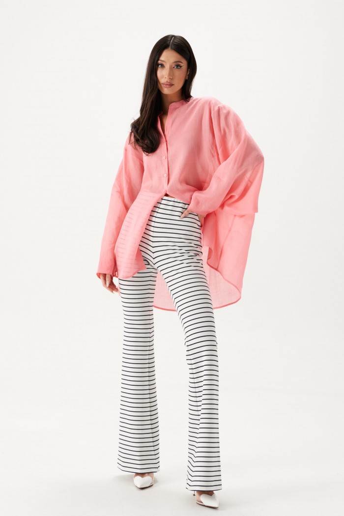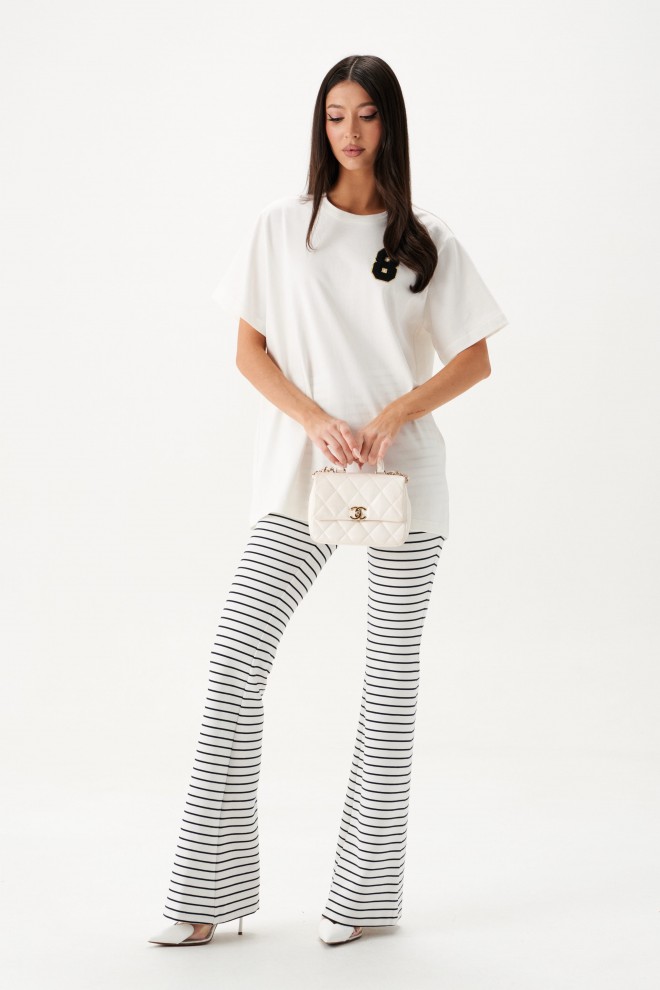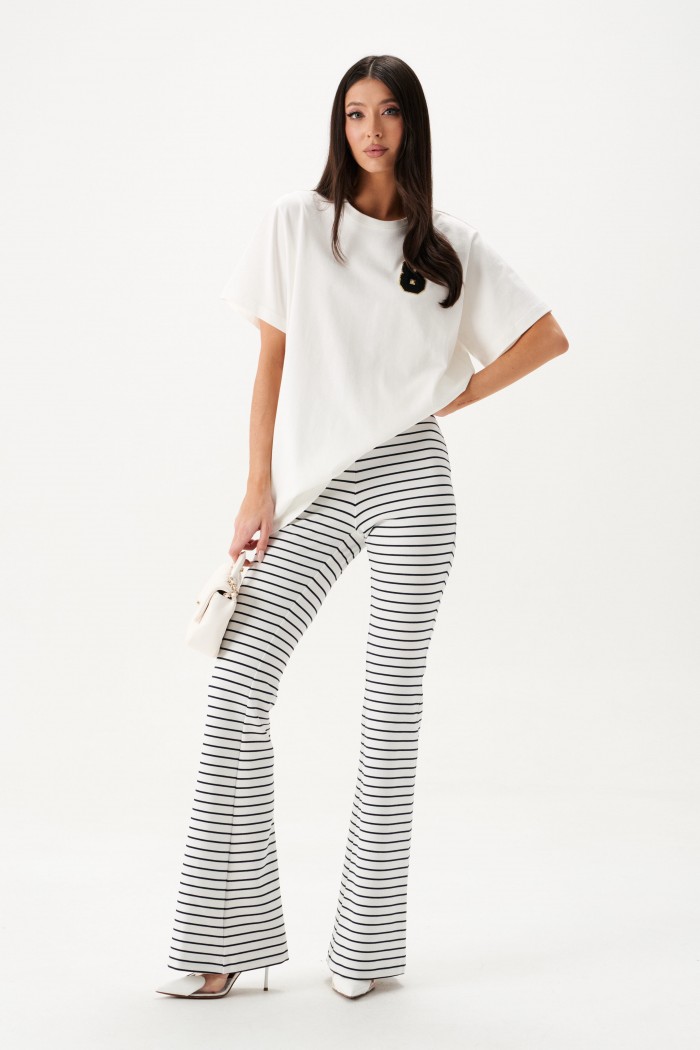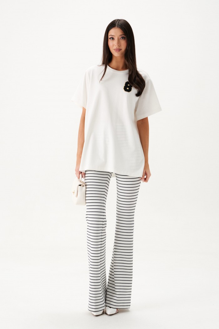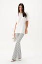Брюки полуприлегающего силуэта выполнены из трикотажного полотна с контрастной горизонтальной полоской.