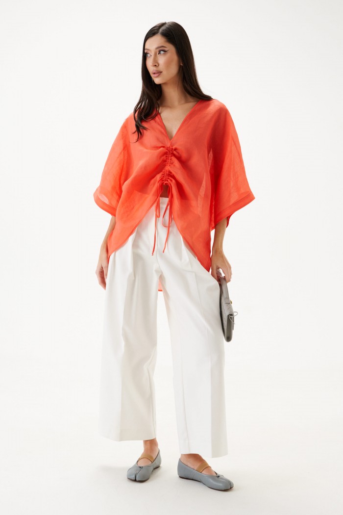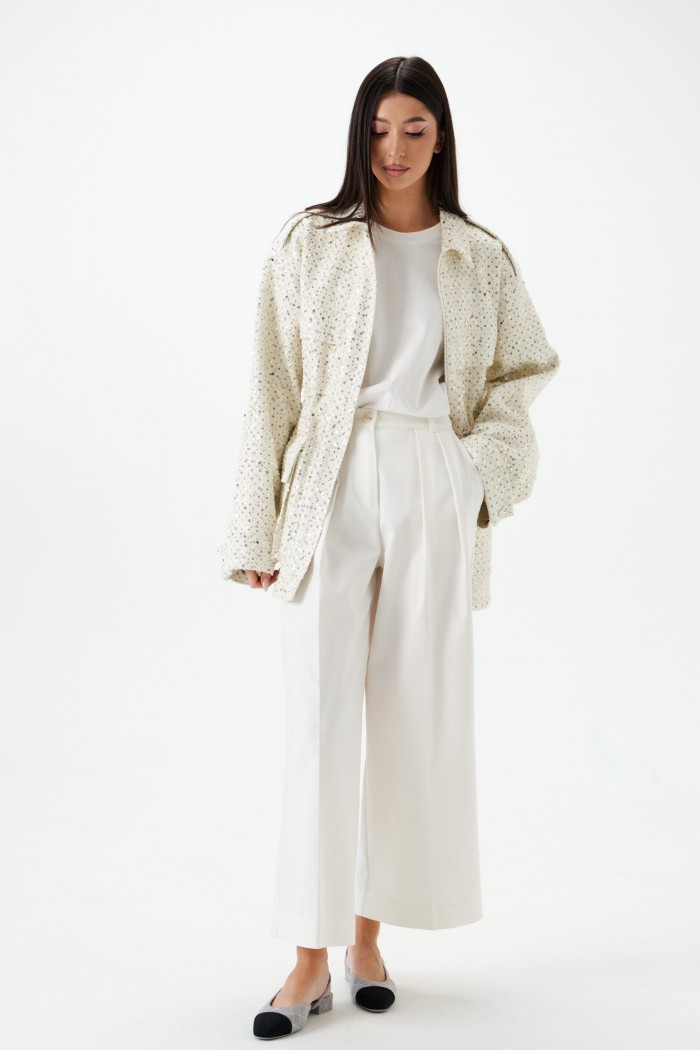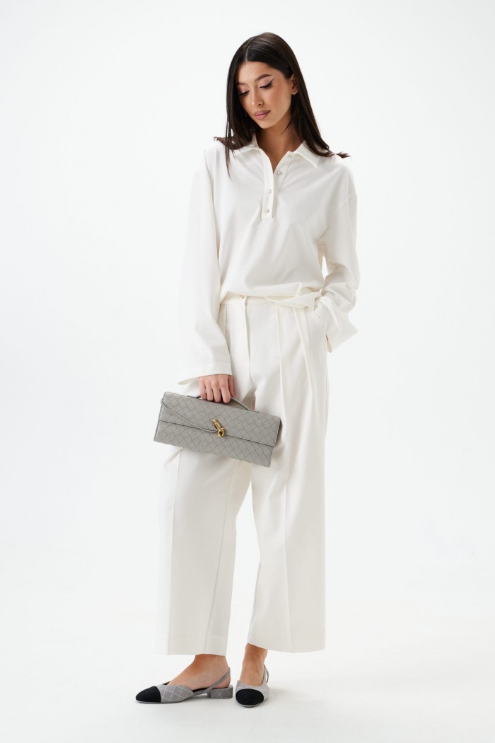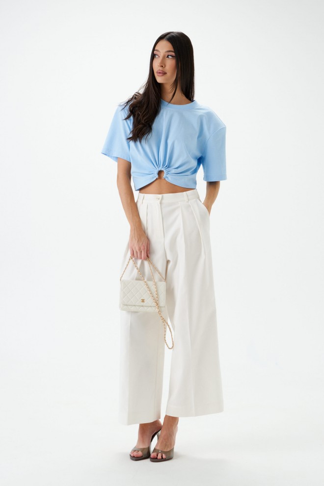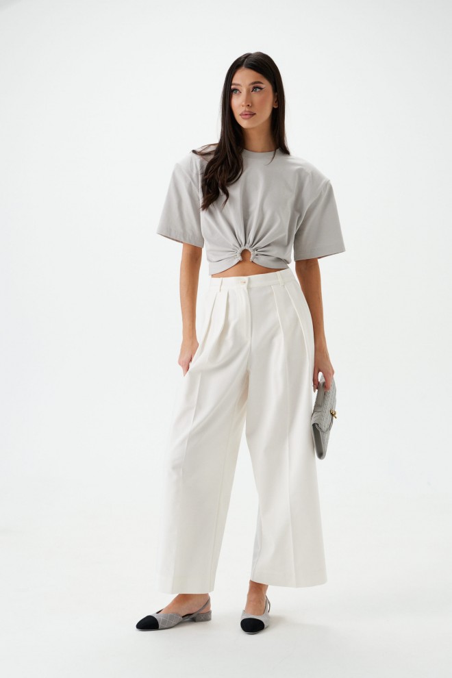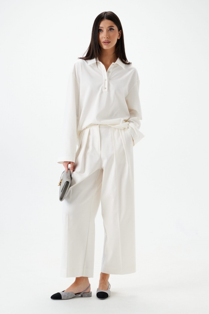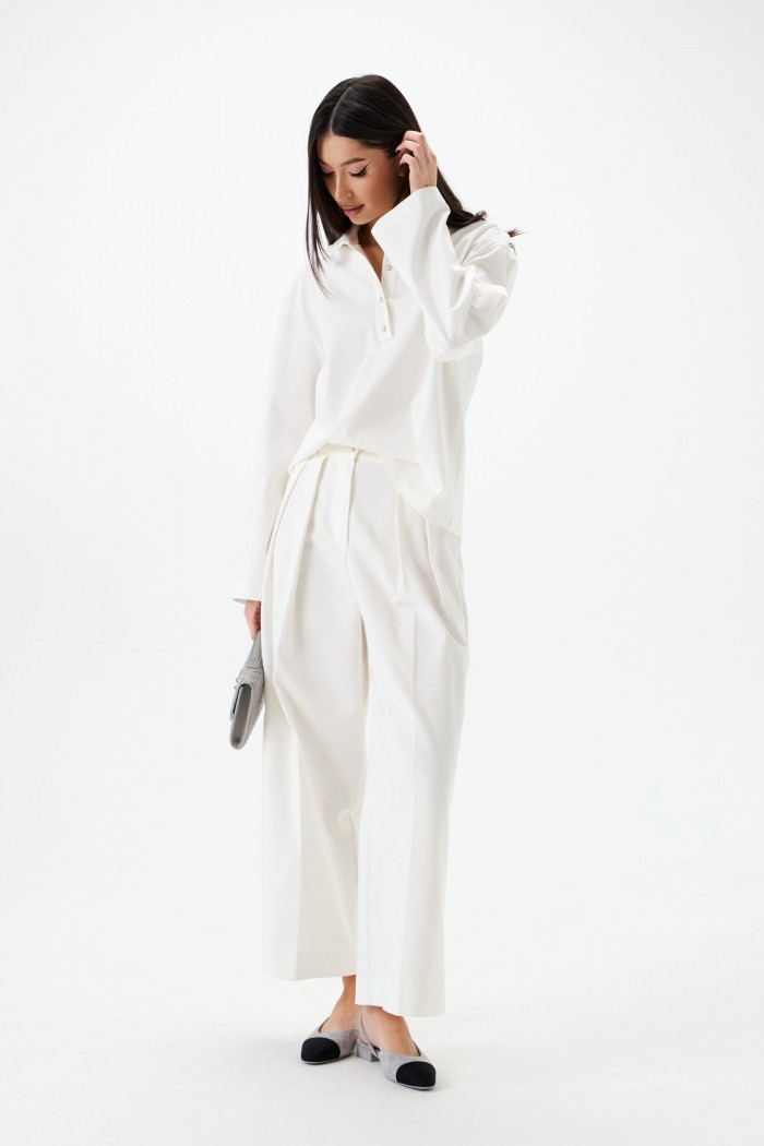 Брюки свободного кроя с акцентами декоративными складками. Характеристики: свободный крой, пояс стабильный, по поясу нашиты шлевки, застёжка пуговичка, молния, глубокие декоративные складки по передней части изделия, в боковых швах косые карманы. Длина изделия 100 см.