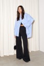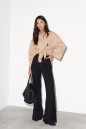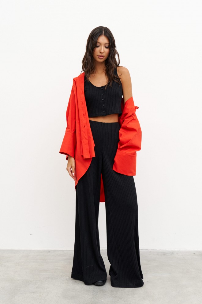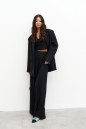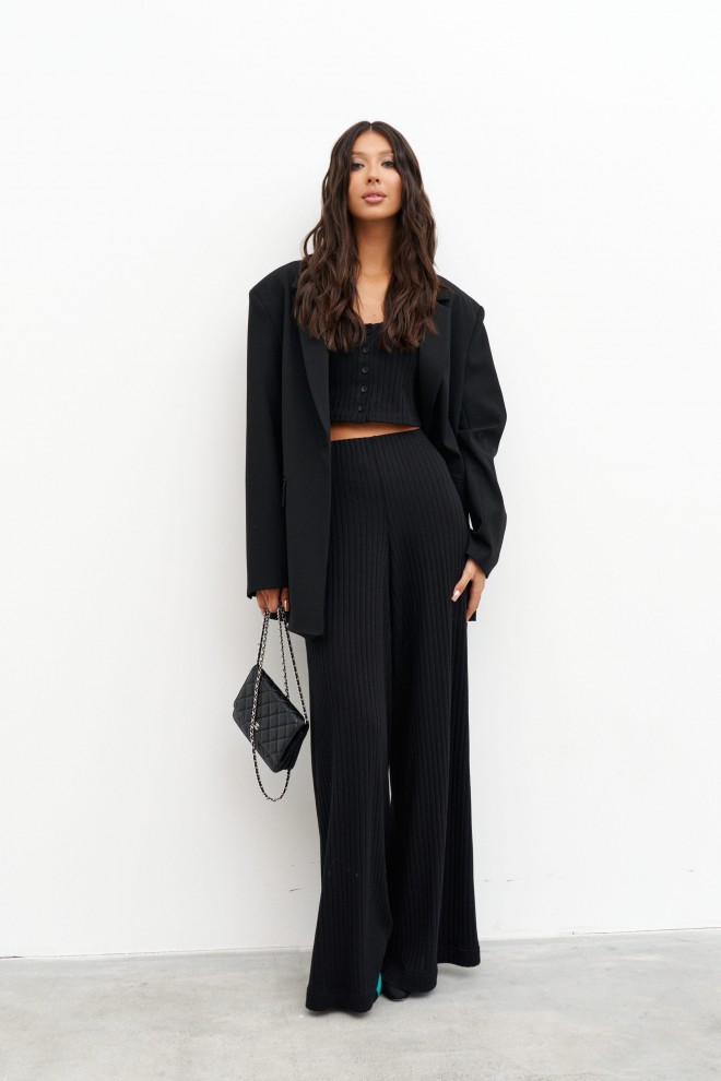 Брюки прямого кроя выполнены из трикотажного полотна узорной вязки черного цвета. Характеристики: прямой крой, пояс на резинке на подгибе. Длина 110 см. Образ дополнит топ, артикул А971.