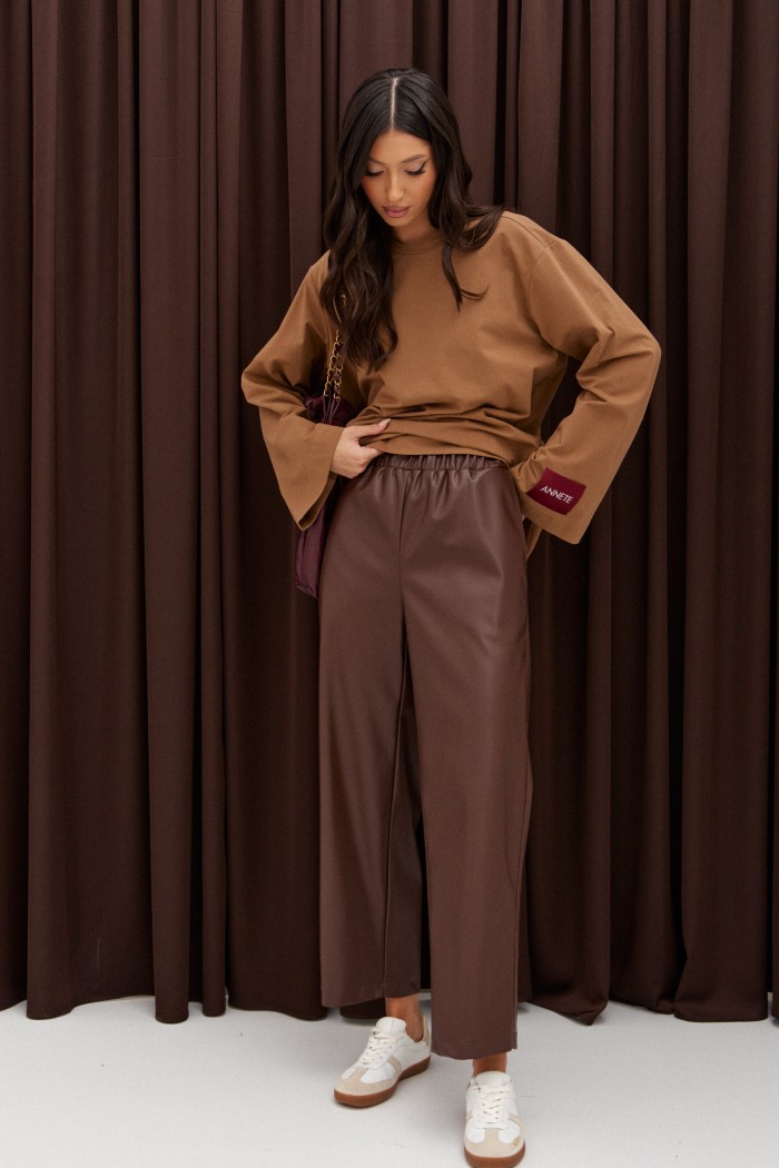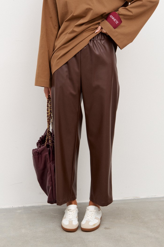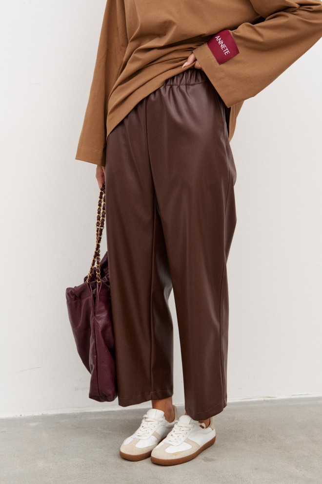 Брюки пямого кроя, укороченные. Выполнены из эко-кожи. Пояс на резинке. В боковых швах карманы. Длина по боковому шву 92 см (+ пояс 4,5 см)