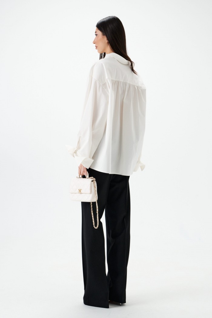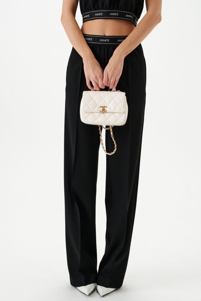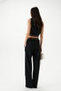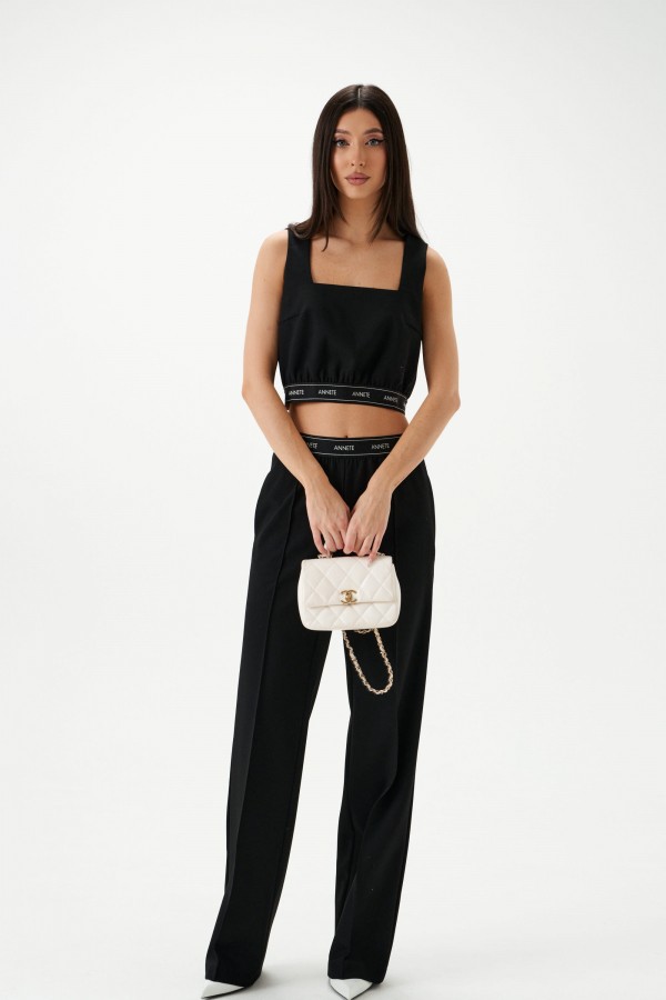 Брюки прямого кроя. Выполнены из костюмной ткани чёрного цвета. Пояс на брендированной резинке. Застёжки нет. По передней и задней частям застроченные стрелки. В боковых швах карманы. Длина 108 см