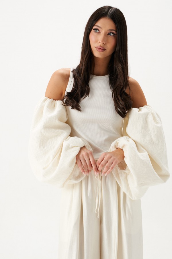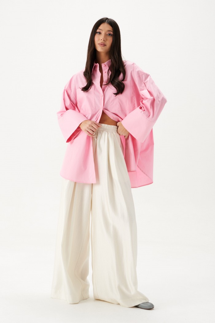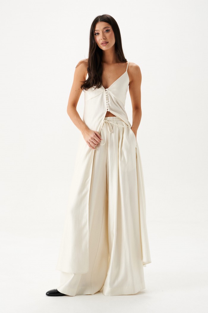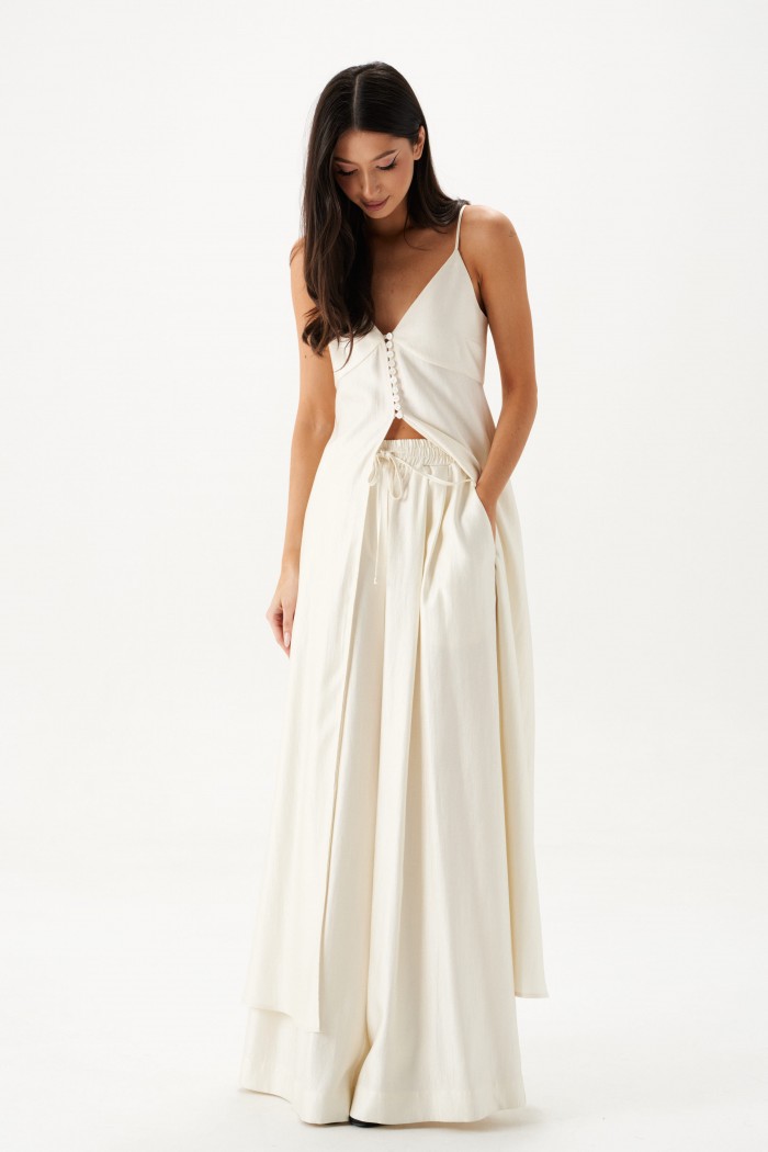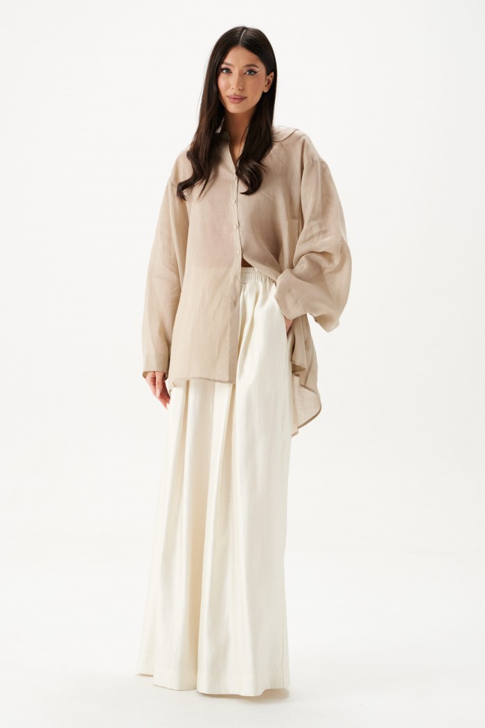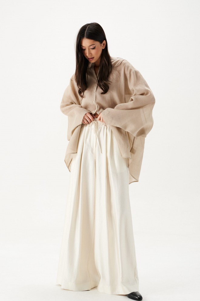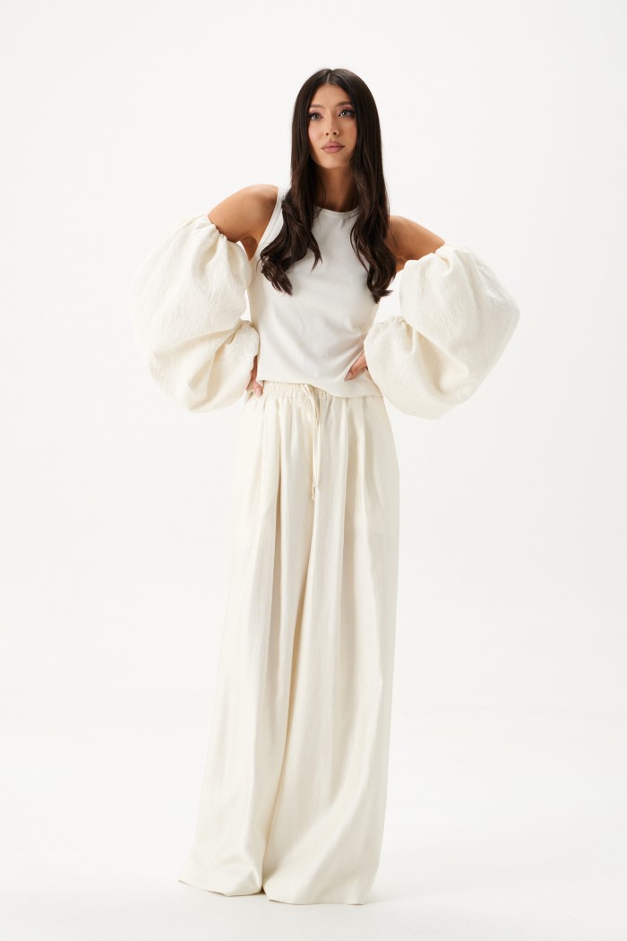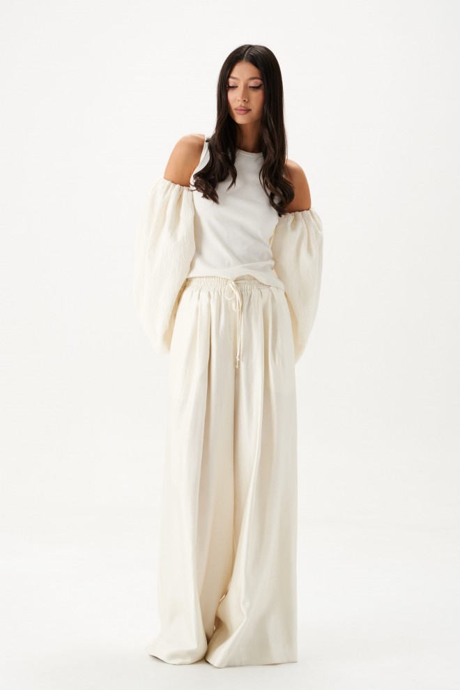 Брюки прямого свободного кроя. Выполнены из текстильной ткани молочного цвета с мягким блеском. Пояс на резинке, с кулиской. По переду имитация застёжки. Наклонные карманы. Длина 110 см (с учётом пояса)