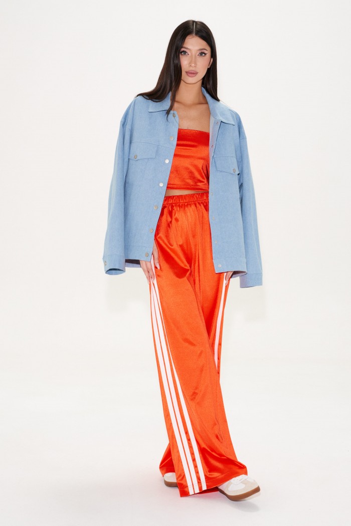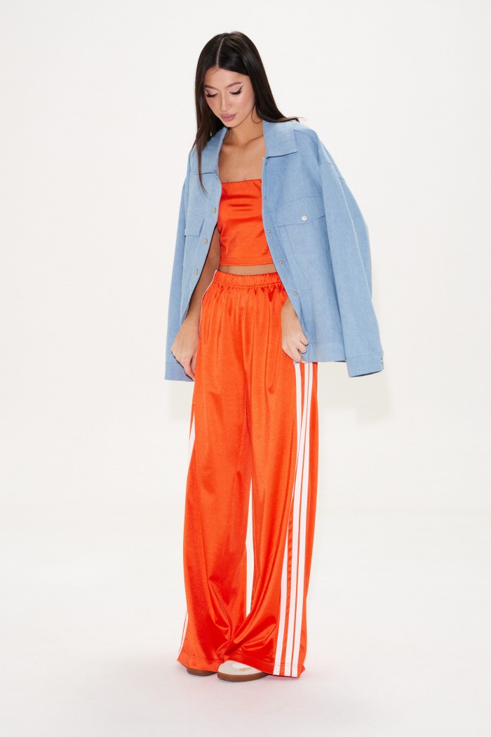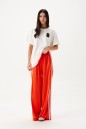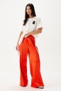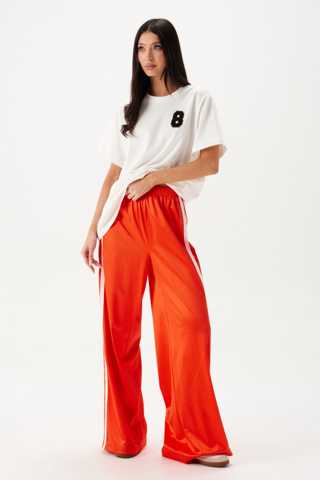 Брюки прямого кроя,выполнены из трикотажа ярко-оранжевого цвета. Характеристика: прямой крой, пояс на резинке, по боковому шву по всей длине 3 вертикальных лампаса, длина брюк по боковому шву 107 см.