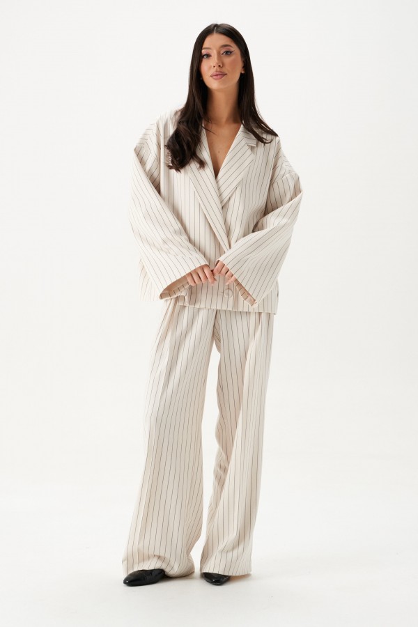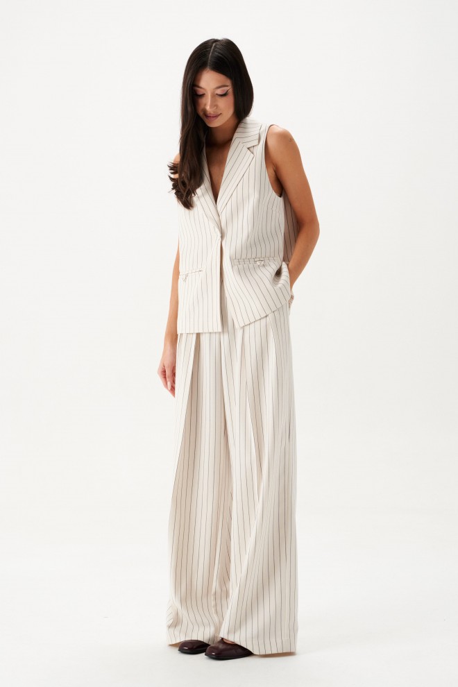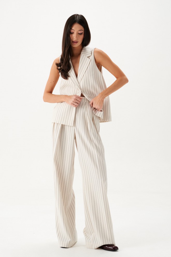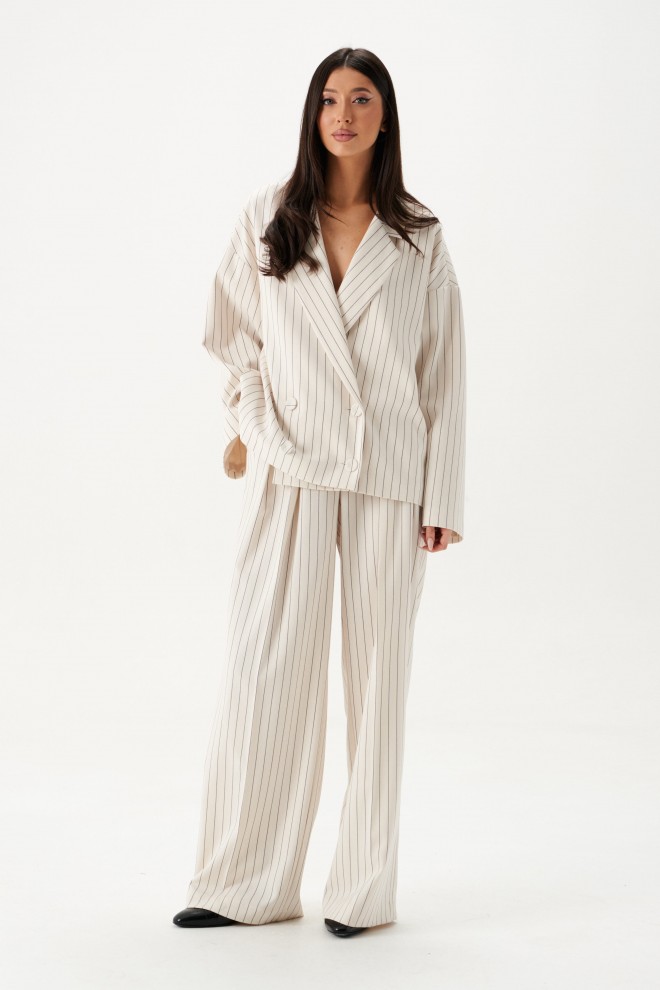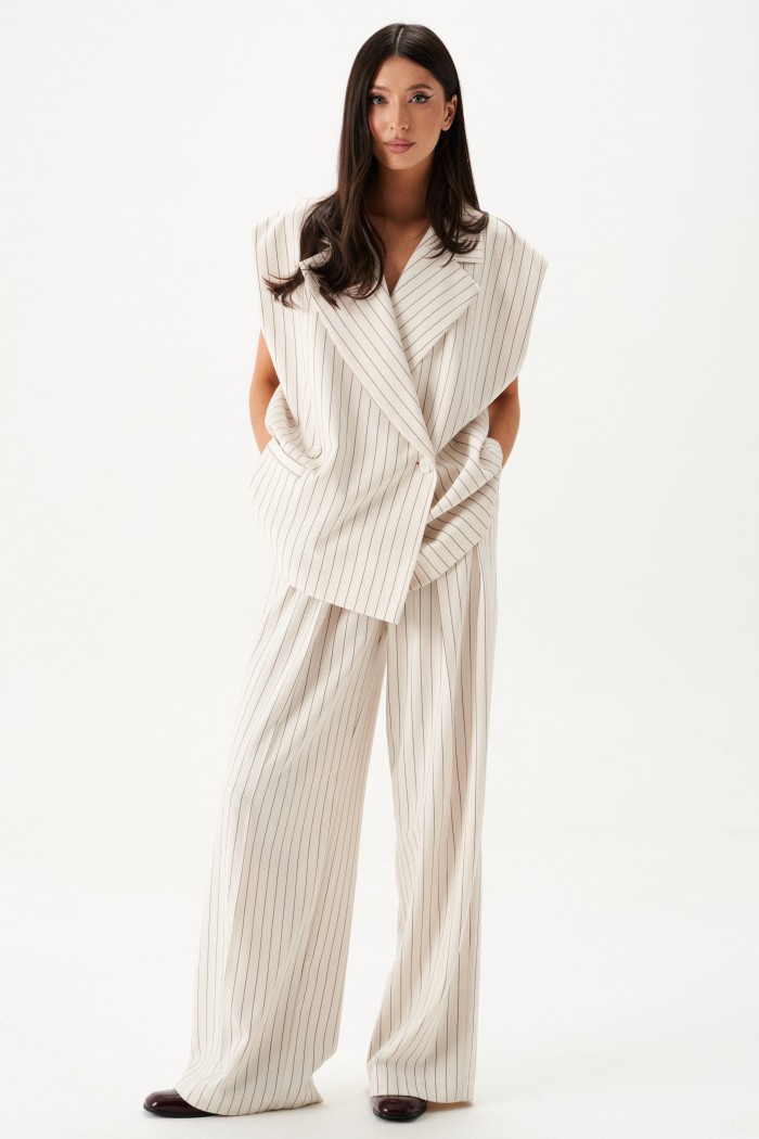 Брюки прямого свободного кроя. Выполнены из костюмной ткани молочной цвета с тонкой полоской чёрного цвета. Пояс стабильный, застёжка - молния, пуговица. На поясе шлёвки. Наклонные карманы. От пояса по передней части складки. По передней и задней части изделия - заутюженные стрелки. Длина 113 см (с учётом пояса)