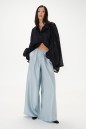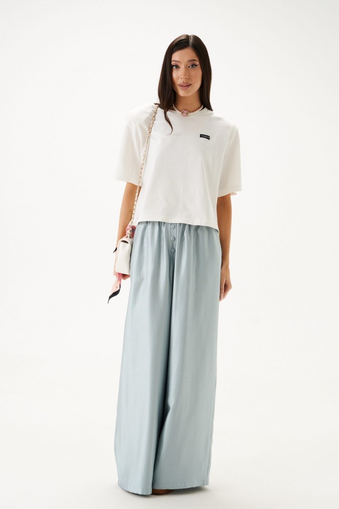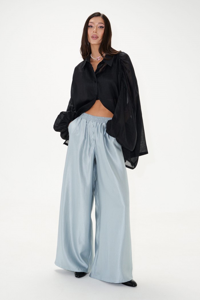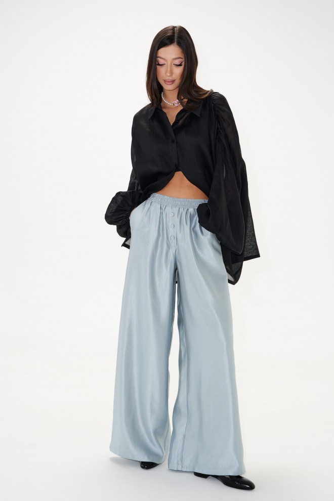 Брюки прямого свободного кроя. Выполнены из полотна небесно-перламутрового цвета с блеском . Пояс на резинке, в боковых швах карманы, иммитация застежки с пуговичками по переду. Длина по боковому шву 103 см.