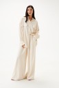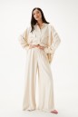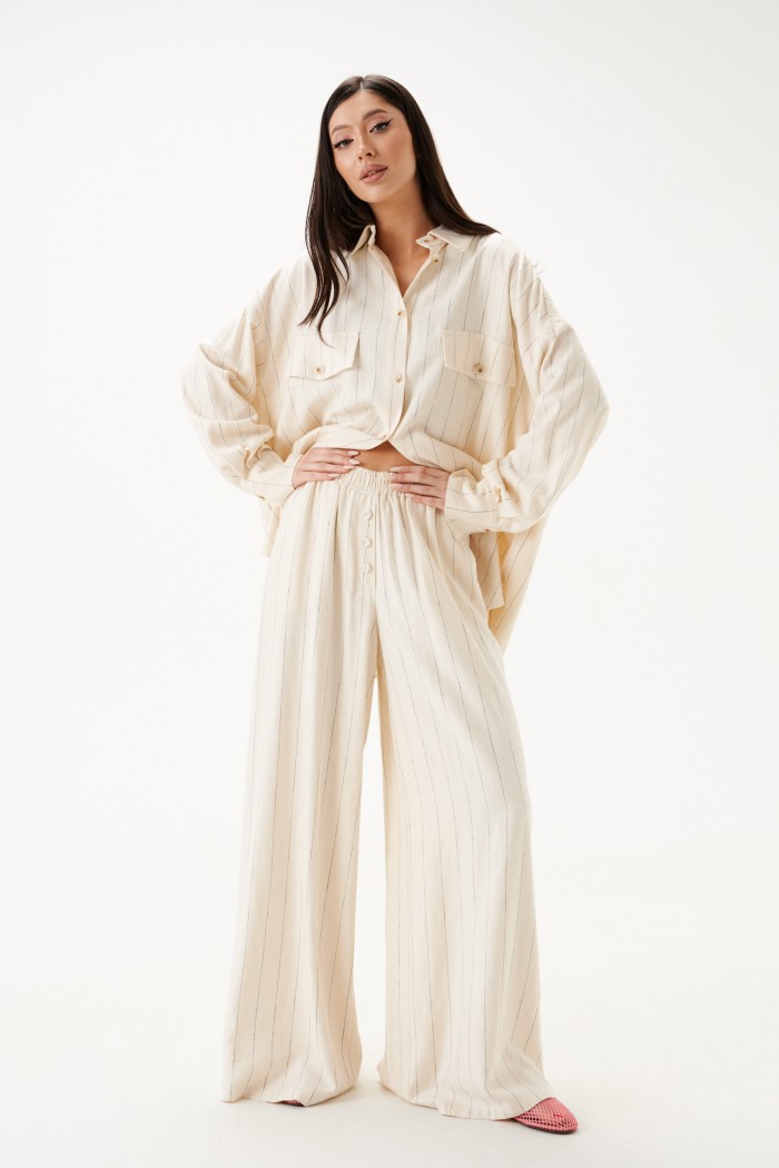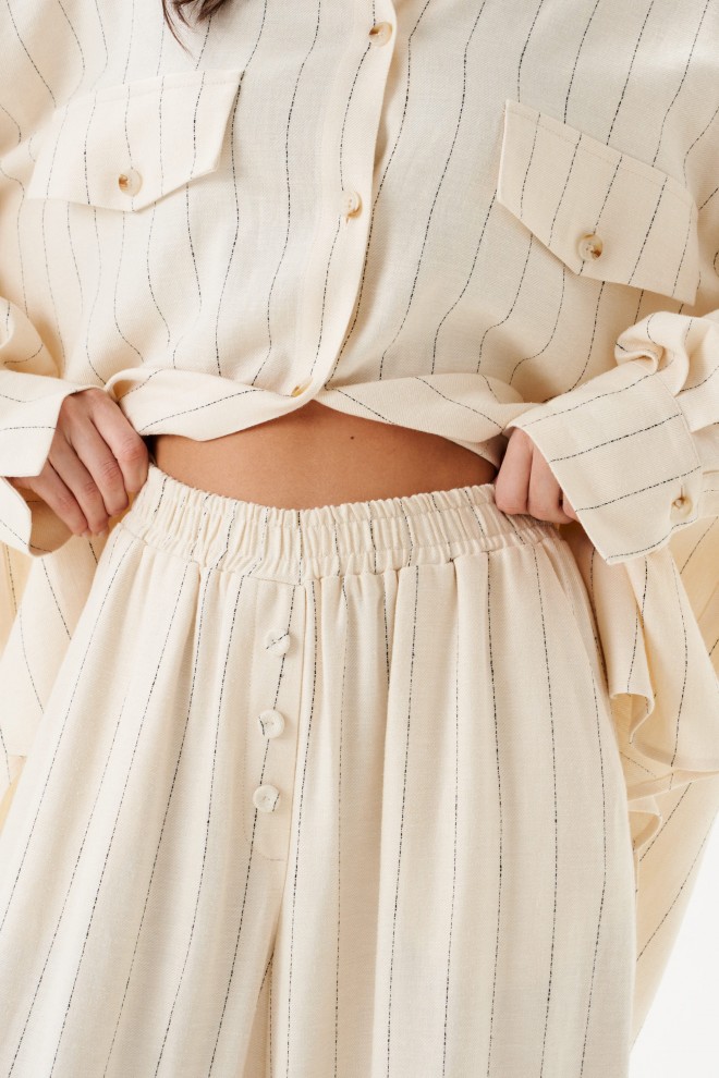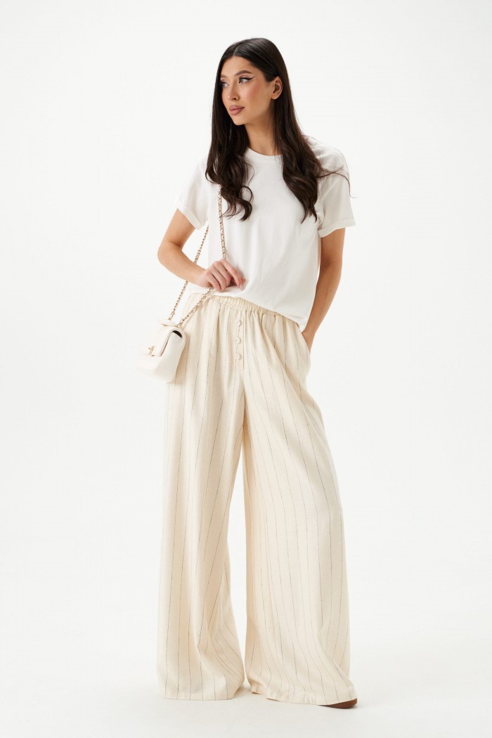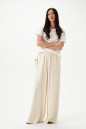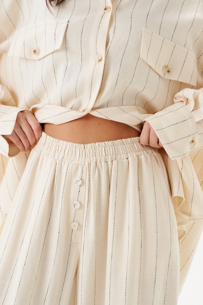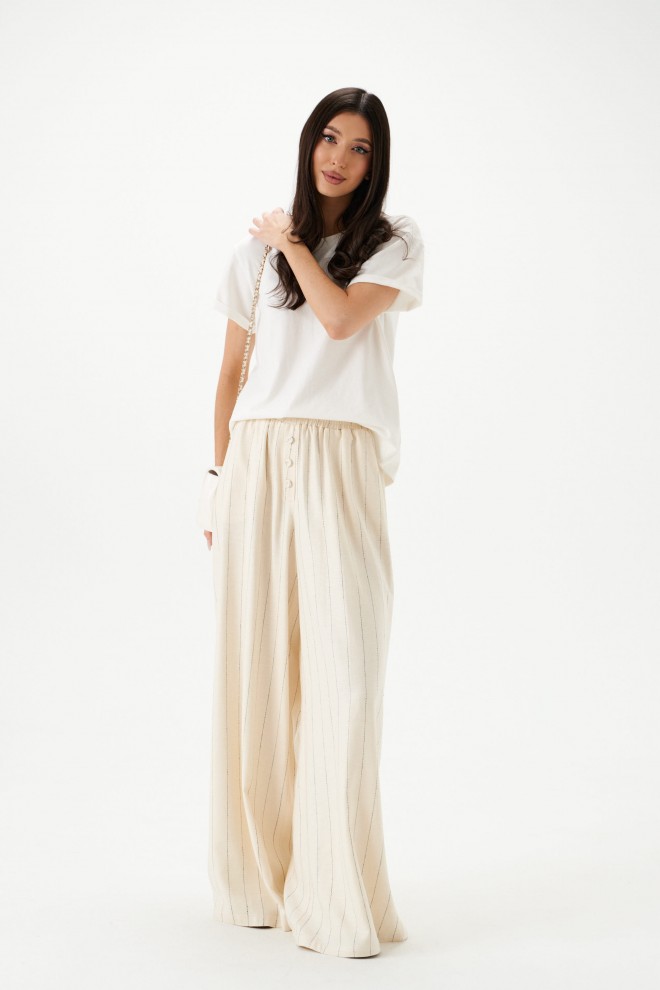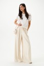 Брюки свободного кроя. Выполнены из льняной (смесовой ткани). В боковых швах карманы с отрезным бочком. Пояс на резинке. На Поясе имеются декоративные строчки. По переду имеется имитация застёжки. Длина 109 см