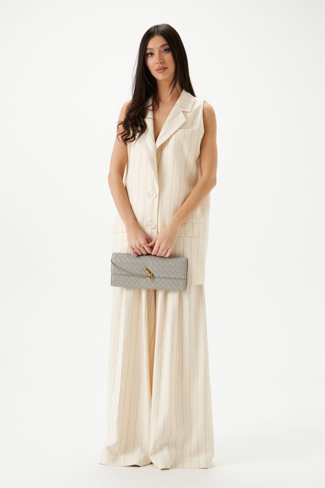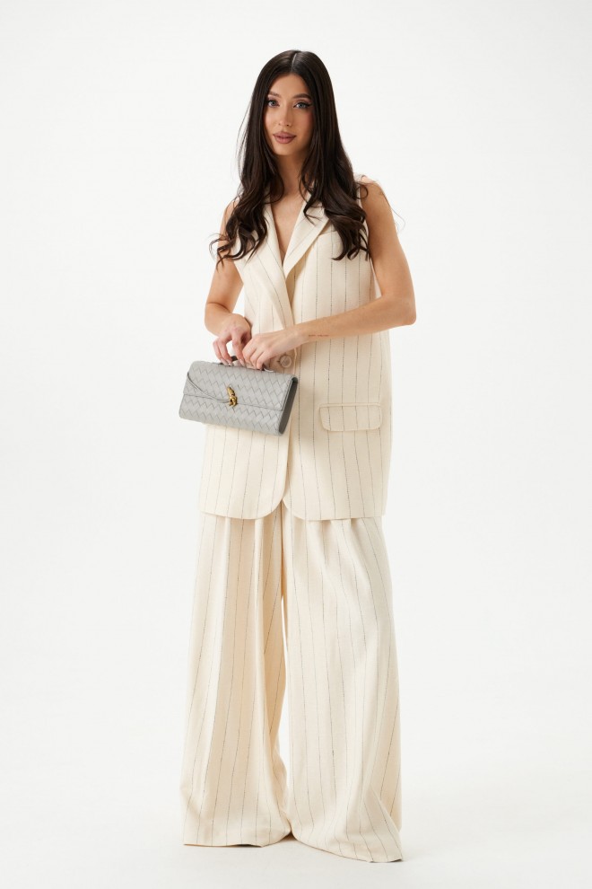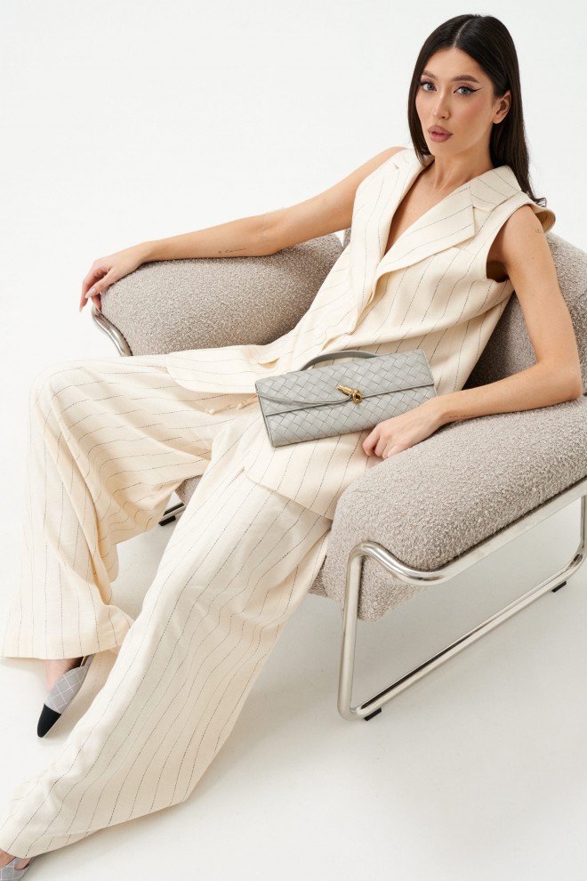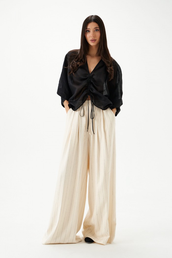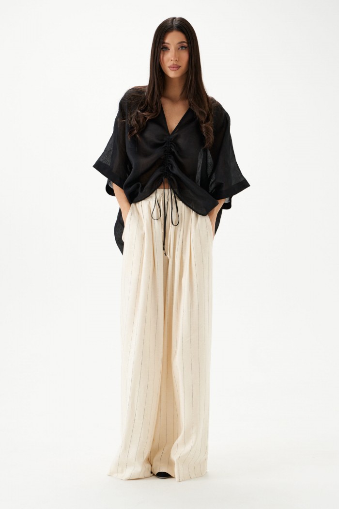 Брюки свободного кроя. Выполнены из льняной (смесовой) ткани. В боковых швах карманы с отрезным бочком. Пояс на резинке. На поясе имеются декоративные строчки и шнур. По переду складки. Длина 112 см
