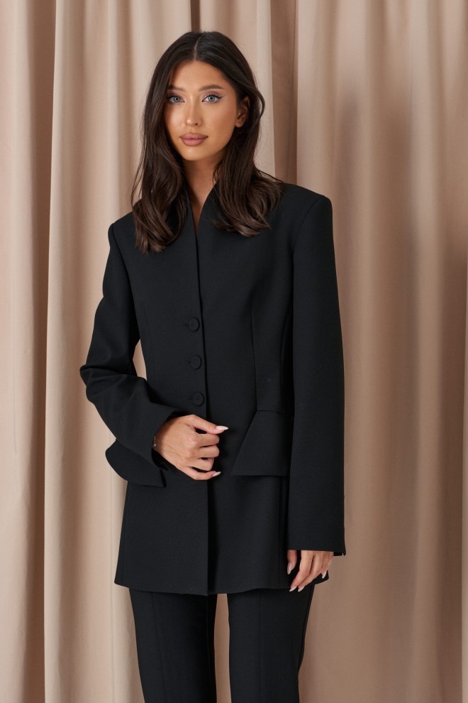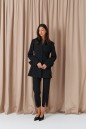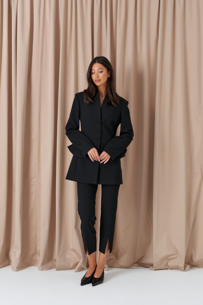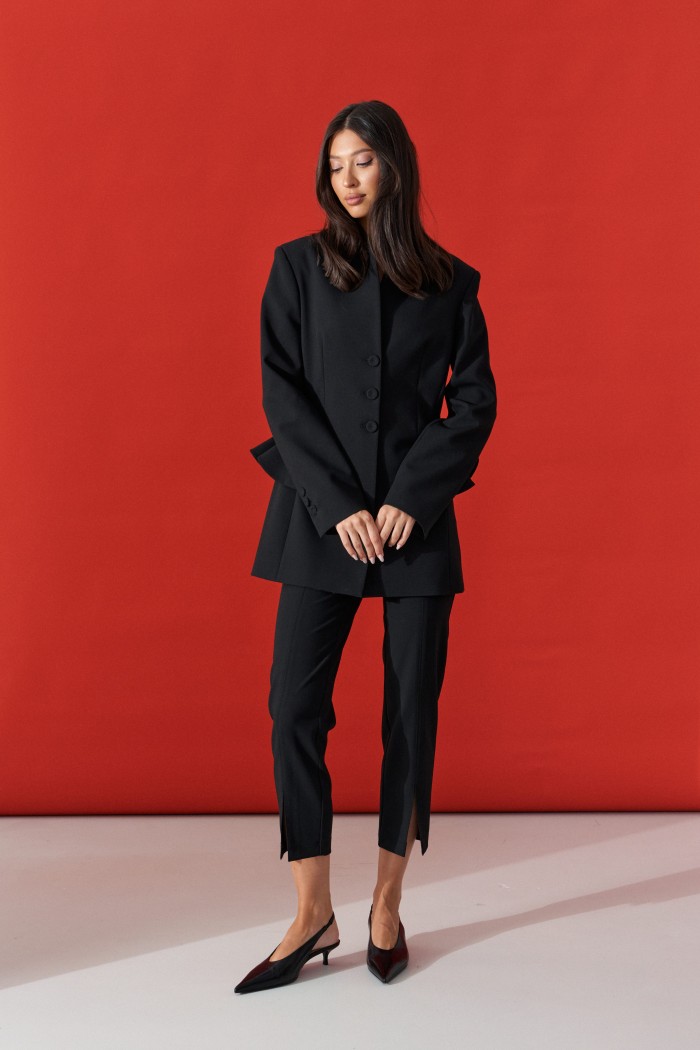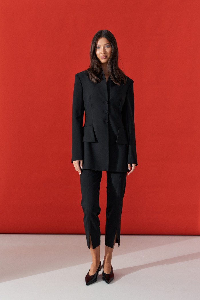 Брюки прилегающего кроя, выполнены из костюмной ткани черног цвета. Характеристики: прилегающий крой, пояс стабильный застежка на молнии с пуговицей, на задней части изделия имитация карманов, передней и задней части брюк застроченные стрелки, в стрелках передней части разрезы. Длина по боковому шву 95см.