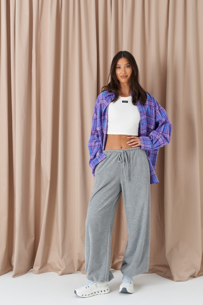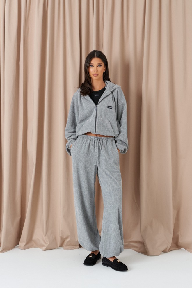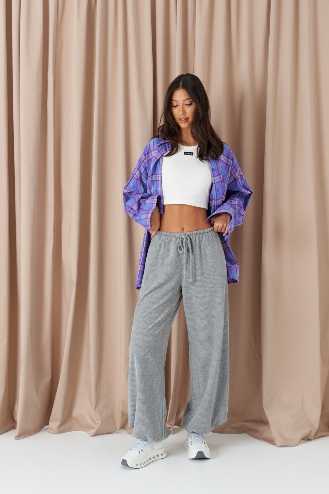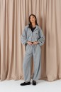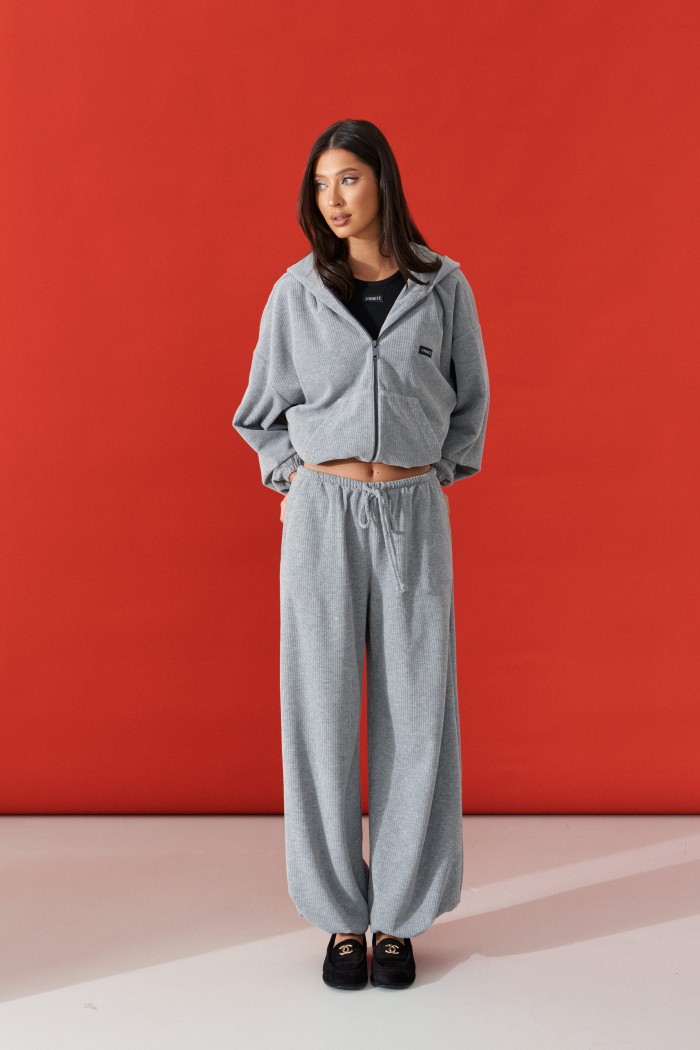 Брюки-джоггеры. Выполнены из полотна штуркса серого цвета. Характеристики: прямой крой, пояс на резинке с кулиской, в боковых швах карманы, накладные карманы на задней части брюк, штанина внизу на резинке с фиксатором. Длина по боковому шву 106 см.