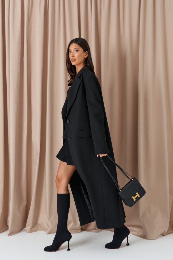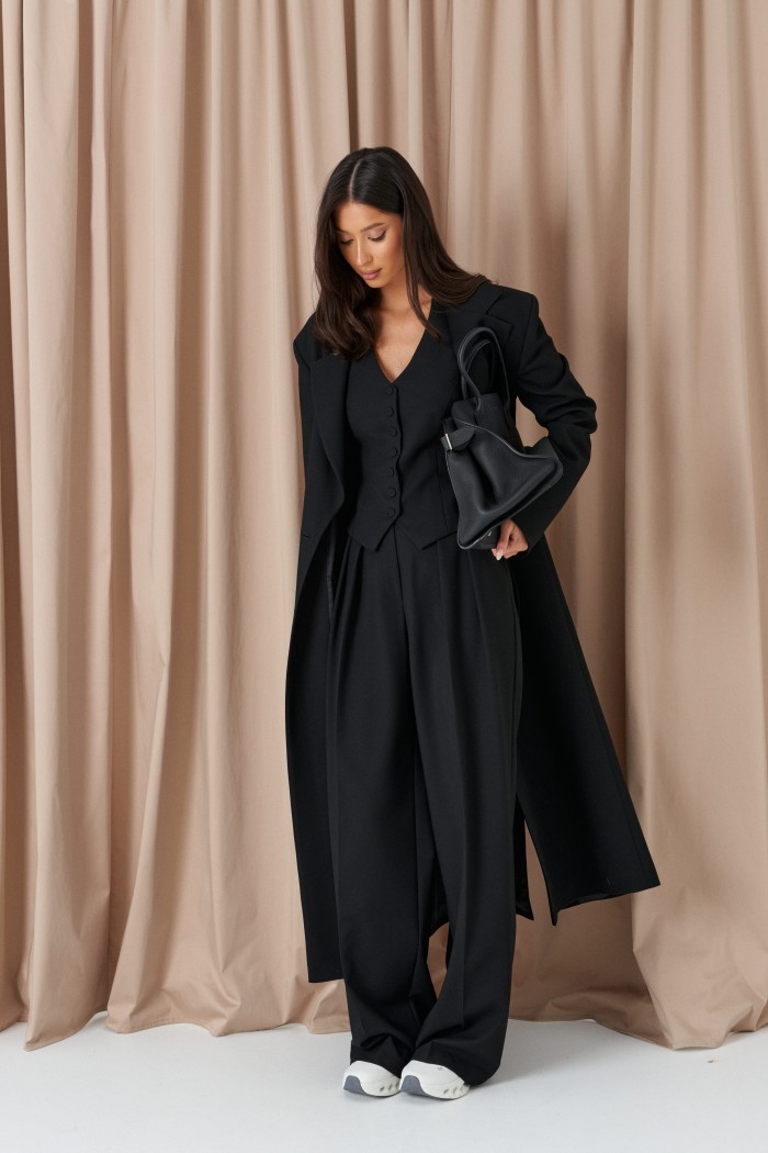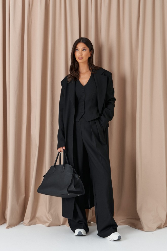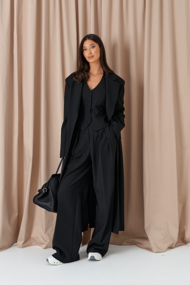 Брюки прямого кроя выполнены из костюмной ткани черного цвета. Характеристики: прямой крой, эластичная брендированная резинка, боковые карманы, на передних и задних частях брюк застрочены складки и заутюжены стрелки. Длина брюк 114 см.